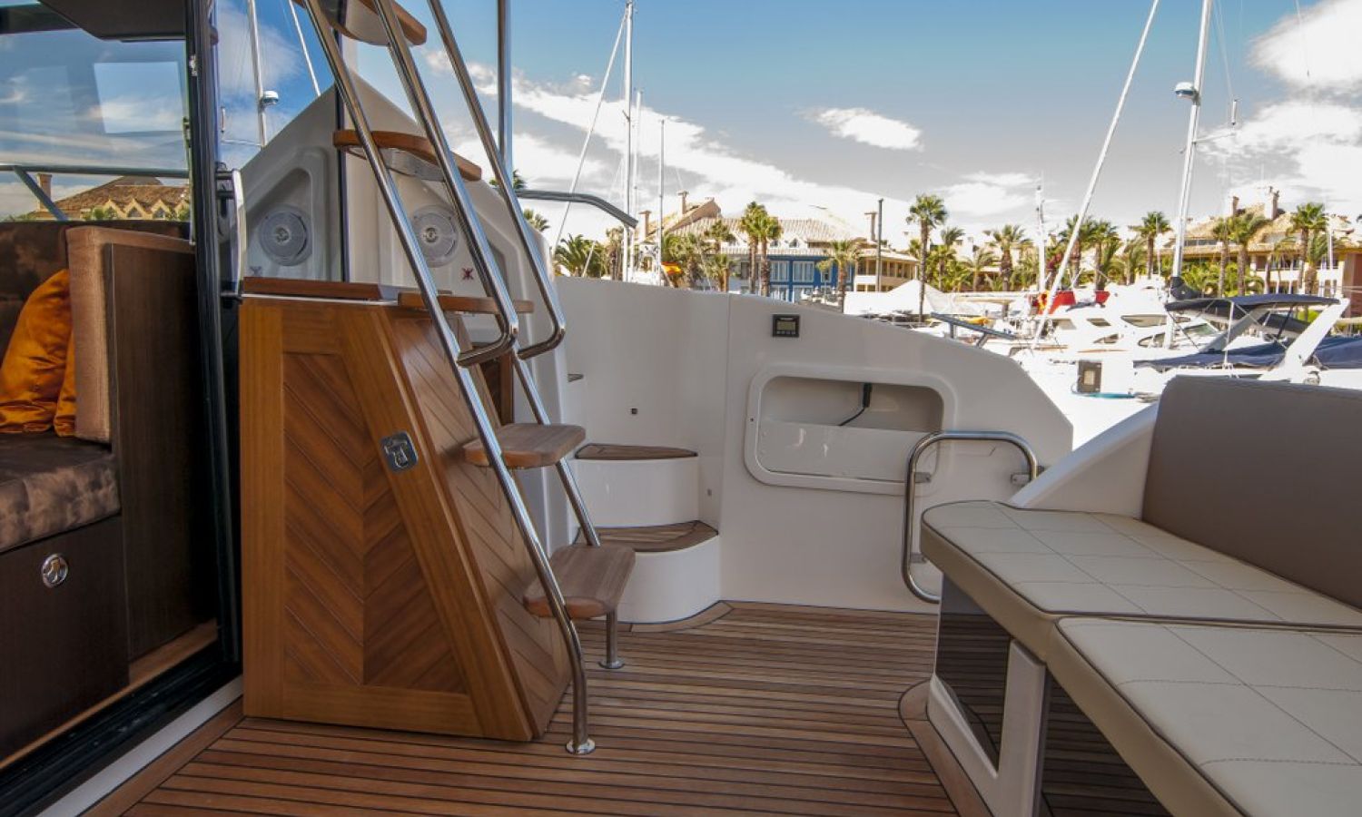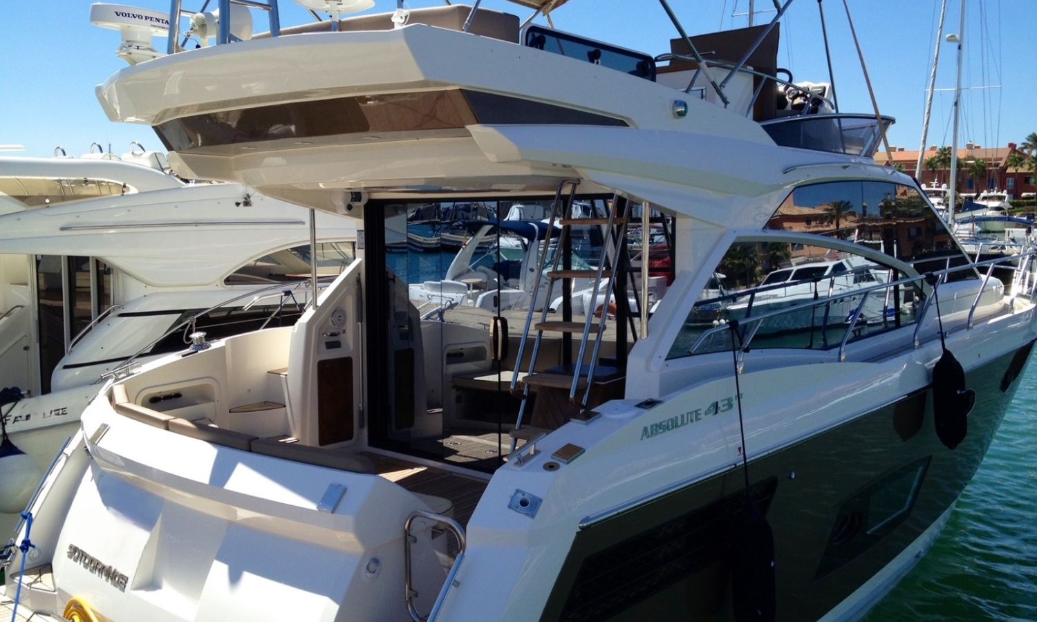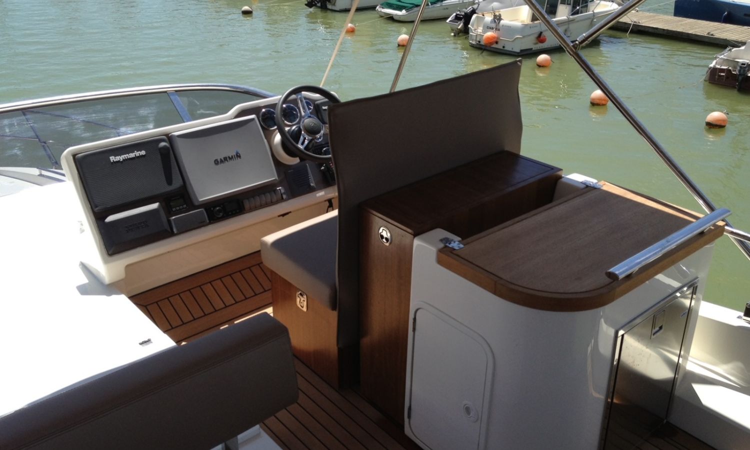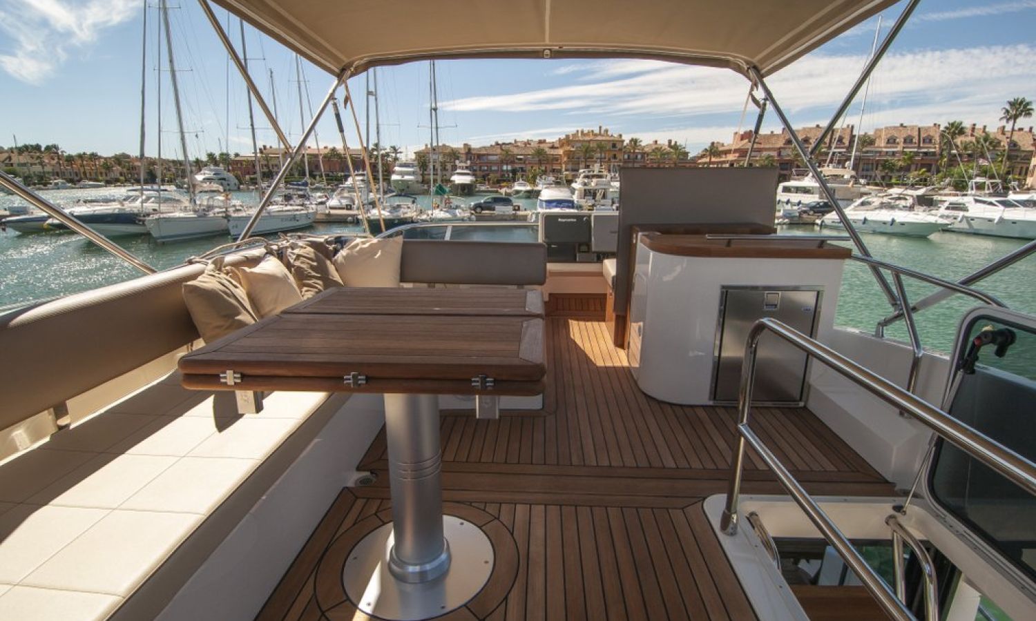 Bimini top on flybridge - Stern shower - 3 cabins - Stern platform with bathing ladder - Stern sundeck - Teak - Bow cushions - Offshore poer 220 V. - Baterry charger - Generator - Air conditioning - Underwater lights - Cockpit table - Wet-bar with sink - Cockpit refrigerator - Kitchen - Freezer - Glass ceramic - Microwawe - Dishwasher - Gps/Plotter/Deepfinder - VHF - Autopilot - Audio equipment - Living room Tv - Radar - Electric anchor winch with chain and anchor - 2 Electric marine WC with waste water tank - Antifouling. Giroscopic stabilizerBoat description