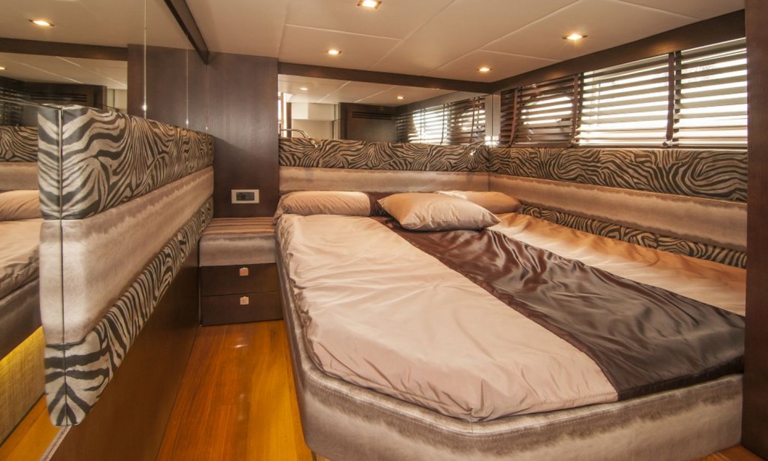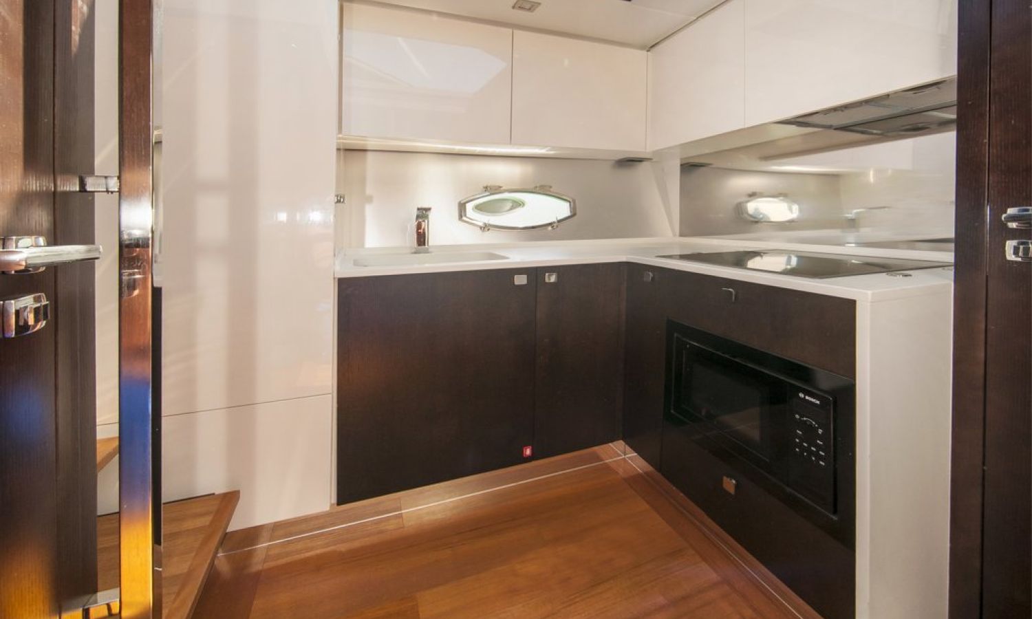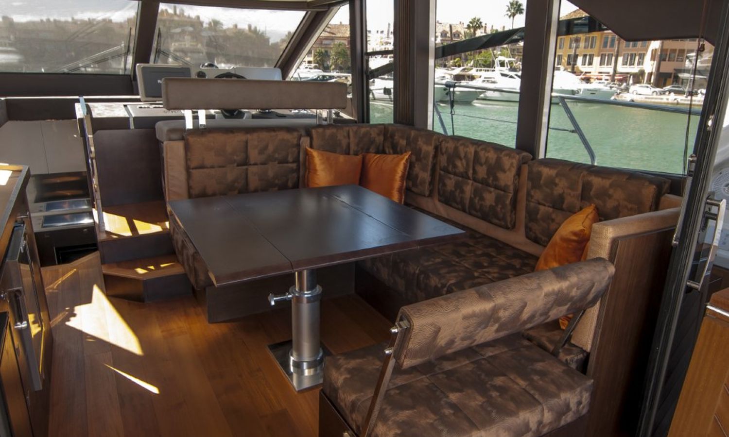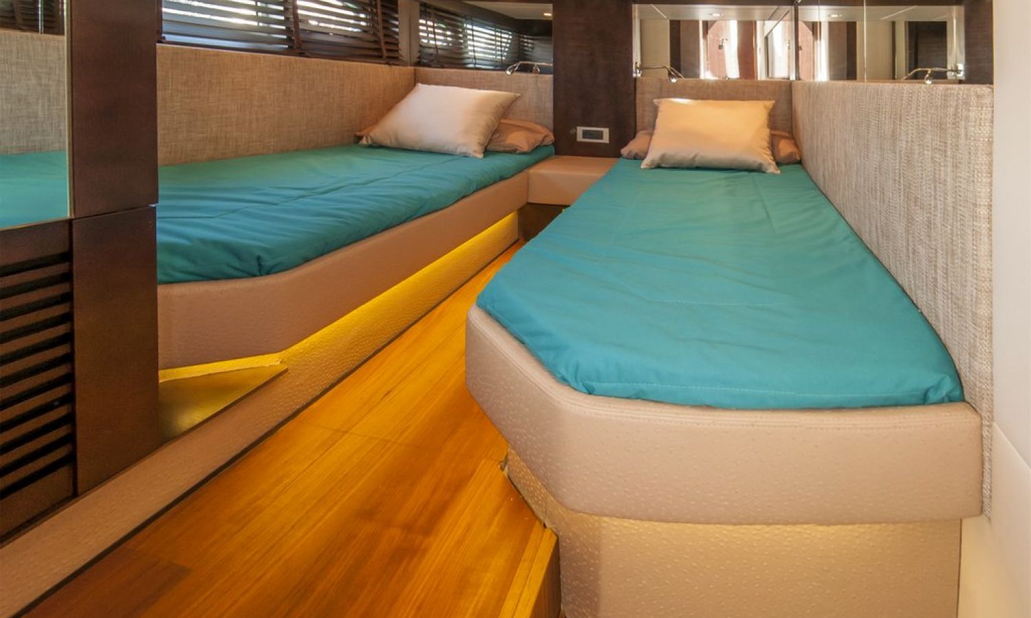 Bimini top on flybridge - Stern shower - 3 cabins - Stern platform with bathing ladder - Stern sundeck - Teak - Bow cushions - Offshore poer 220 V. - Baterry charger - Generator - Air conditioning - Underwater lights - Cockpit table - Wet-bar with sink - Cockpit refrigerator - Kitchen - Freezer - Glass ceramic - Microwawe - Dishwasher - Gps/Plotter/Deepfinder - VHF - Autopilot - Audio equipment - Living room Tv - Radar - Electric anchor winch with chain and anchor - 2 Electric marine WC with waste water tank - Antifouling. Giroscopic stabilizerBoat description