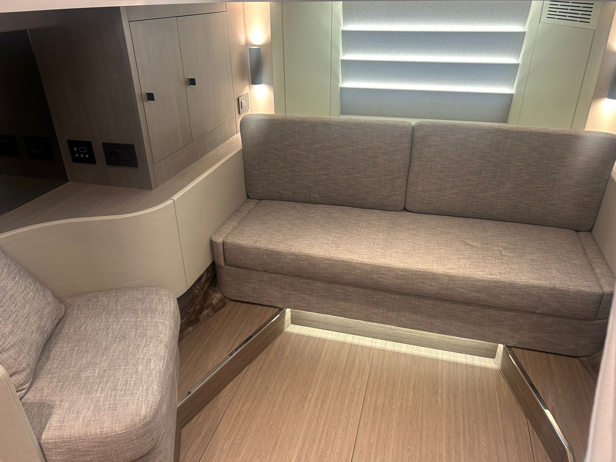 Waste water tank - Air conditioning 16.000 BTU in cabins with heat pump - Set covers (for dashboard, pilot seat, stern sofa, cockpit table, cockpit wetbar and stern sun cushion) - Automatic List Control + Coordinated Turn Control - Bow thruster - Cockpit refrigerator - Generator 8 kW - Electric cockpit grill - Ice-maker - Aft lowering bulkwarks right and left - Black microperforated privacy screen with white logo A 46 Luxury Tender - Hydraulic gangway - Autopilot - Up/down hydraulic stern platform - 2 Plotter screens 16" - Teak laid cockpit and teak on aft lowering bulkwarks - Solid teak coverings on lateral stringers - Electric sunshade - T-Top - VHF - CE Certificate - Exterior upholstery (alternative colour to standard one) - T-Top lacquered - Hull, platform and complete deck lacquered - Pre-disposition for bow bimini top - Preparation, launch and delivery with sea trial - Transport shipyard to Costa Brava.Boat description