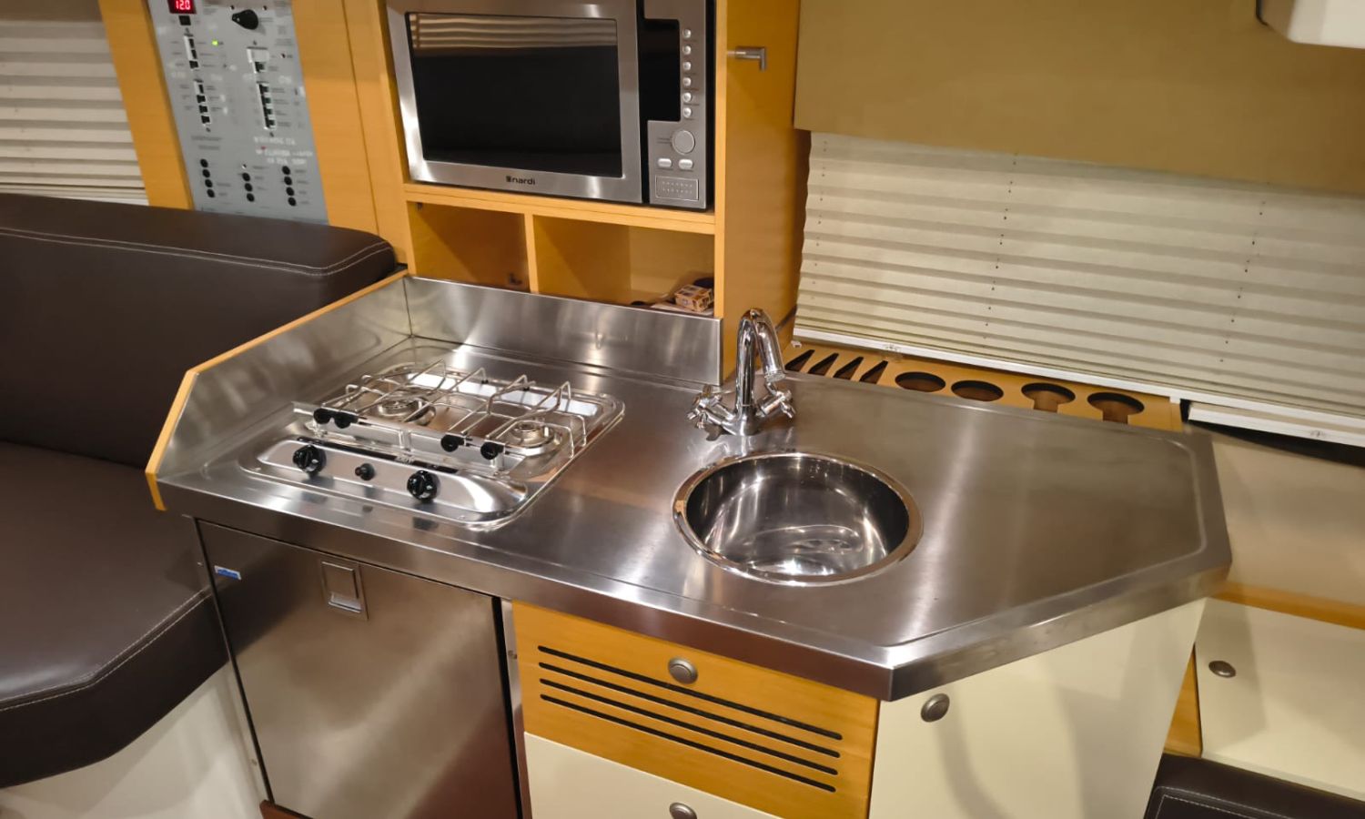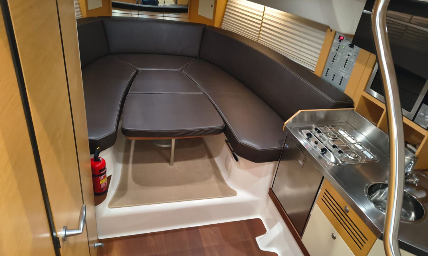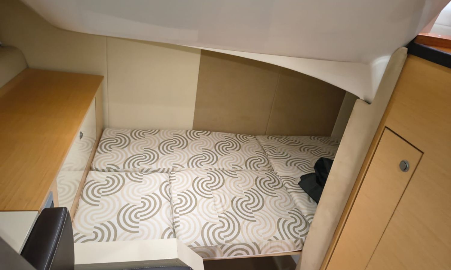 Electric windlass - Trim tabs - Bimini - Bow suncushions - Refrigerator 12 V in cockpit - Refrigerator 12 V in cabin - Transom shower - 220 V offshore power - Battery charger - Cabin table convertible into bed - Electric WC - Separate shower from bathroom - Gas stove - Microwave oven - Bow thruster - Electronic controls - GPS/Plotter/Depth finder - VHF - Audio equipment - Electric cockpit table - TV - AntifoulingBoat description