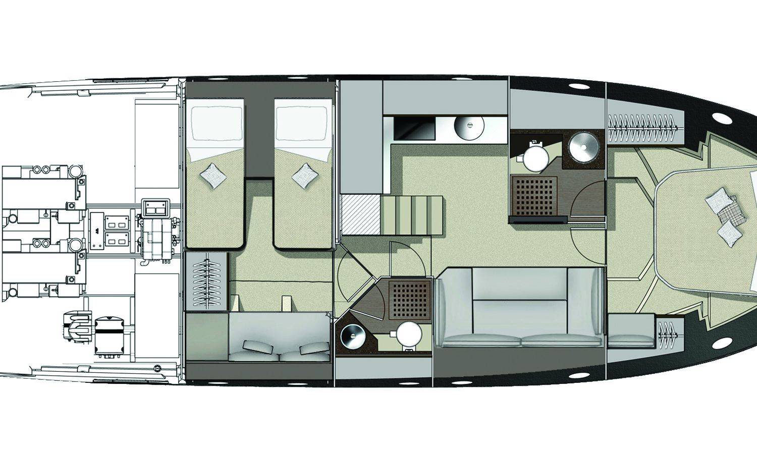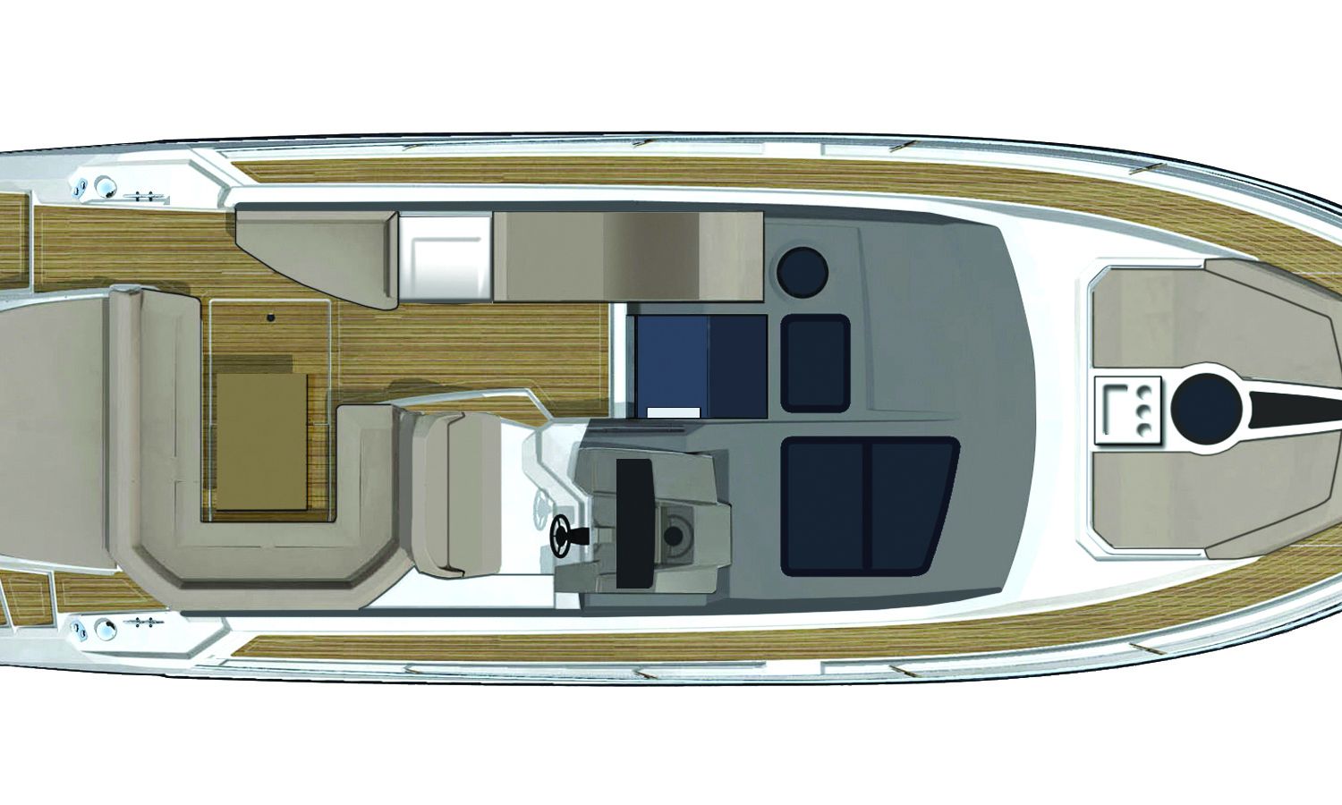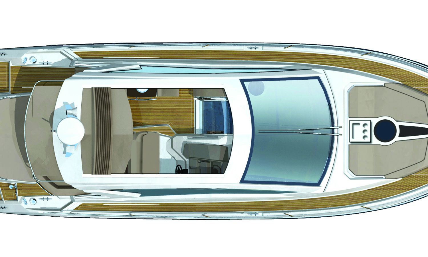Boat with hard top and slidind canvas roof. The large on-board spaces, including 2 cabins, 2 bathrooms, a kitchen and a lounge give an immediate feeling of comfort and wellbeing. The cockpit is exceptionally roomy, with 2 seats on the helm, a couch to portside, a large sofa, a wet bar and a big stern sun bed concealing the garage for the tender.