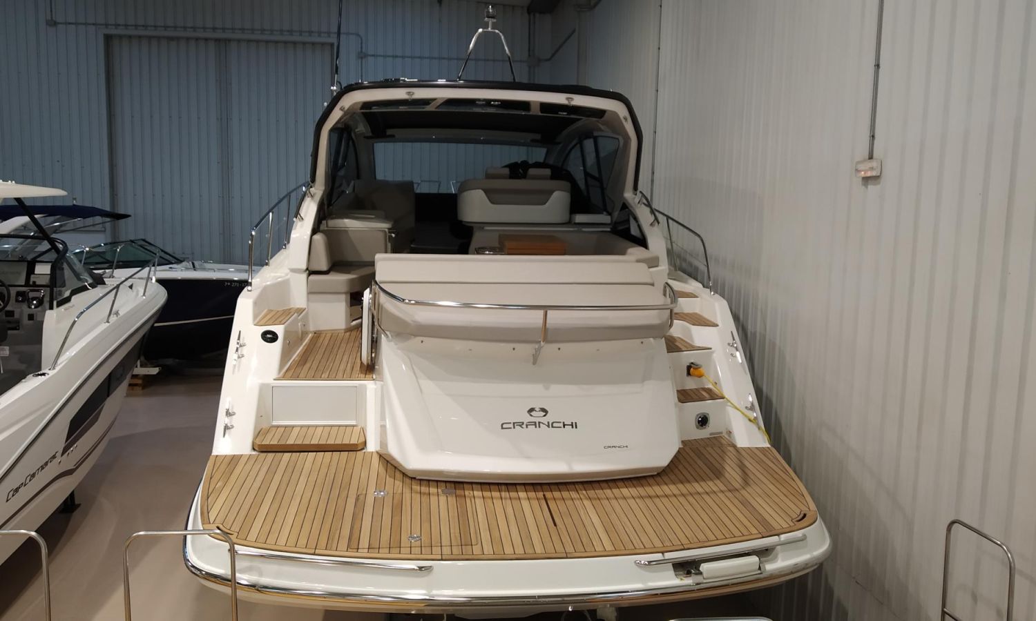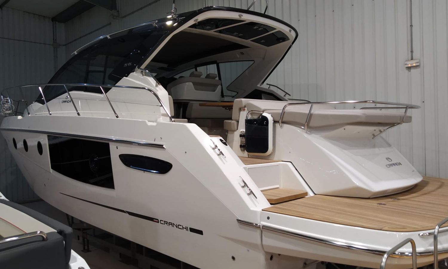 Boat in stock. Immediate delivery. Model M 44 HT from the prestigious Cranchi shipyard. Total length of 13.82 m and white hull color with black hard top. It has a great interior habitability, a large hydraulic bathing platform and a garage.PAL-Nº 8003