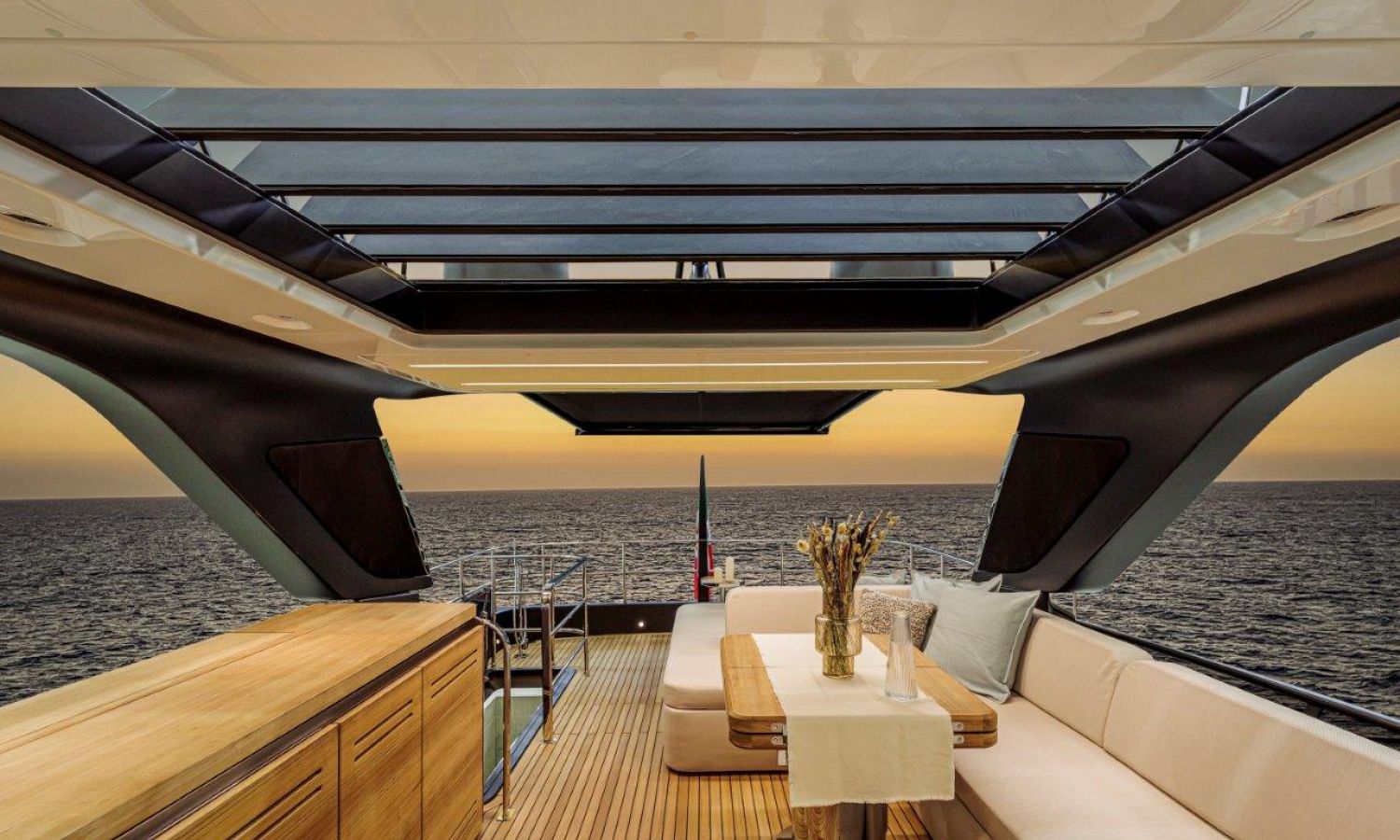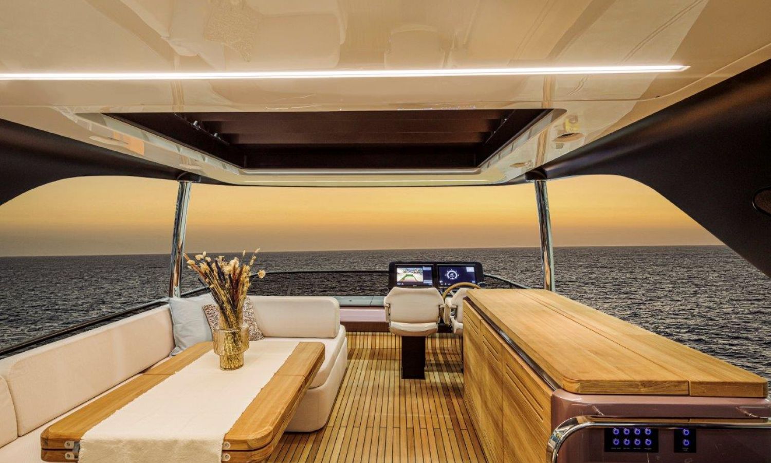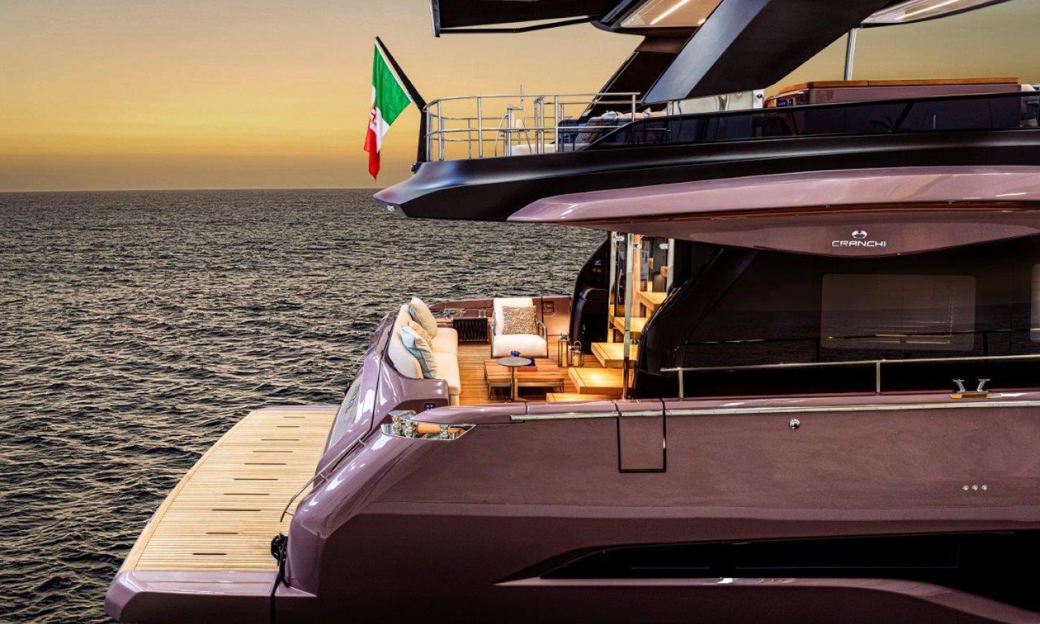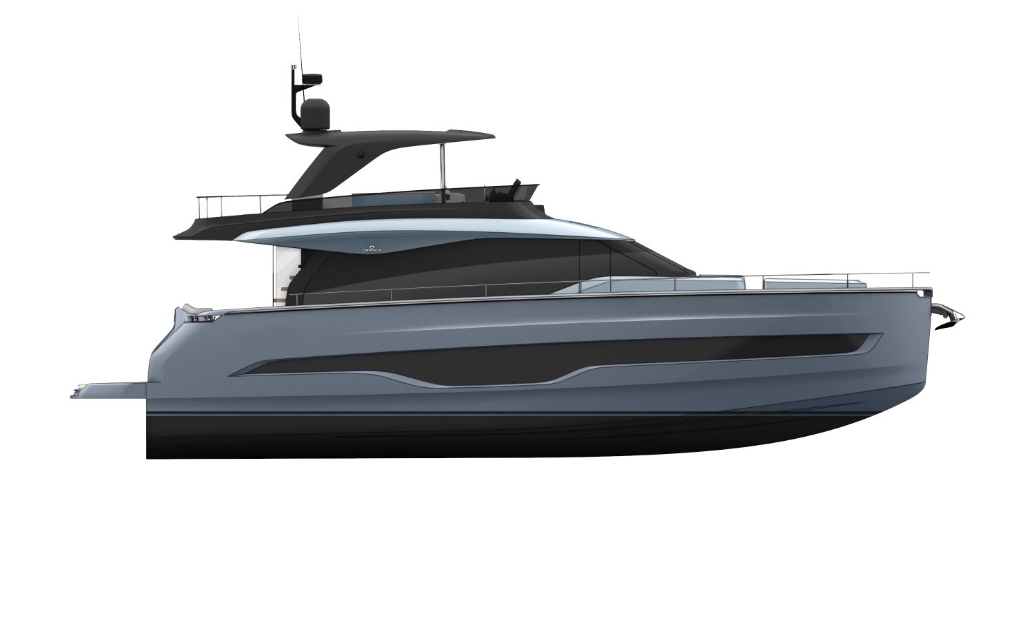 Impossible to look away from right from the very first glance: the design element which first affirms the character of the Sessantadue 62 is its vertical bow. A line which connects the sea and sky, and which accentuates the naval allure of the yacht. The waterline is lengthened, with the vessel benefiting in terms of audacity and muscularity, but without suffering in terms of harmony of forms, which is a distinctive element of Cranchi Yachts’ new flybridge models.
