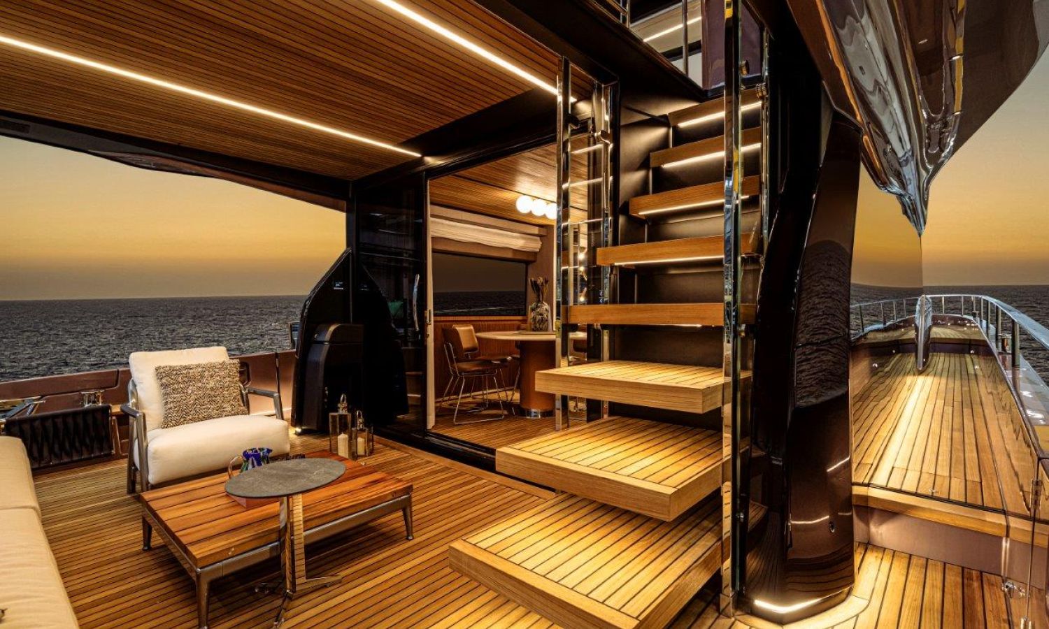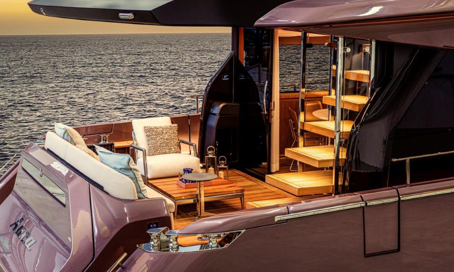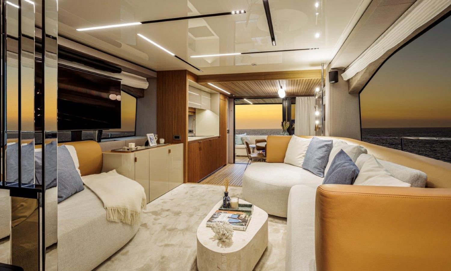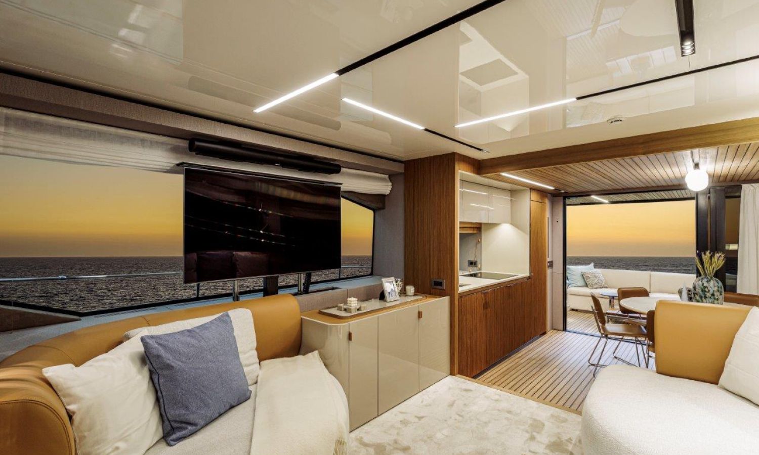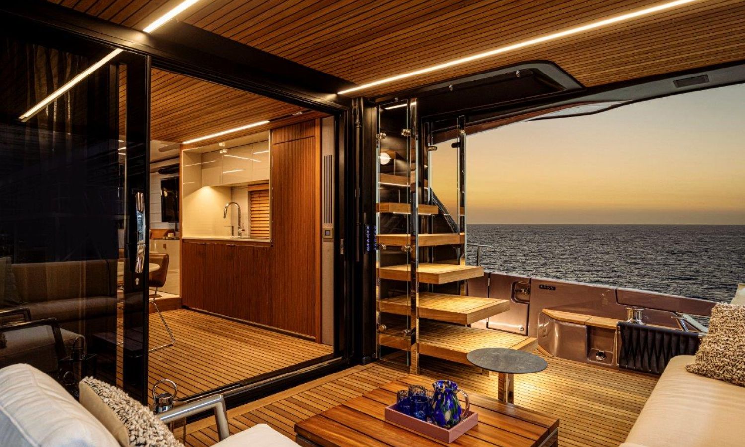 Impossible to look away from right from the very first glance: the design element which first affirms the character of the Sessantadue 62 is its vertical bow. A line which connects the sea and sky, and which accentuates the naval allure of the yacht. The waterline is lengthened, with the vessel benefiting in terms of audacity and muscularity, but without suffering in terms of harmony of forms, which is a distinctive element of Cranchi Yachts’ new flybridge models.