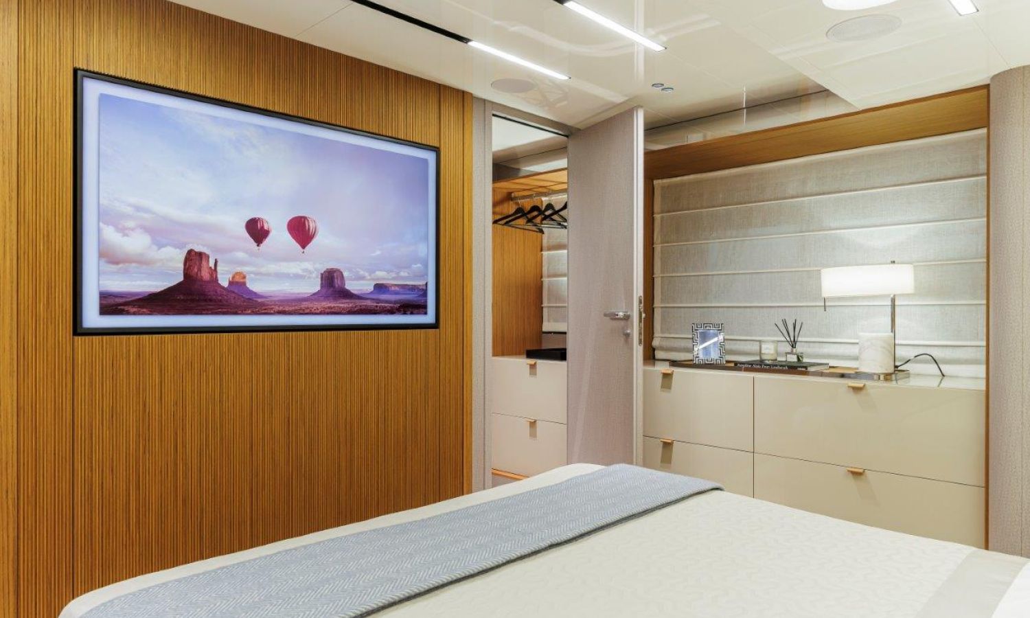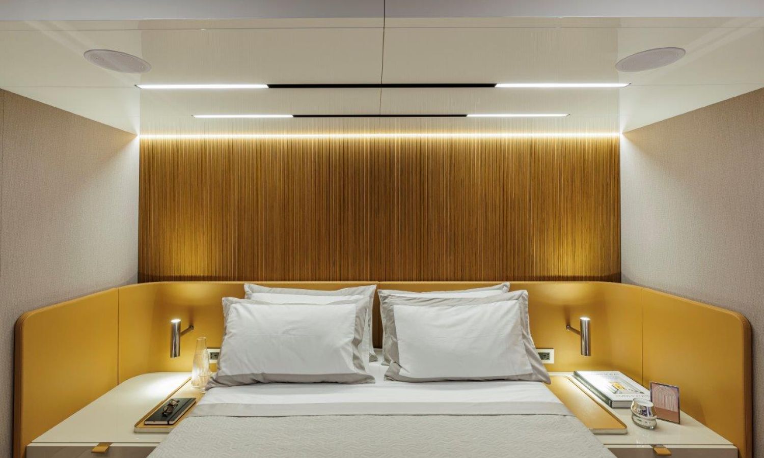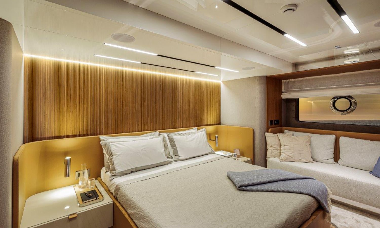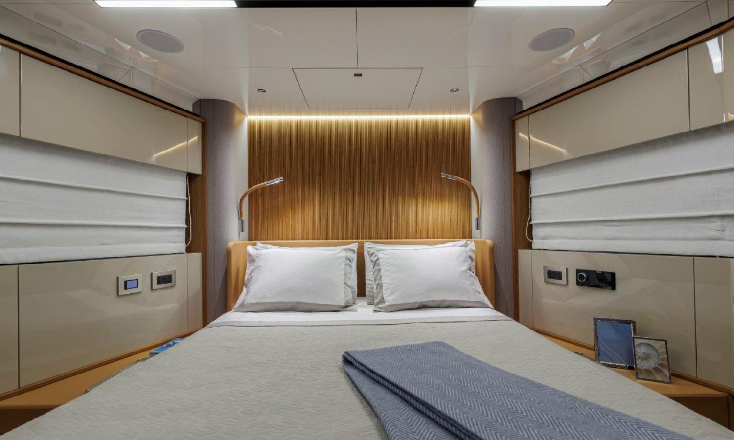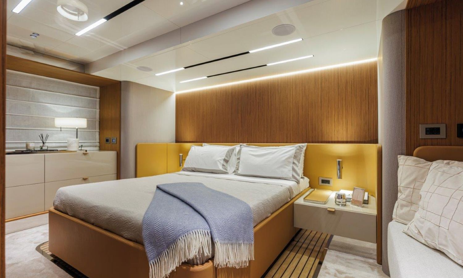 Impossible to look away from right from the very first glance: the design element which first affirms the character of the Sessantadue 62 is its vertical bow. A line which connects the sea and sky, and which accentuates the naval allure of the yacht. The waterline is lengthened, with the vessel benefiting in terms of audacity and muscularity, but without suffering in terms of harmony of forms, which is a distinctive element of Cranchi Yachts’ new flybridge models.