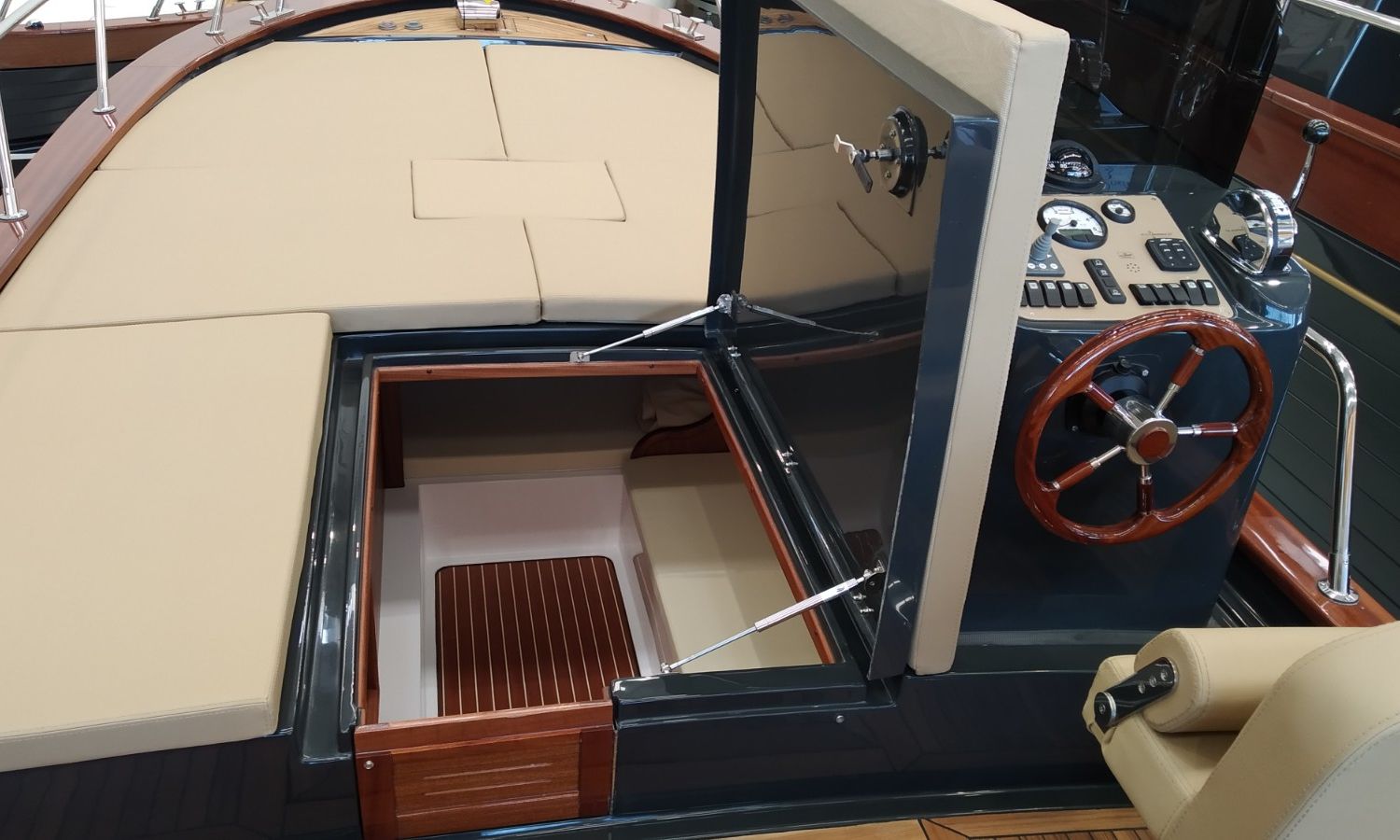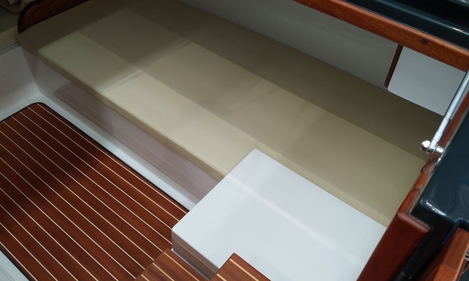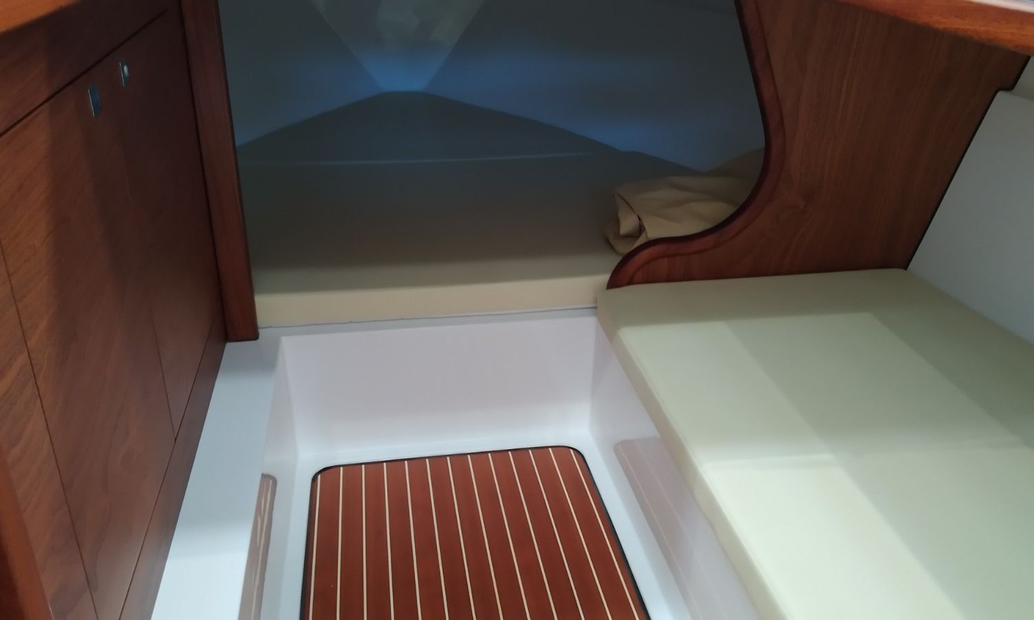 Console with instruments and pilot seat - Console cover - Exterior sun cushions - Interior cushions - Stern shower with water tank - Bow thruster - Electric anchor winch with chain and anchor - Stern platform in fiberglass and teak with bathing ladder - Teak laid cockpit (only stern) - Bimini top - Microperforated bimini top upgrade (1 back and 1 side) - Preparation, launch and delivery with sea trial - Transport shipyard to Costa Brava.Boat description