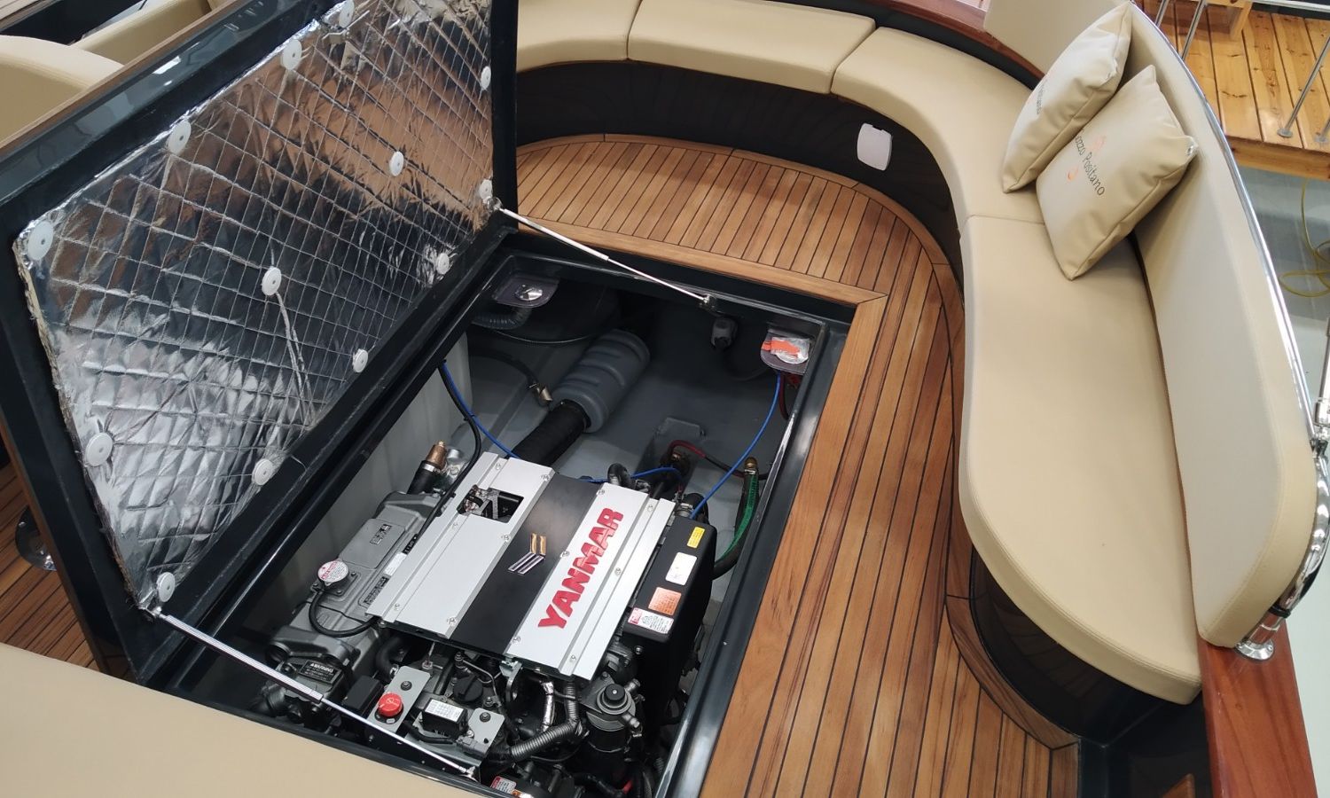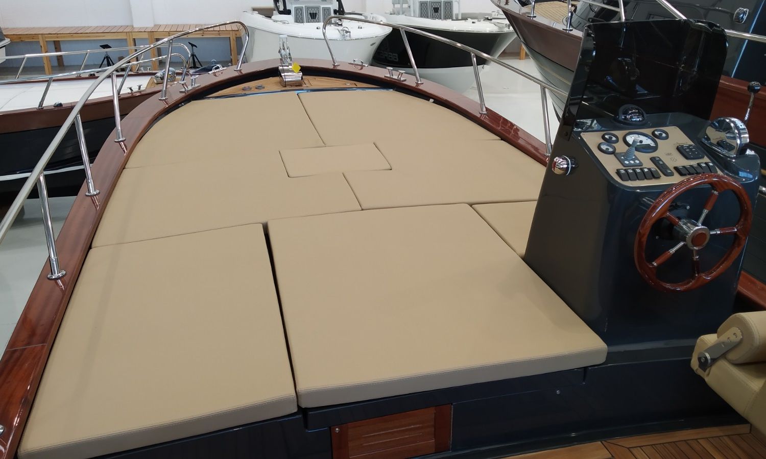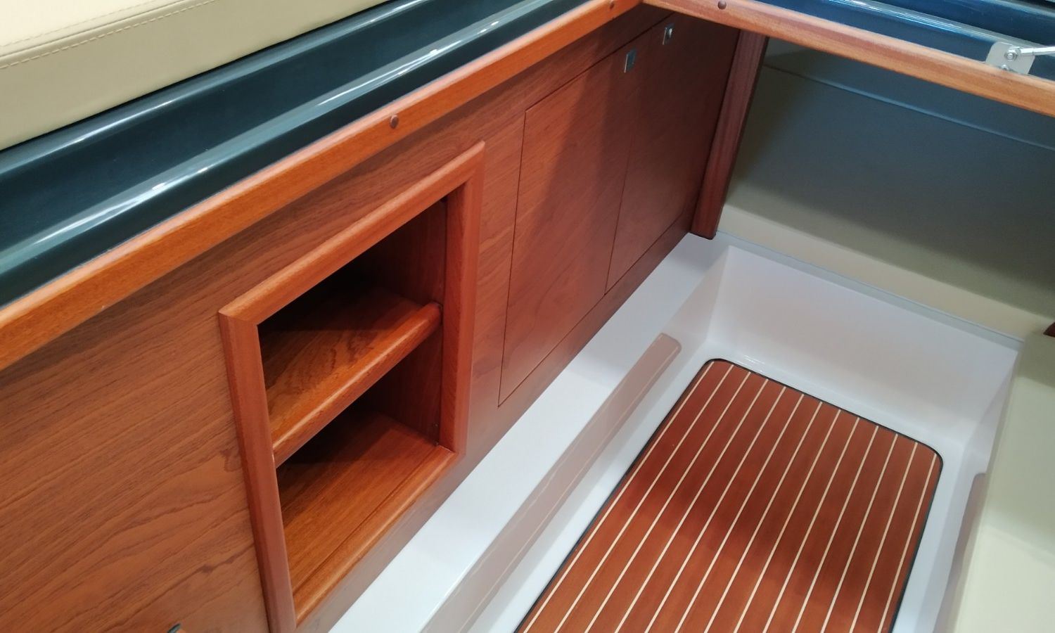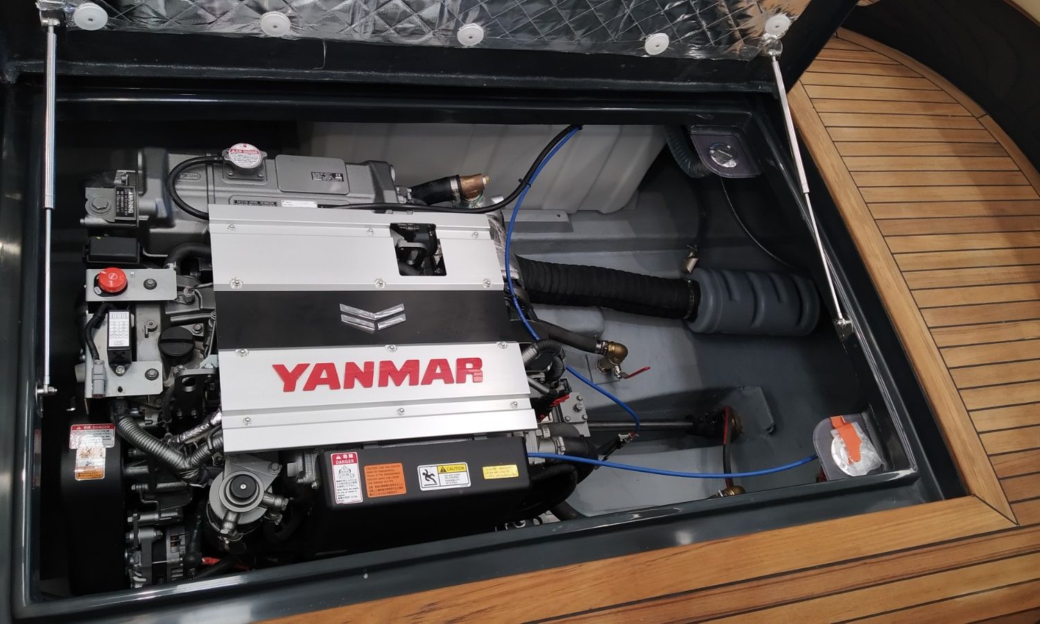 Console with instruments and pilot seat - Console cover - Exterior sun cushions - Interior cushions - Stern shower with water tank - Bow thruster - Electric anchor winch with chain and anchor - Stern platform in fiberglass and teak with bathing ladder - Teak laid cockpit (only stern) - Bimini top - Microperforated bimini top upgrade (1 back and 1 side) - Preparation, launch and delivery with sea trial - Transport shipyard to Costa Brava.Boat description