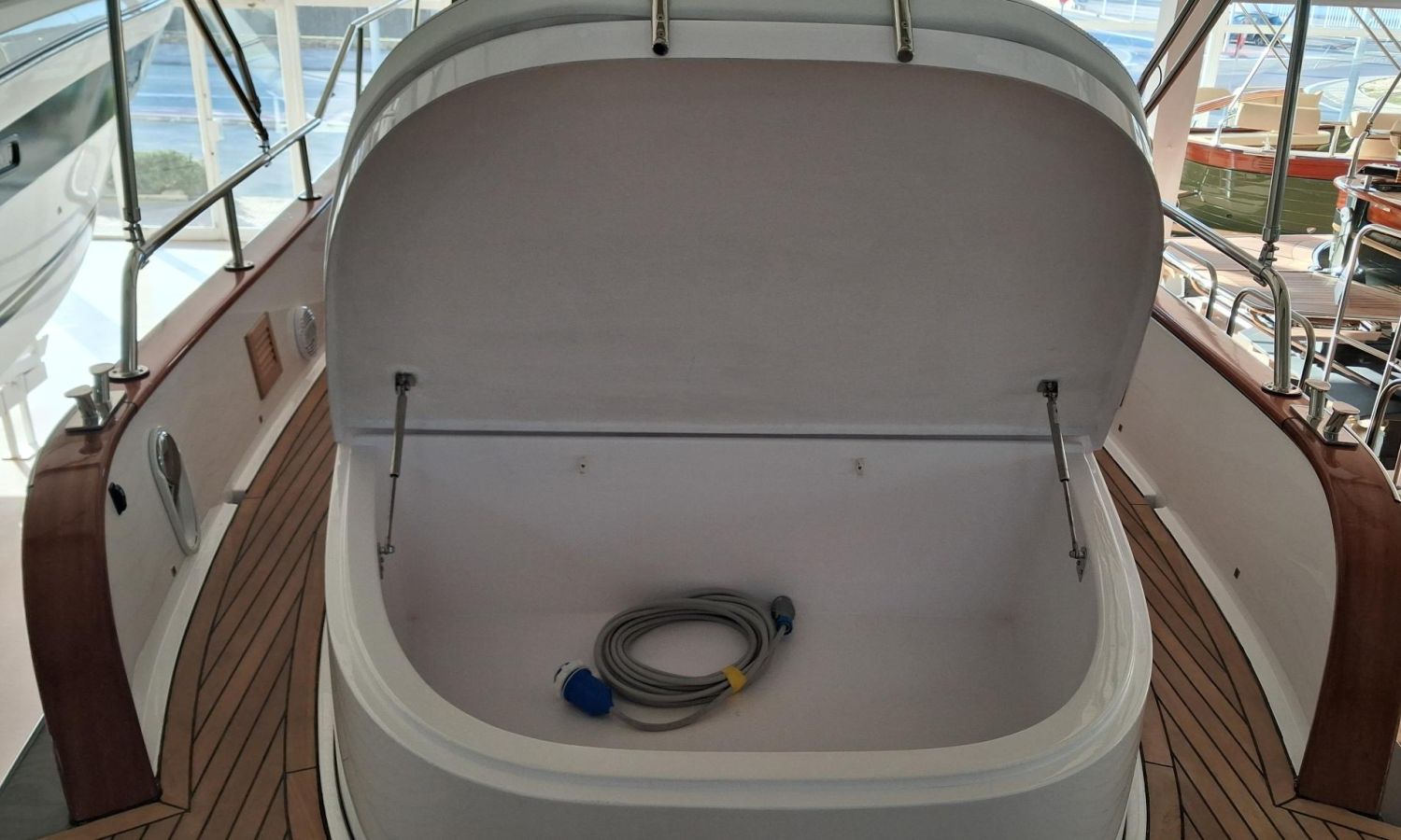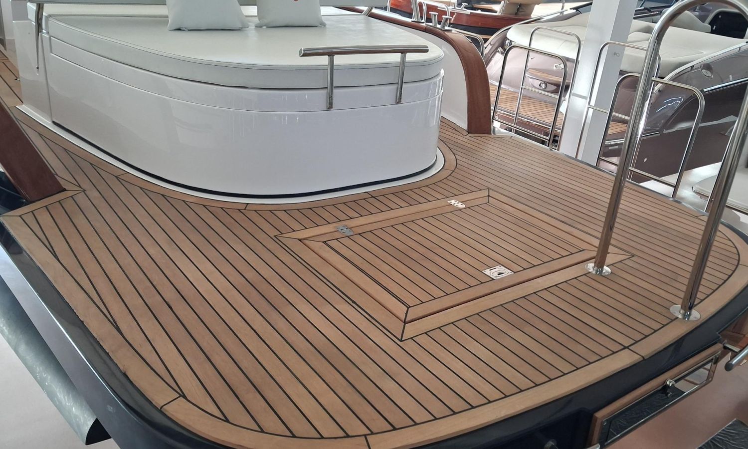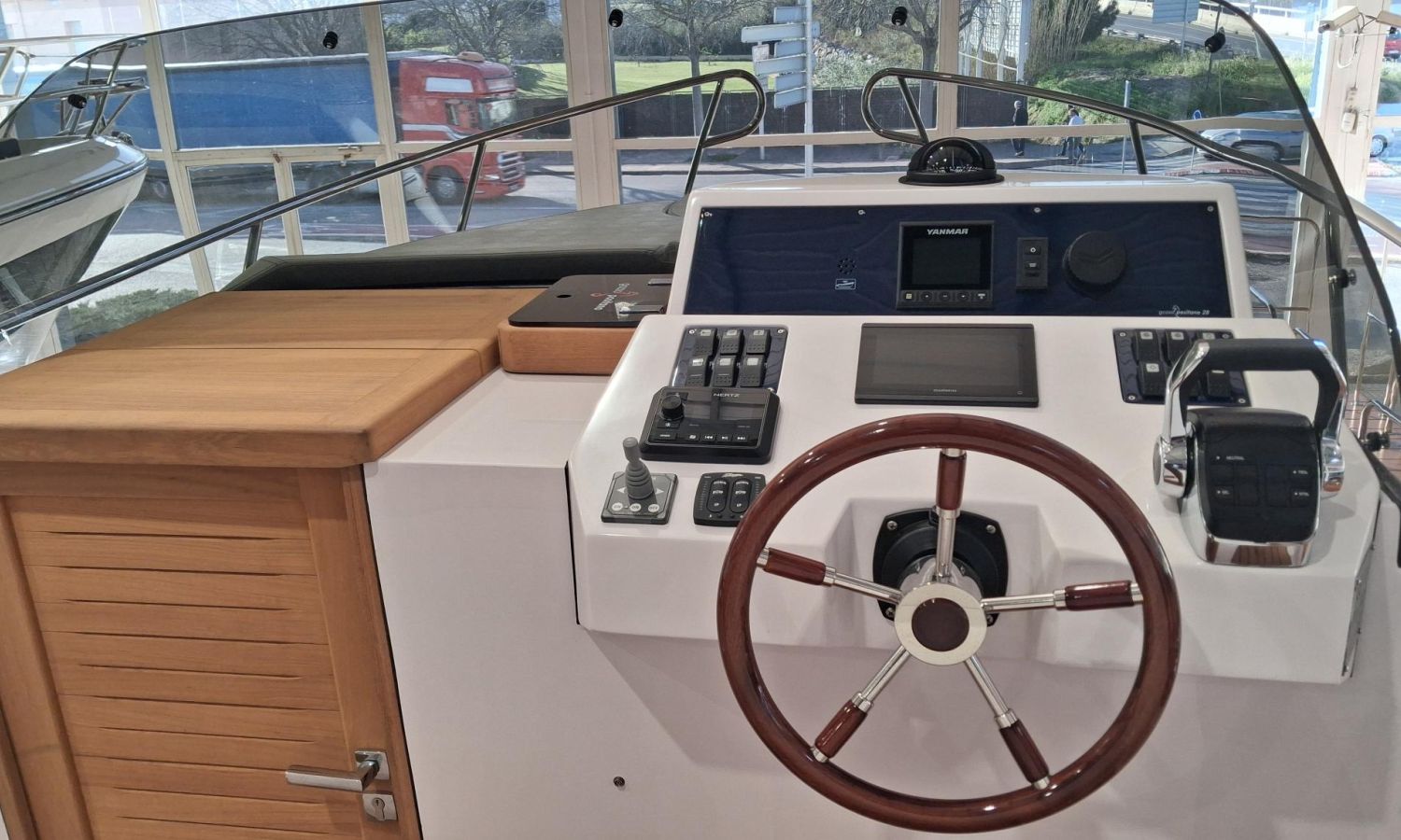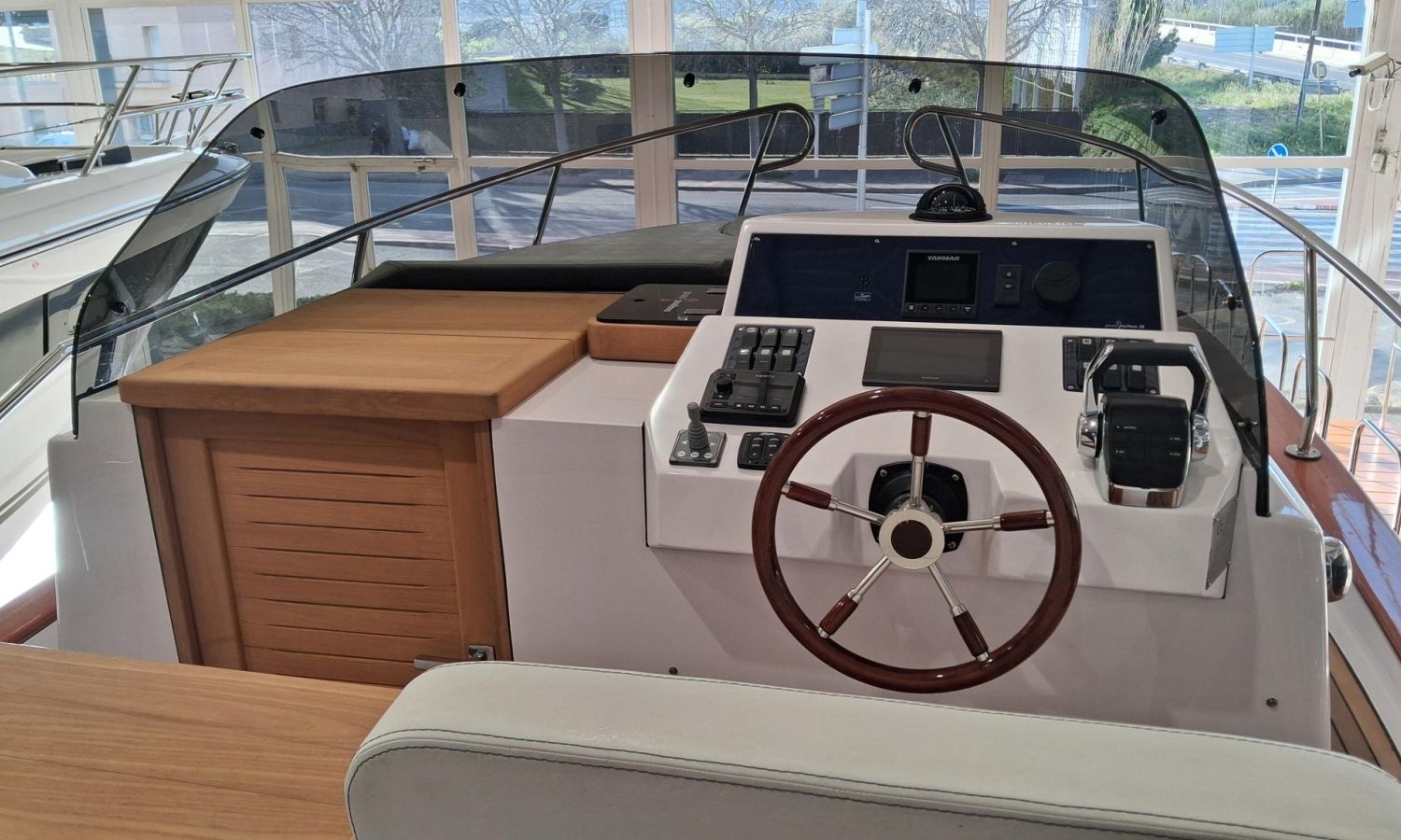 Bimini top with SS arch - Electric anchor winch, anchor and chain - Cockpit refrigerator - Cockpit table - Exterior kitchen and sink - Bow thruster - Exterior deck, seats and aft sunbathing cushions - Console cover - Teak laid stern platform with bathing ladder - Battery charger and shore power 220 V - Stereo system and speakers - 2 microperforated bimini top upgrade (1 back and 1 side) - GPS Garmin 7"- Cockpit led lighting - Preparation, launching and delivery with sea trial - Transport shipyard to Costa Brava.Boat description