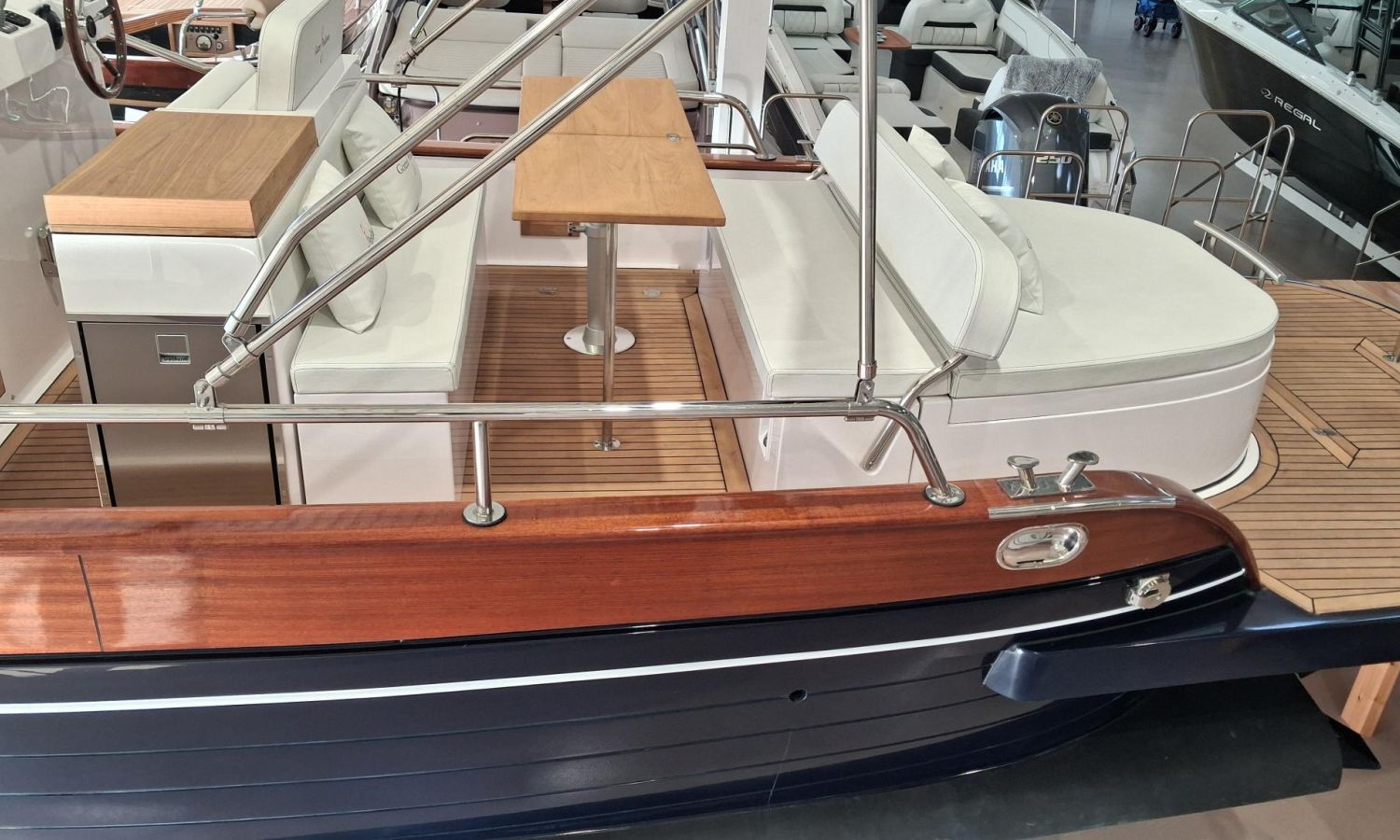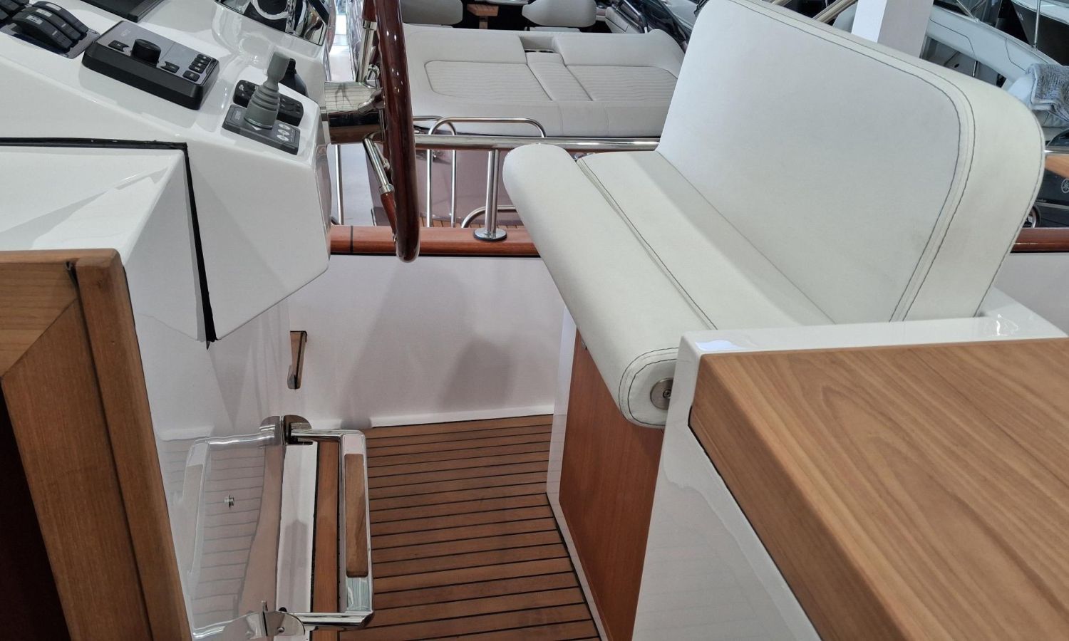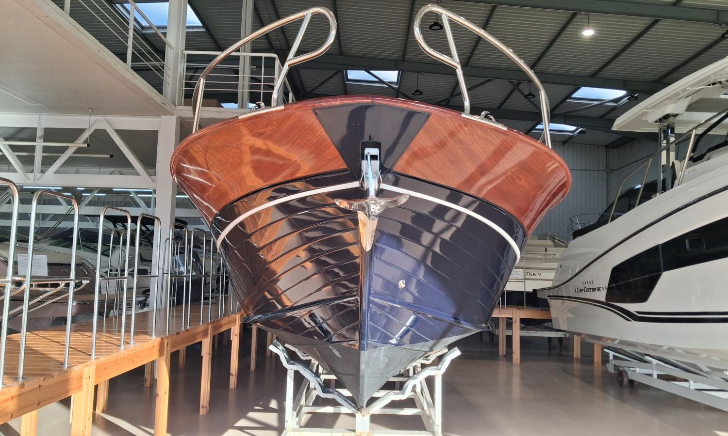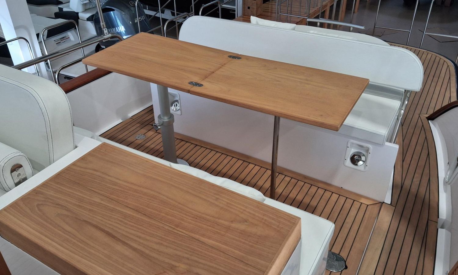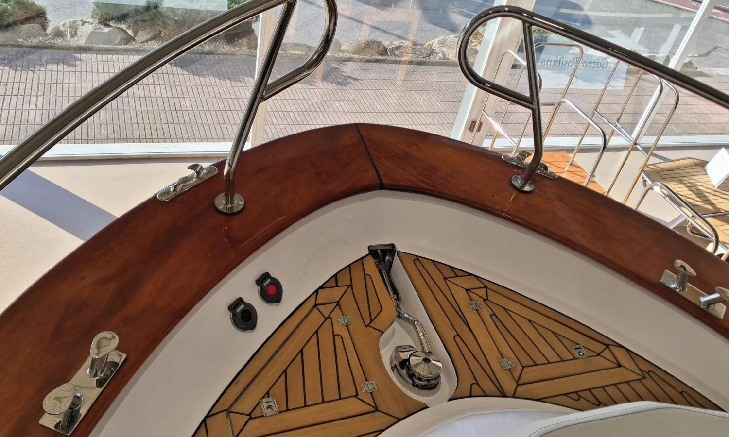 Bimini top with SS arch - Electric anchor winch, anchor and chain - Cockpit refrigerator - Cockpit table - Exterior kitchen and sink - Bow thruster - Exterior deck, seats and aft sunbathing cushions - Console cover - Teak laid stern platform with bathing ladder - Battery charger and shore power 220 V - Stereo system and speakers - 2 microperforated bimini top upgrade (1 back and 1 side) - GPS Garmin 7"- Cockpit led lighting - Preparation, launching and delivery with sea trial - Transport shipyard to Costa Brava.Boat description
