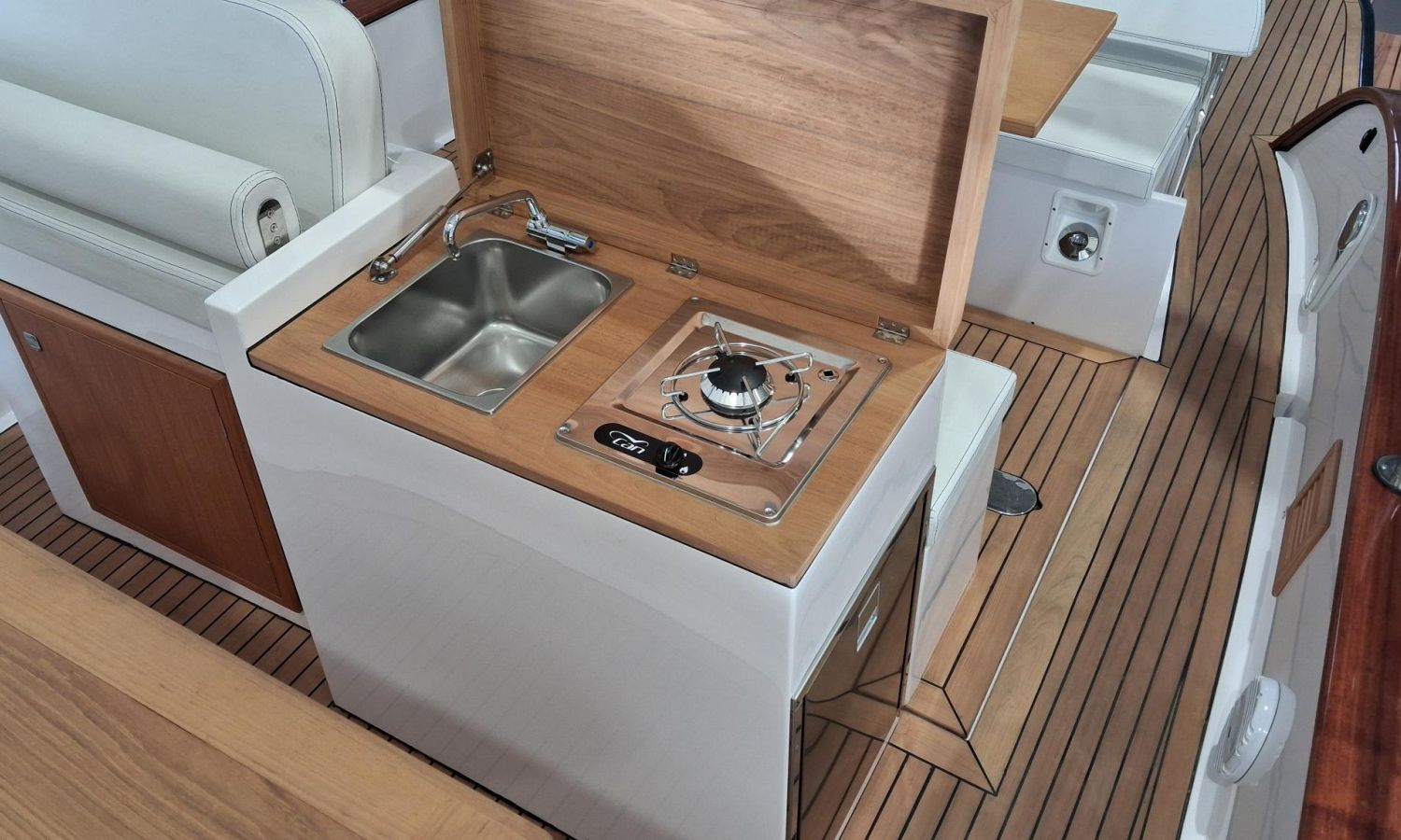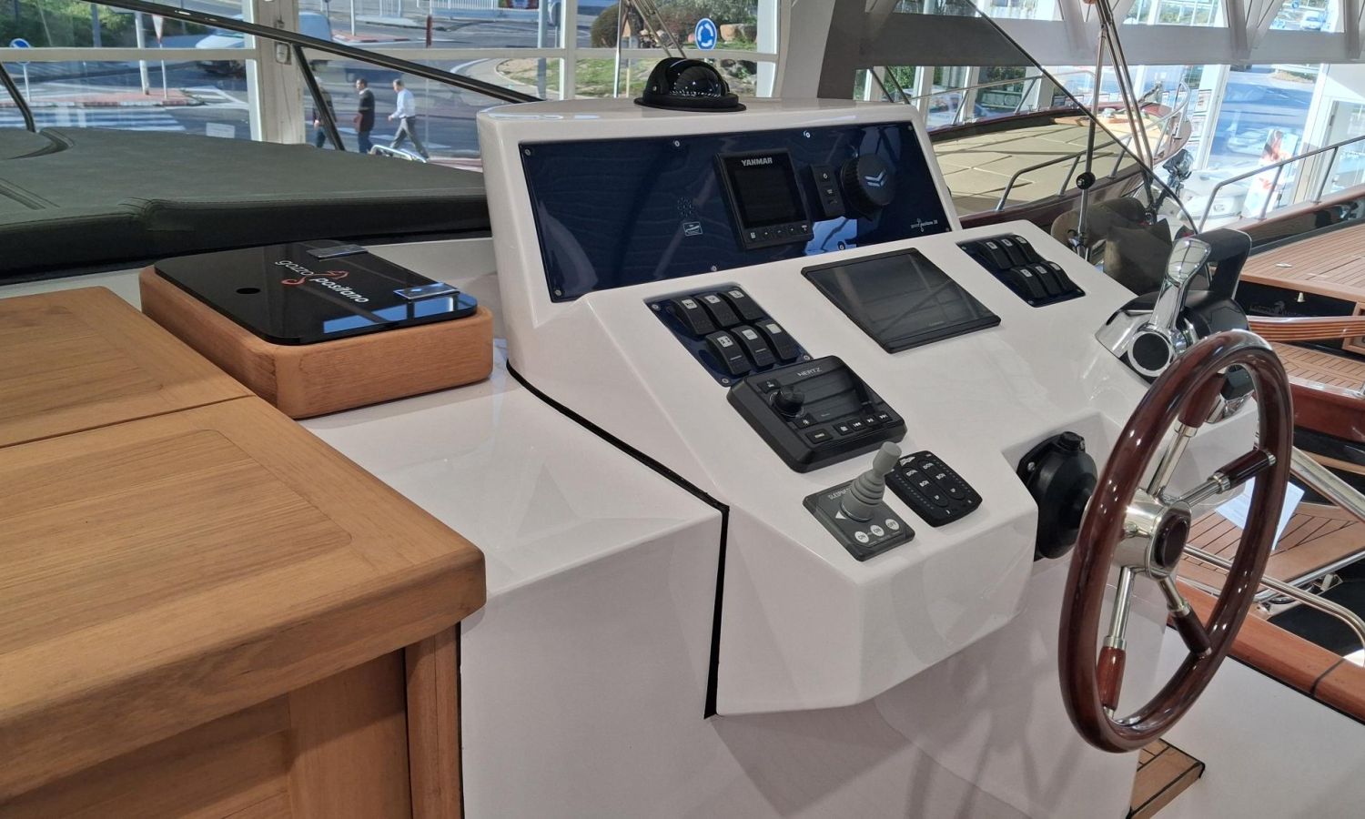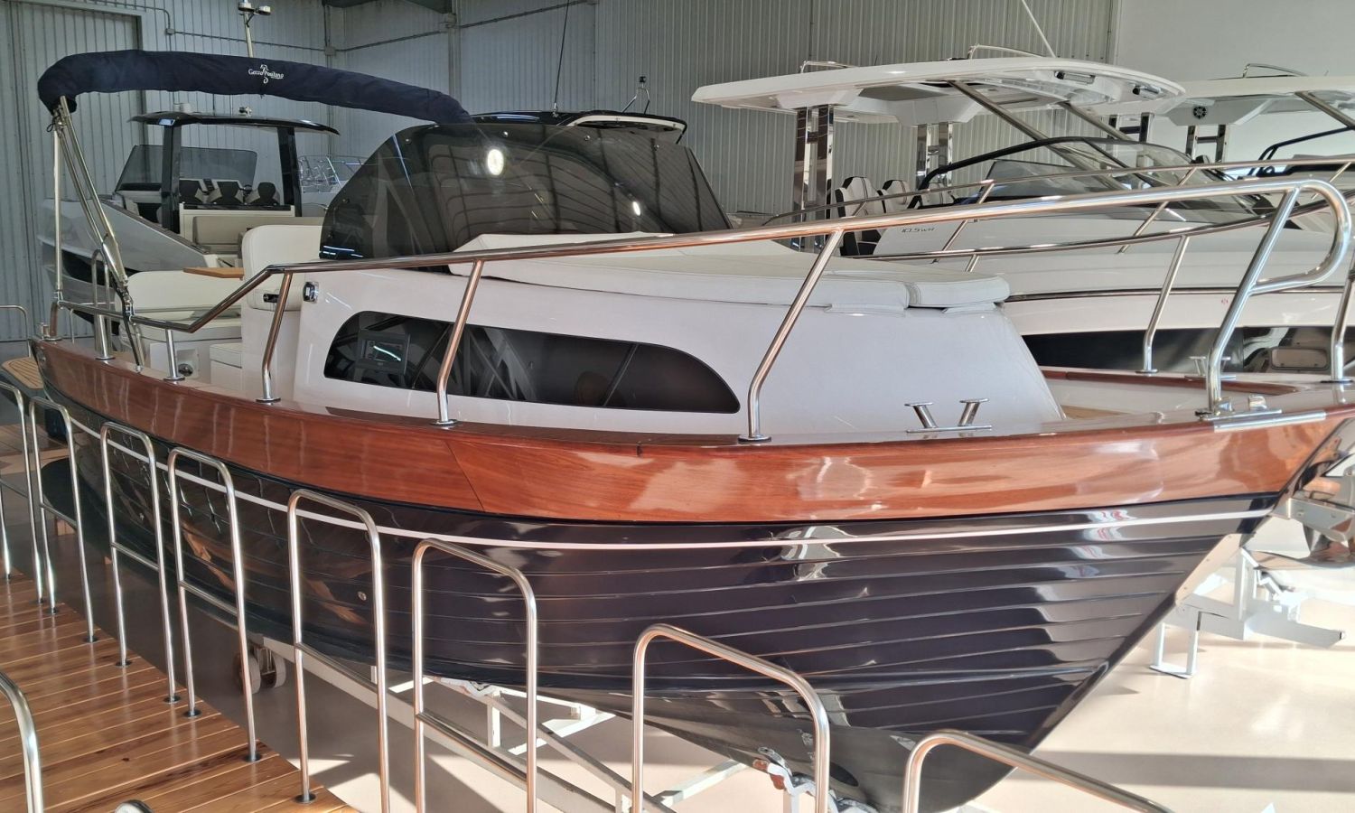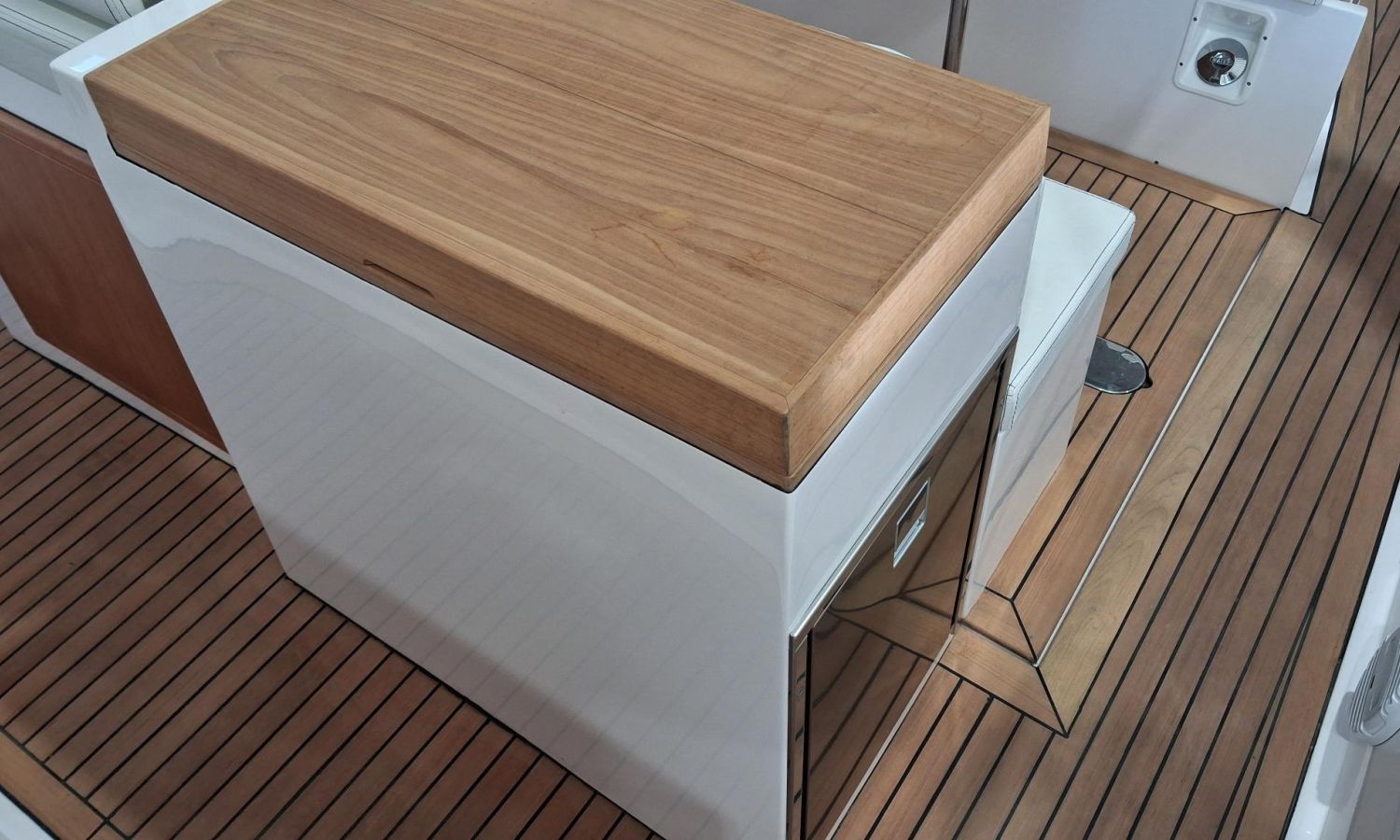Bimini top with SS arch - Electric anchor winch, anchor and chain - Cockpit refrigerator - Cockpit table - Exterior kitchen and sink - Bow thruster - Exterior deck, seats and aft sunbathing cushions - Console cover - Teak laid stern platform with bathing ladder - Battery charger and shore power 220 V - Stereo system and speakers - 2 microperforated bimini top upgrade (1 back and 1 side) - GPS Garmin 7"- Cockpit led lighting - Preparation, launching and delivery with sea trial - Transport shipyard to Costa Brava.Boat description