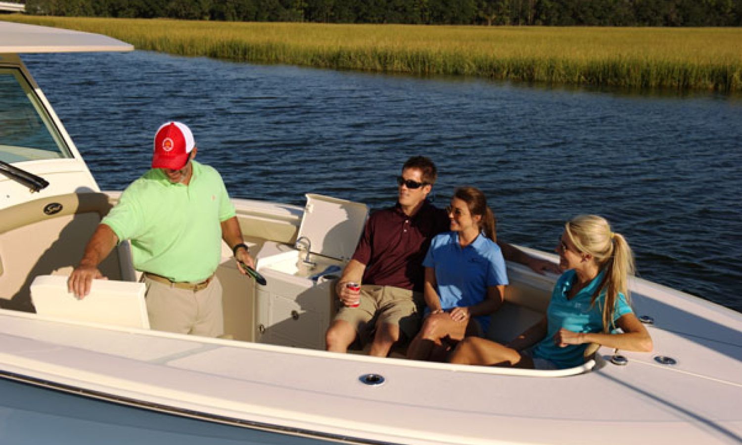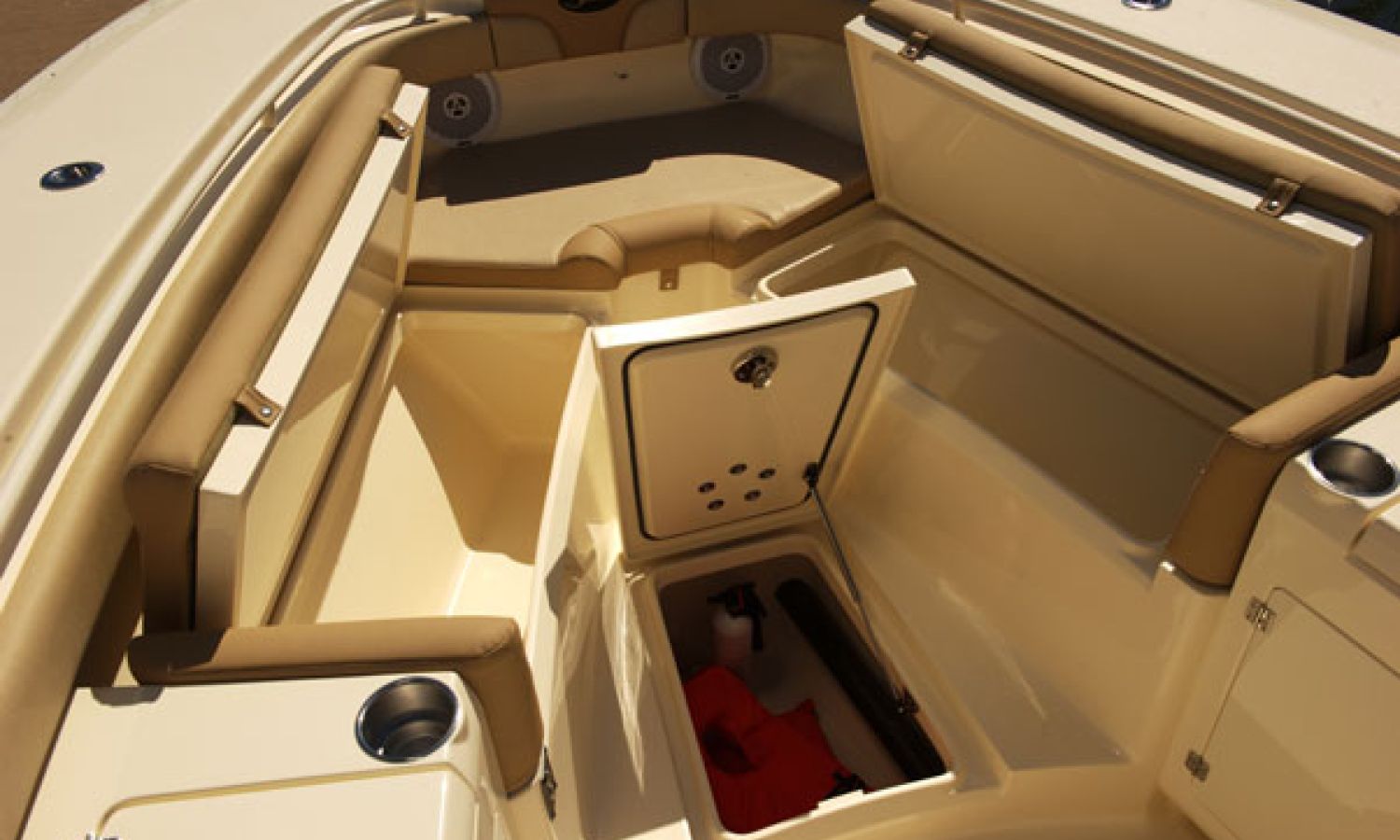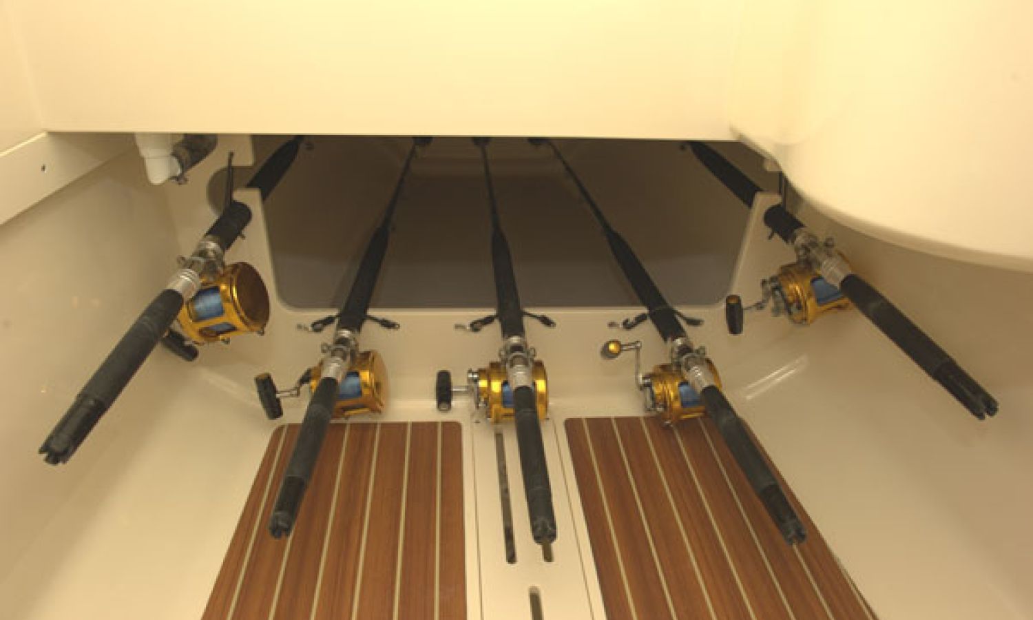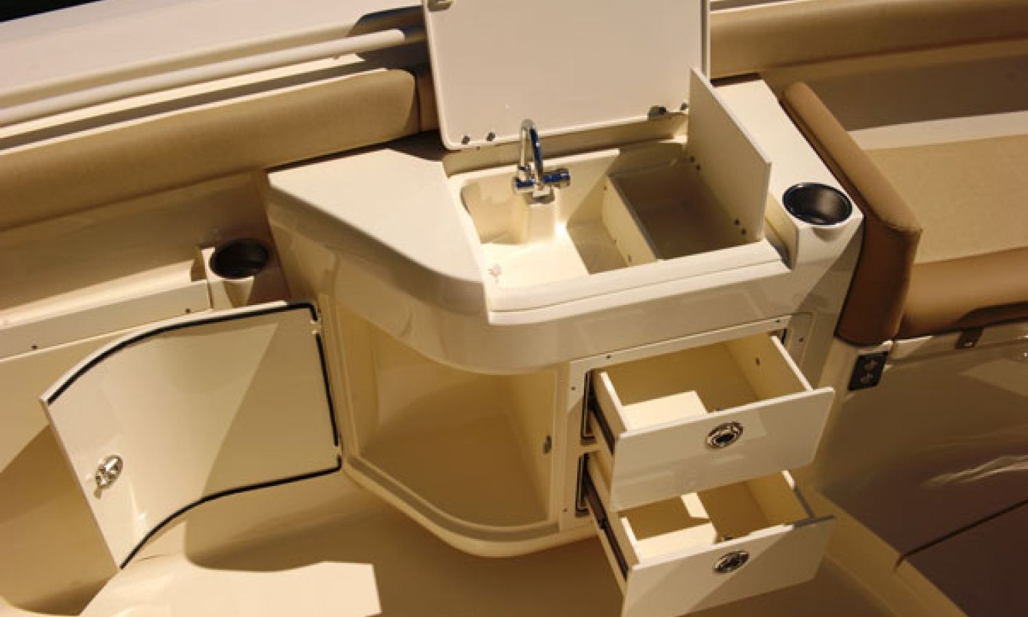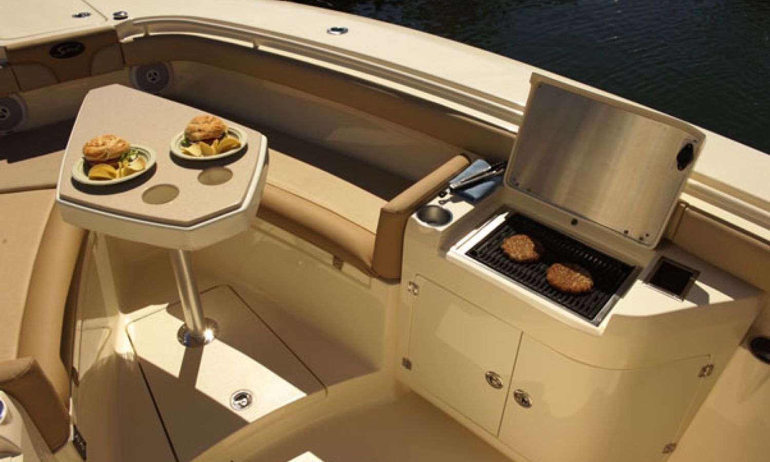 The 320 LXF is all new for 2013. This luxury sportfisher model sports the fuel efficient NuV3 hull design which equates to a lower cost of ownership and less time at the fuel dock, a unique electronic hub wiring system that enables you to control the electronics from a remote key fob, optional forward seating electric back rests, and a beautiful new Azure blue hull color that showcases a clear coat and pearl-essence application. Stunning, fast, comfortable, and stylish all rolled into one. Whether you’re cooking up a meal for your family in the bow on the optional grill, or fishing out of the cockpit with your friends, the 320 LXF sets a new standard in this size category.