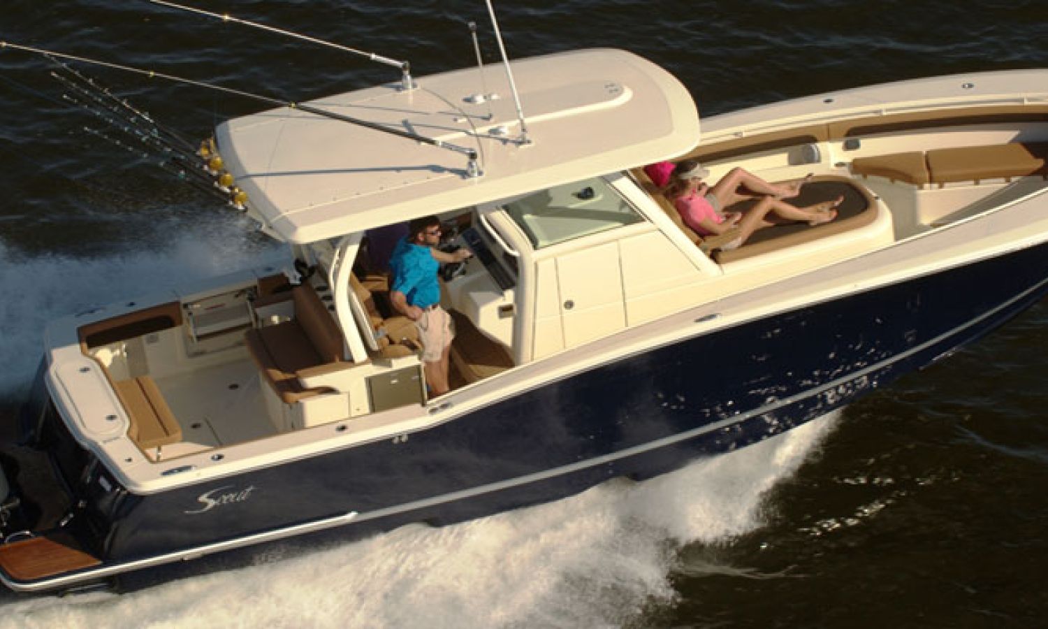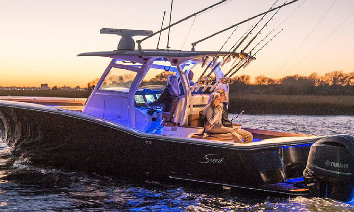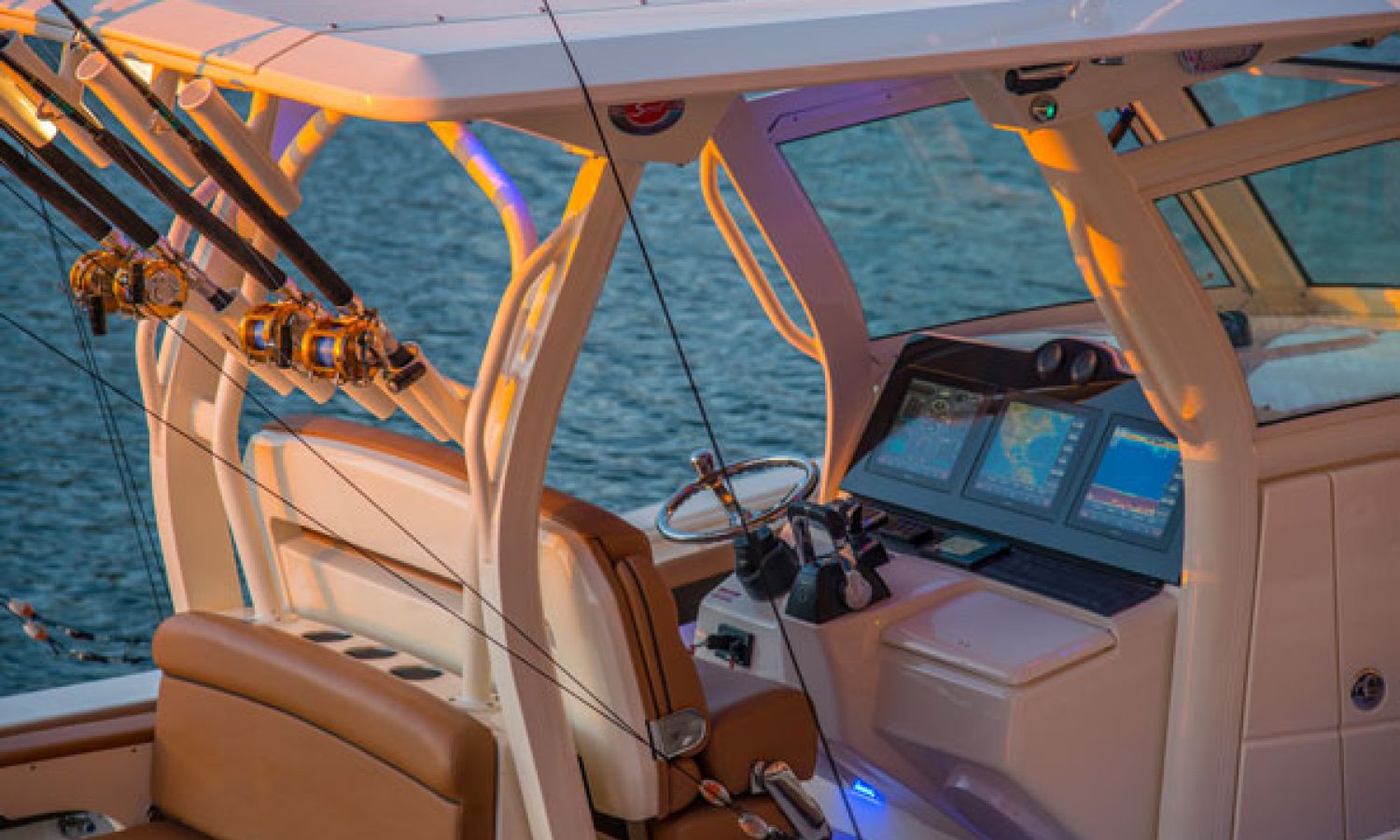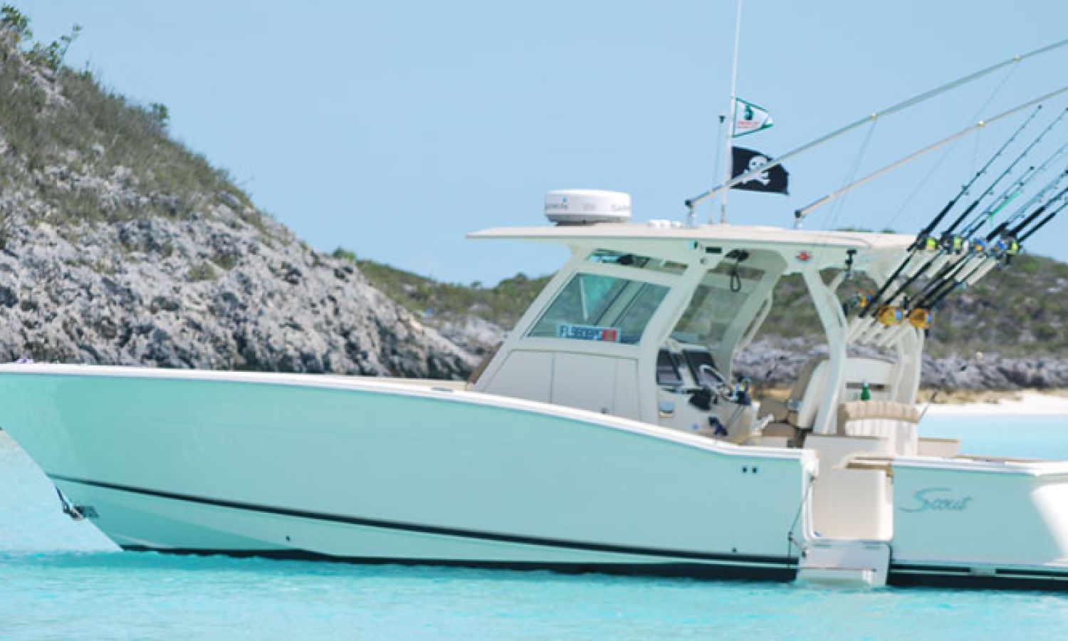 Scout Boats' new flagship center console, the 350 LXF Sportfish. This model boasts the revolutionary Scout Dual Stepped Hull Technology for higher performance and increased fuel economy. The 350 LXF is available with twin Yamaha F300 or F350 engines, and for the first time ever, Scout has also developed this model with a triple engine configuration with Yamaha F300s. With triple engines and 900 hp available, the new model reaches a top speed of nearly 70 mph. Measuring 34’11” in length with a wide beam of 10’9”, the boat is sleek, stylish and very roomy for anglers and gear. The helm offers a powder coated patented T-top hardtop with a glass enclosure, 11 rocket launchers, and an optional electric retractable fiberglass sun shade that gives way to a moon roof in the hardtop.