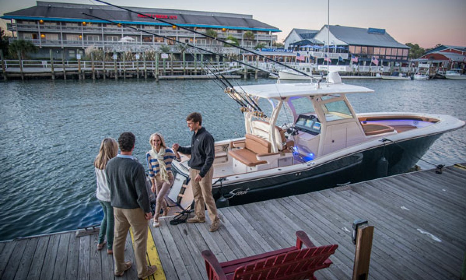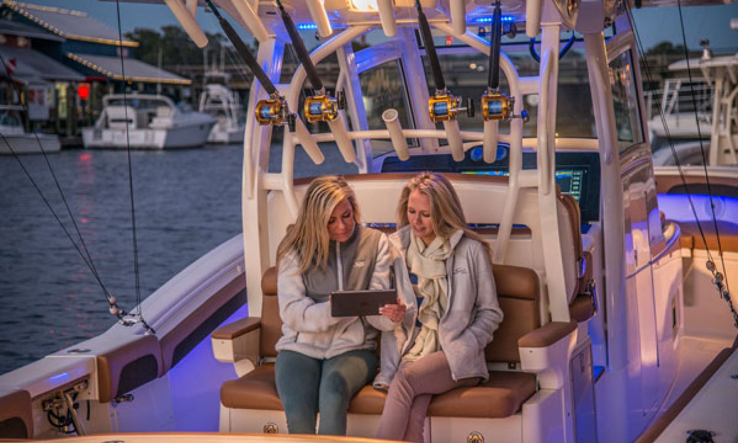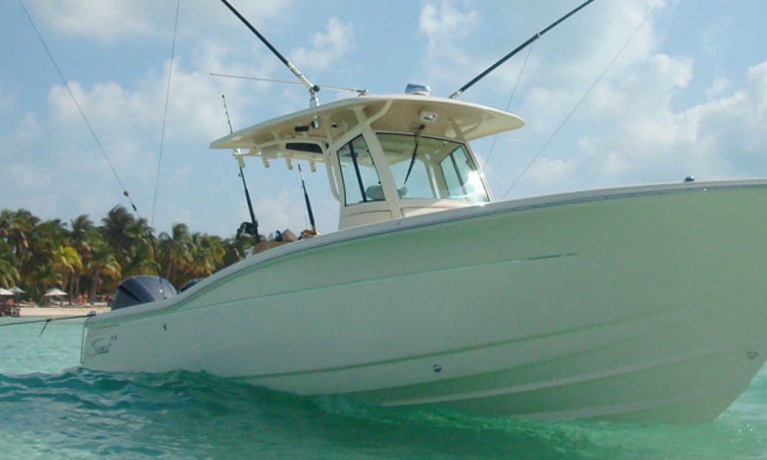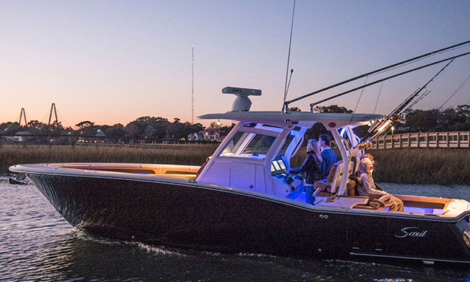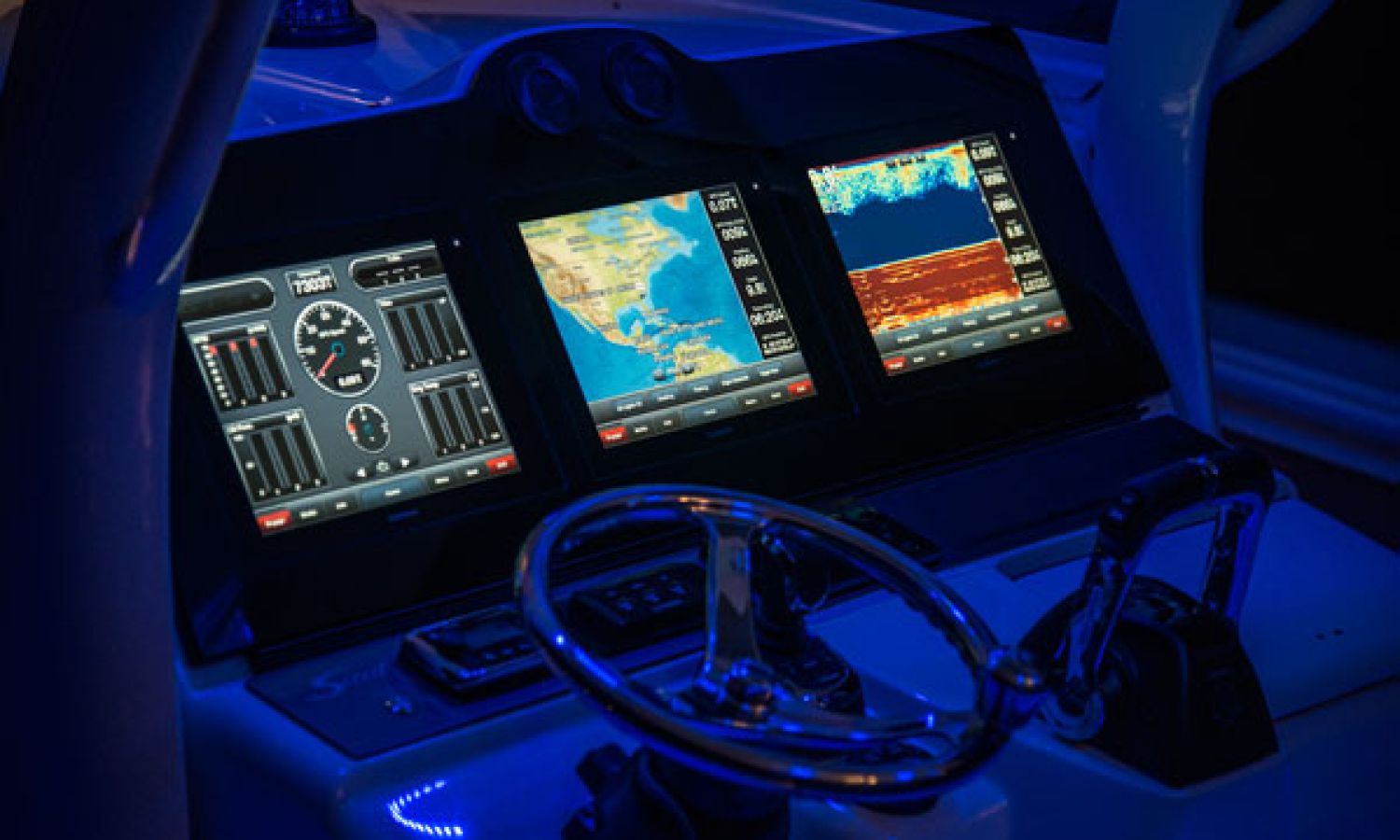 Scout Boats' new flagship center console, the 350 LXF Sportfish. This model boasts the revolutionary Scout Dual Stepped Hull Technology for higher performance and increased fuel economy. The 350 LXF is available with twin Yamaha F300 or F350 engines, and for the first time ever, Scout has also developed this model with a triple engine configuration with Yamaha F300s. With triple engines and 900 hp available, the new model reaches a top speed of nearly 70 mph. Measuring 34’11” in length with a wide beam of 10’9”, the boat is sleek, stylish and very roomy for anglers and gear. The helm offers a powder coated patented T-top hardtop with a glass enclosure, 11 rocket launchers, and an optional electric retractable fiberglass sun shade that gives way to a moon roof in the hardtop.