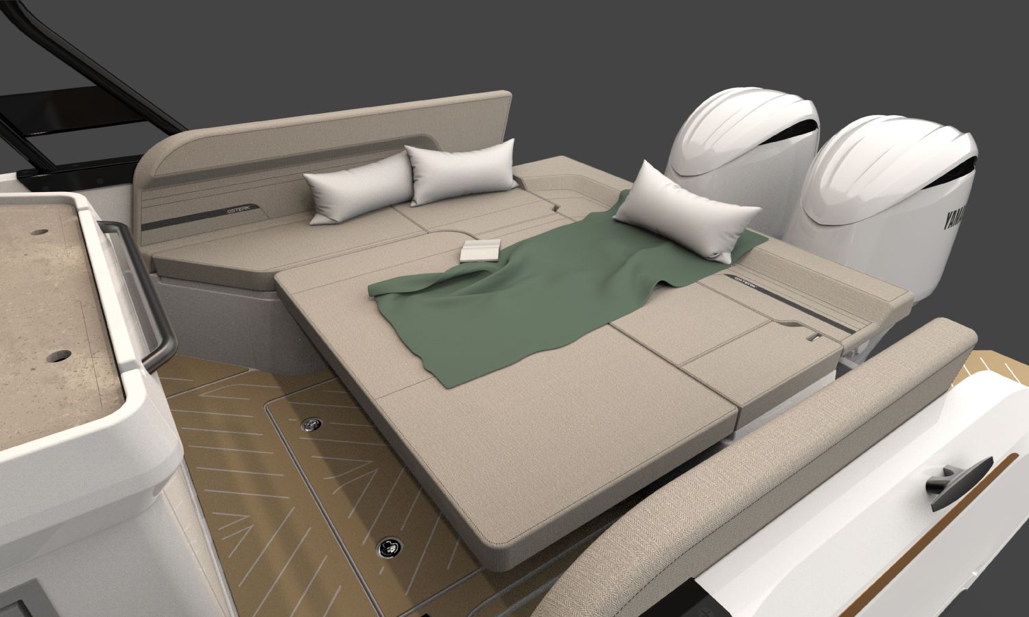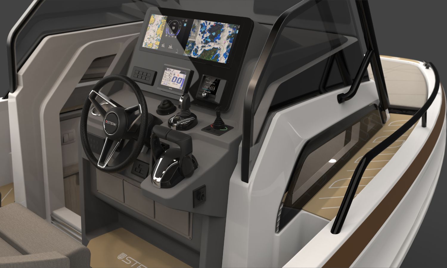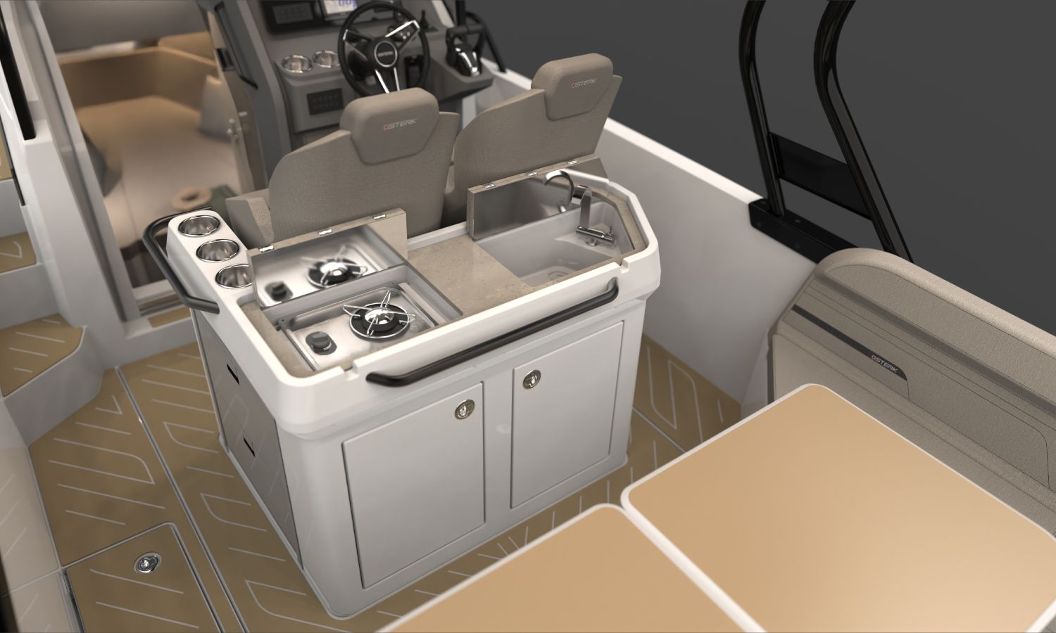 Electric windlass with anchor and chain - Bow thruster - Leaning post in cockpit with sink, refrigerator and gas stove - GRP T-Top, POLISHED frame with navigation lights - Ski mast - Storage space instead of table in interior cabin - Bathroom with toilet and holding tank - Foldable side seat in portside cockpit - Compass - Q Display 210 electronic equipment - Depth sounder - Nautical chart - Stern boom for T-Top - Console and cockpit seat covers - Mooring kit - Builder's certificate - Transport from the shipyard to the Costa Brava - Preparation, assembly and launch with sea trials - Antifouling paint.Boat description