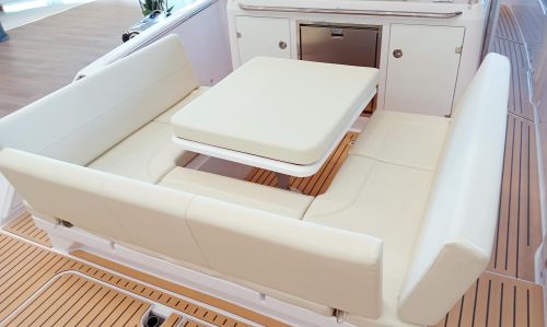 2 stainless steel cleats in the centre of the hull - Bimini canopy aft - Electric WC with sewage system with waste water tank 60 l - Fresh water system with 130 l tank - Hifi package with 2 speakers - Navigation lights - Illuminated compass - Bow table with foot convertible into sun bathing - Complete bath cabin - Surcharge for cooled/heated cup holders - Strips laminated in PRFV hull - Plasdeck with black stripes - Inductive telephone charger 12 V - T-Top made of PRFV - T-Top laminated vinyl strip - Port outlet with charger - Special paint of the dashboard (upper part) - Special paint of the dashboard (lower part) - Electric anchor winch + anchoring kit - Color surcharge upholstery - Manufacturers' certificate - Transport to Costa Brava - Installation of engines - Antifouling paint - Preparation, launching and delivery with sea tests.Boat description