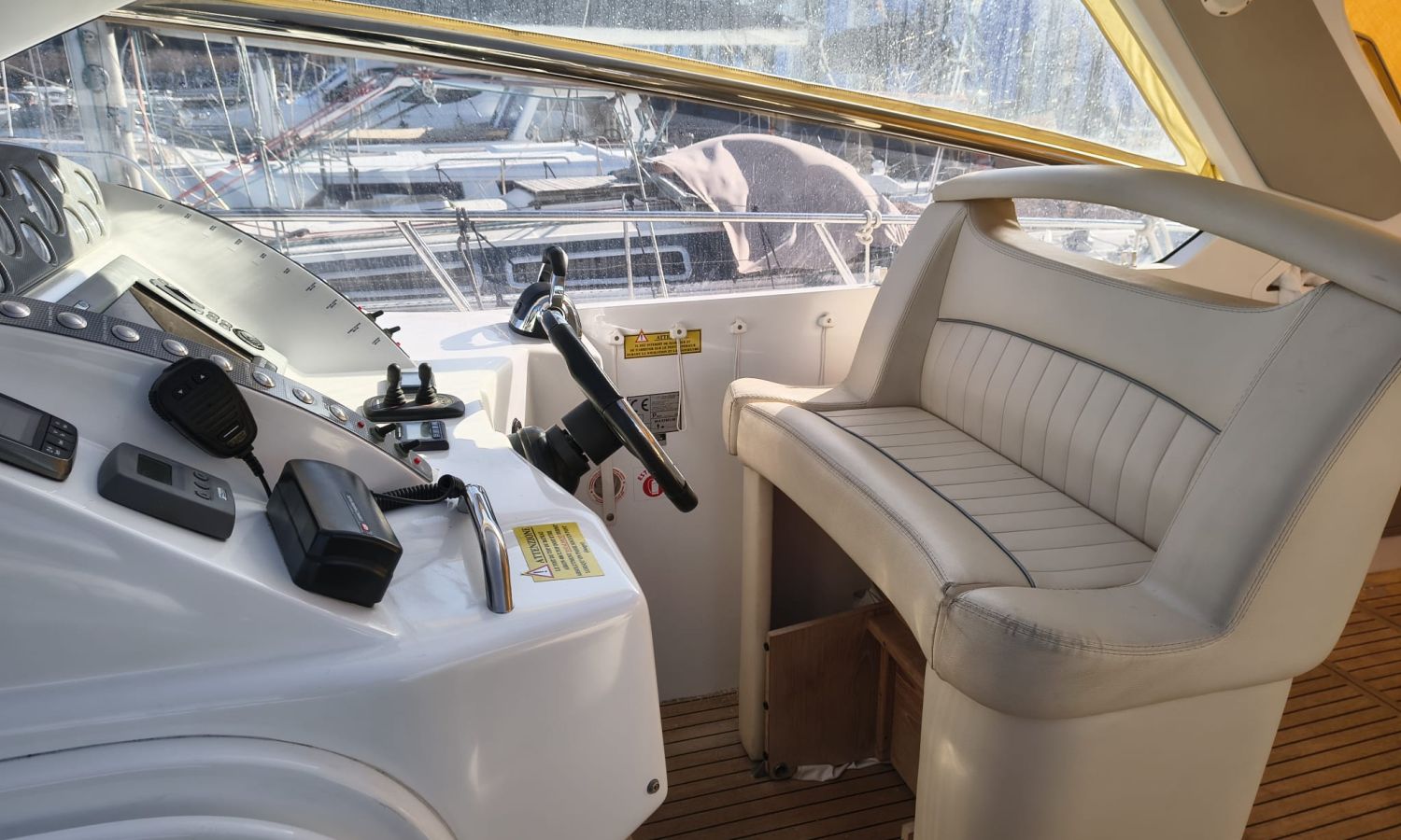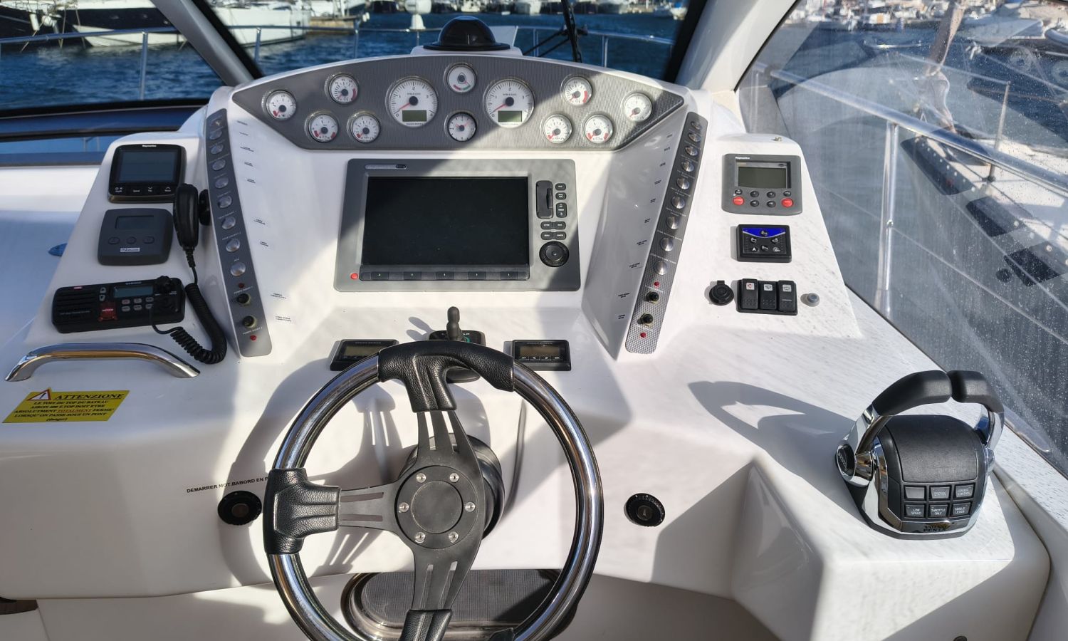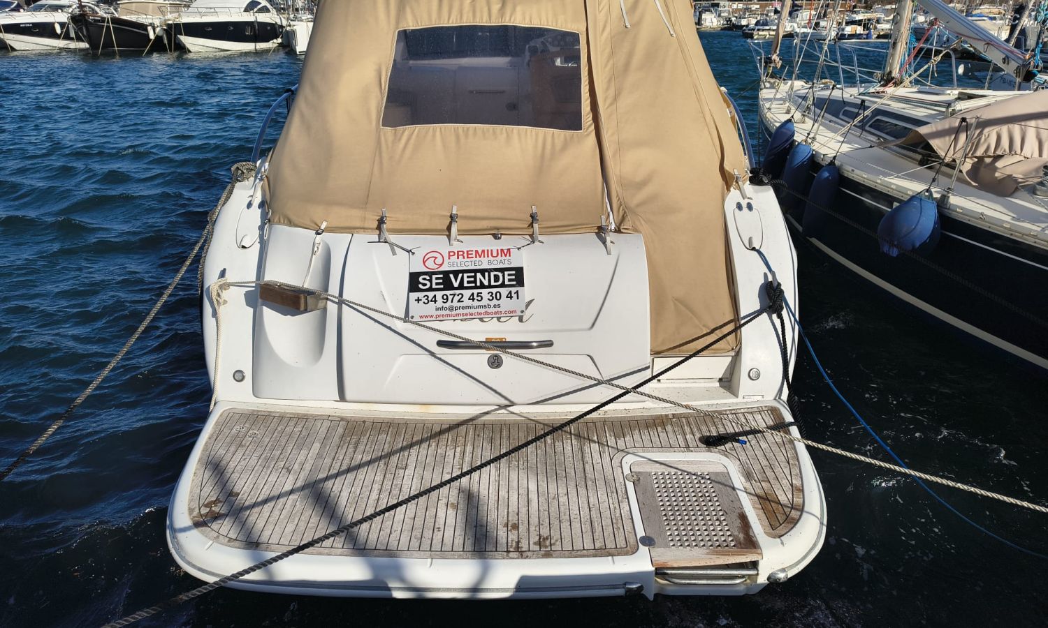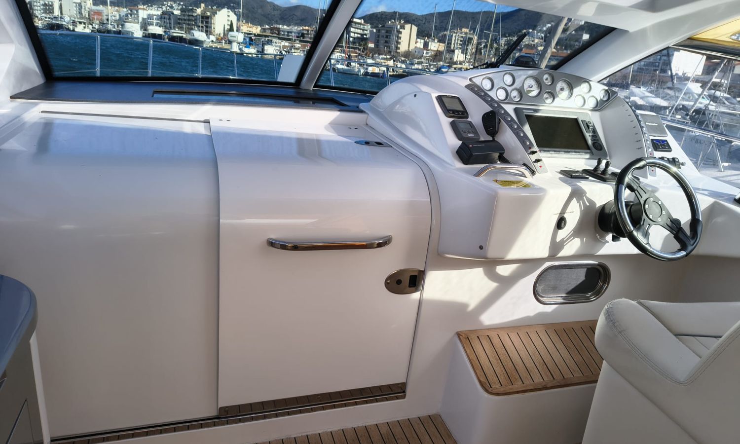 Hard Top - Toldo bimini - Hélice de proa y popa - Flaps - Toma de puerto 220 V - Cargador de baterías - Generador - Solárium de proa - WC con depósito de aguas negras - 2 Cabinas - Molinete eléctrico - Pasarela hidráulica - Mesa en la bañera - Mueble bar con fregadero - Suelo en teca - VHF - GPS/Plotter/Sonda - Piloto automático - Mandos electrónicos - Yacht controller - Equipo de audio - Flaps - Ducha en popa - Vitro - Nevera 12 V/220 V - Microondas - Toma de agua exterior.