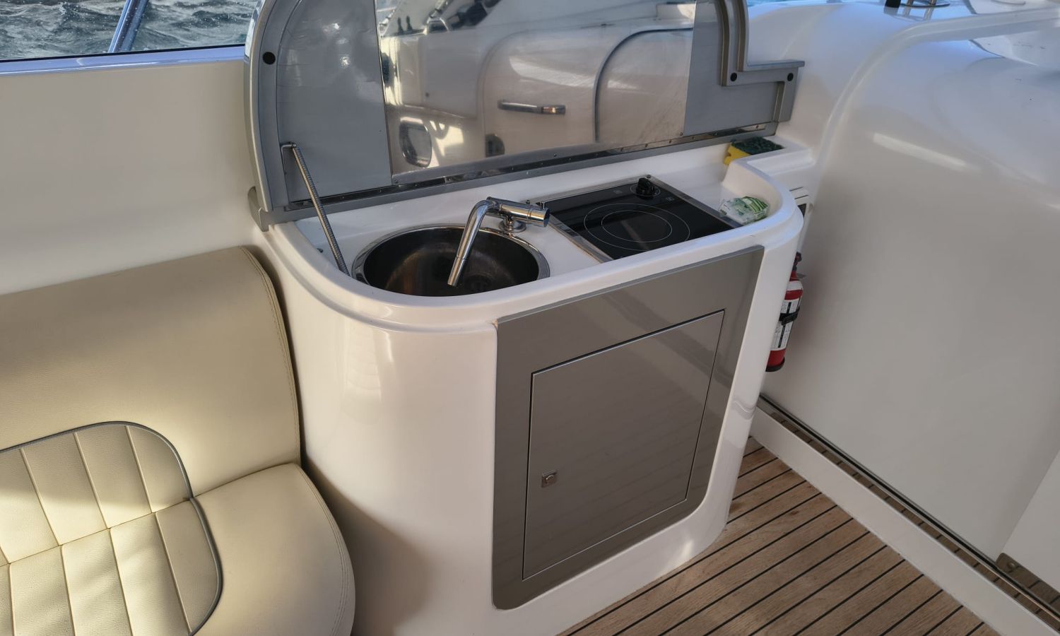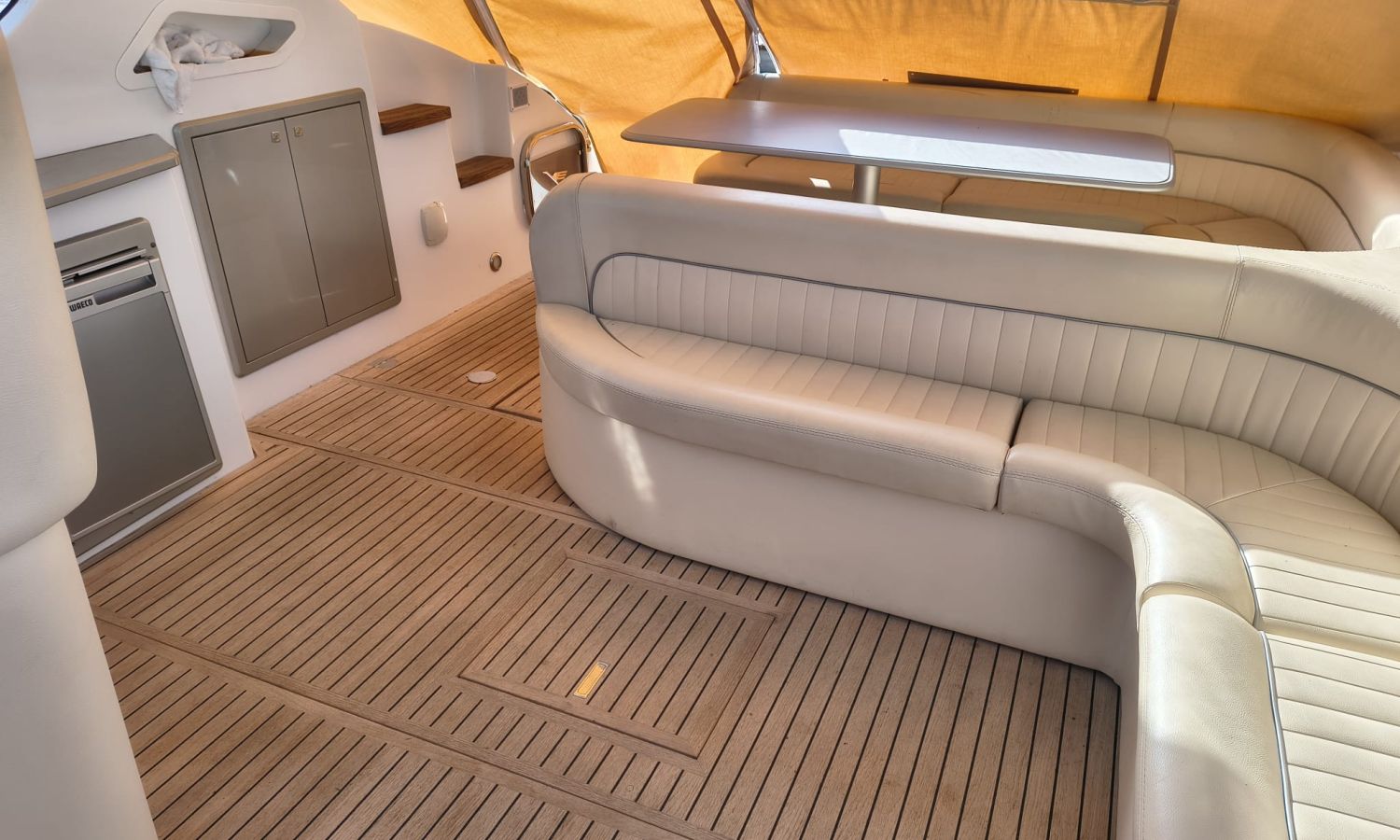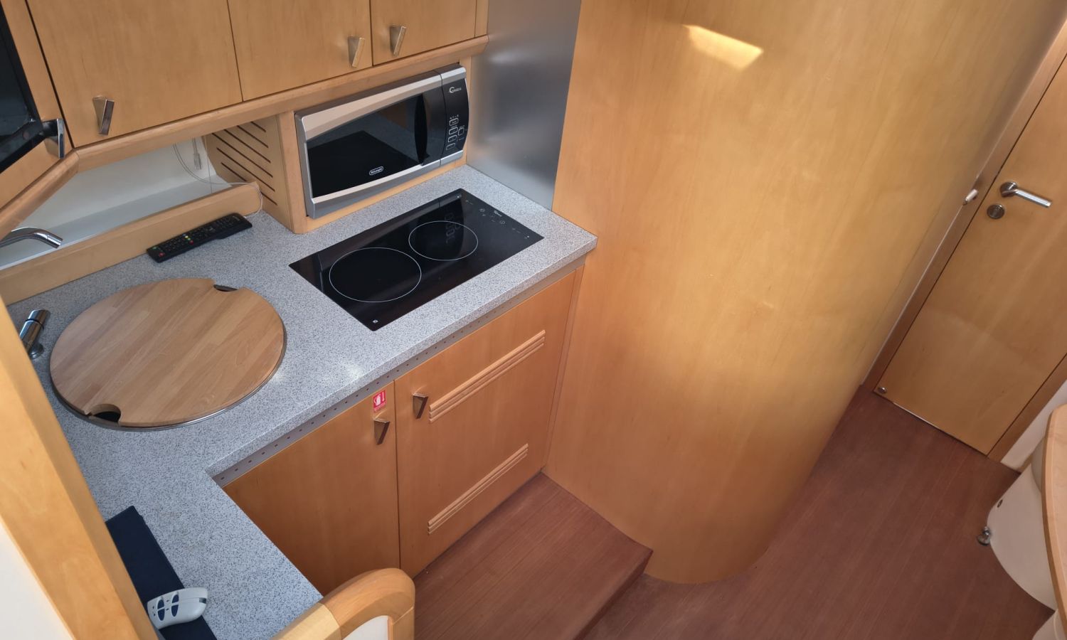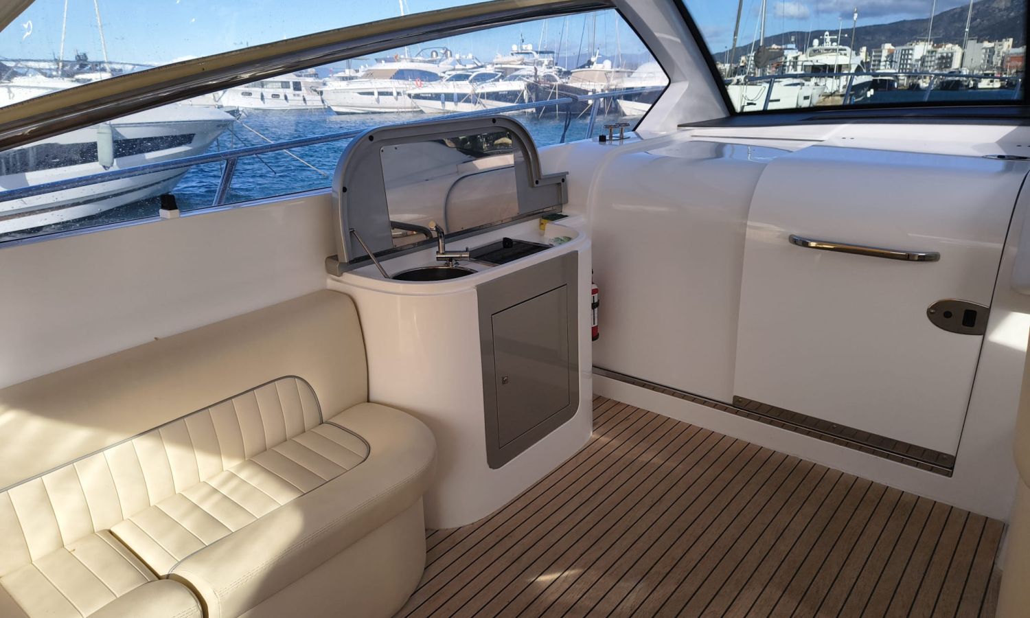 Hard Top - Toldo bimini - Hélice de proa y popa - Flaps - Toma de puerto 220 V - Cargador de baterías - Generador - Solárium de proa - WC con depósito de aguas negras - 2 Cabinas - Molinete eléctrico - Pasarela hidráulica - Mesa en la bañera - Mueble bar con fregadero - Suelo en teca - VHF - GPS/Plotter/Sonda - Piloto automático - Mandos electrónicos - Yacht controller - Equipo de audio - Flaps - Ducha en popa - Vitro - Nevera 12 V/220 V - Microondas - Toma de agua exterior.