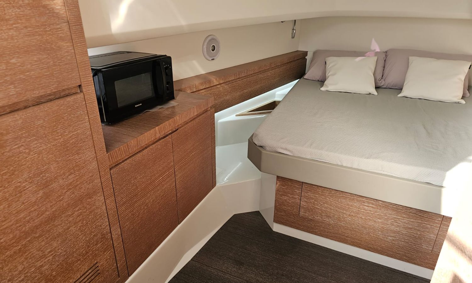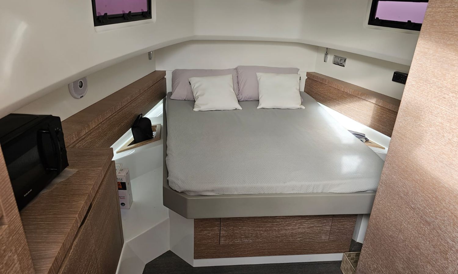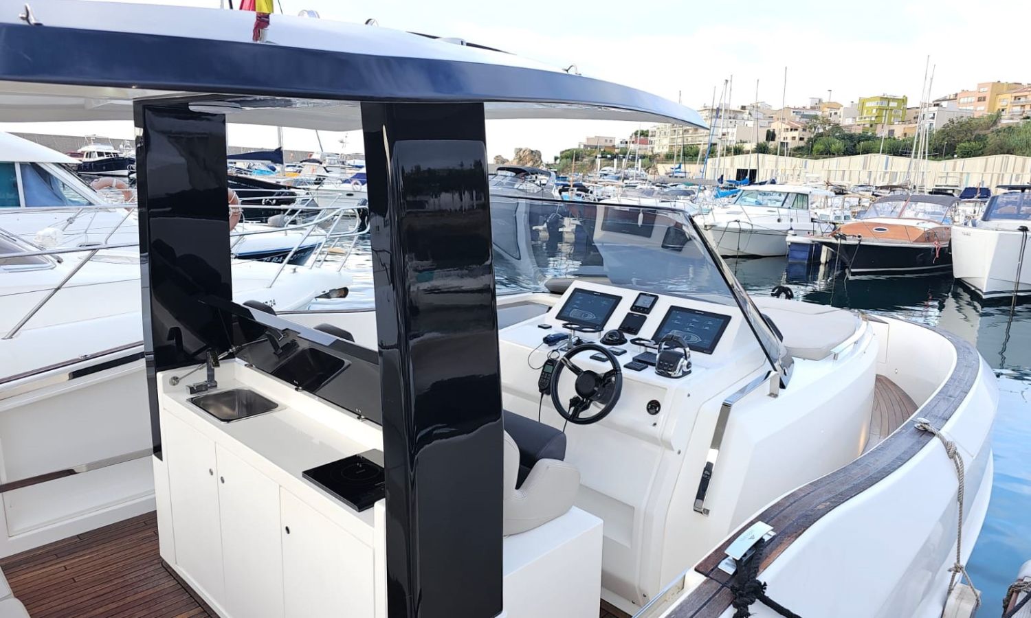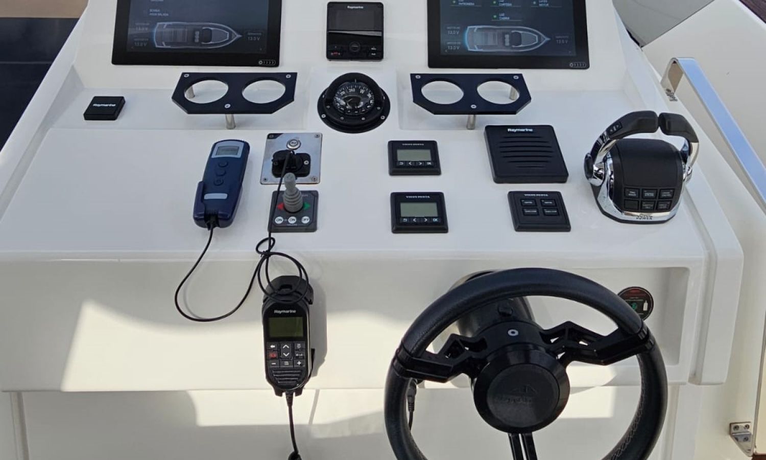 Cabina de invitados con dos camas - Nevera en cabina de 130 l - Generador - Aire acondicionado - Radio Fusion con altavoces - Funda de asientos pilotaje - Funda solárium y asientos popa - Funda solárium de proa - Luces de cortesía en cubierta - Mesa de bañera - Hard top - Toldo haima a popa con mástiles desmontables - Pasarela - Hélice de proa - 2 pantallas Raymarine Multidisplay Asion 12" - VHF - Piloto automático - Profundímetro - Contador de cadena - Cámara de maniobra - Pre-instalación para TV - Antifouling.Descripción embarcación