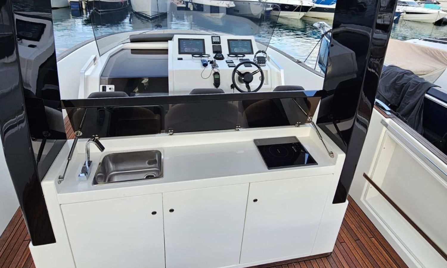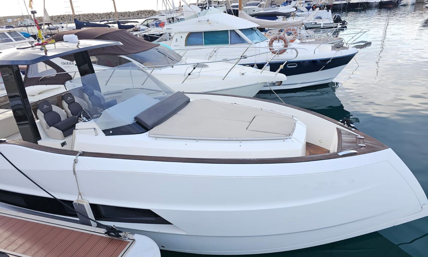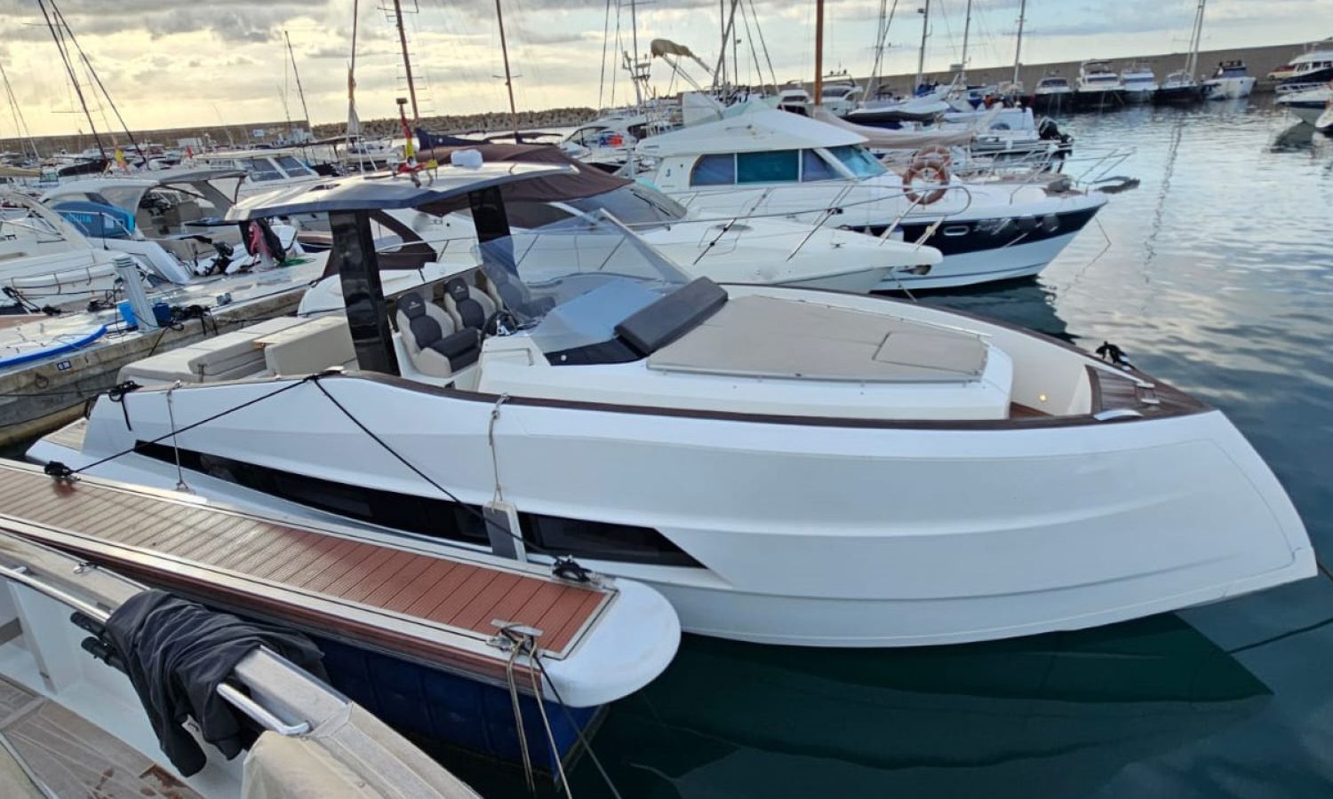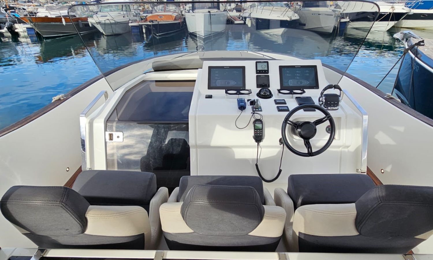 Cabina de invitados con dos camas - Nevera en cabina de 130 l - Generador - Aire acondicionado - Radio Fusion con altavoces - Funda de asientos pilotaje - Funda solárium y asientos popa - Funda solárium de proa - Luces de cortesía en cubierta - Mesa de bañera - Hard top - Toldo haima a popa con mástiles desmontables - Pasarela - Hélice de proa - 2 pantallas Raymarine Multidisplay Asion 12" - VHF - Piloto automático - Profundímetro - Contador de cadena - Cámara de maniobra - Pre-instalación para TV - Antifouling.Descripción embarcación