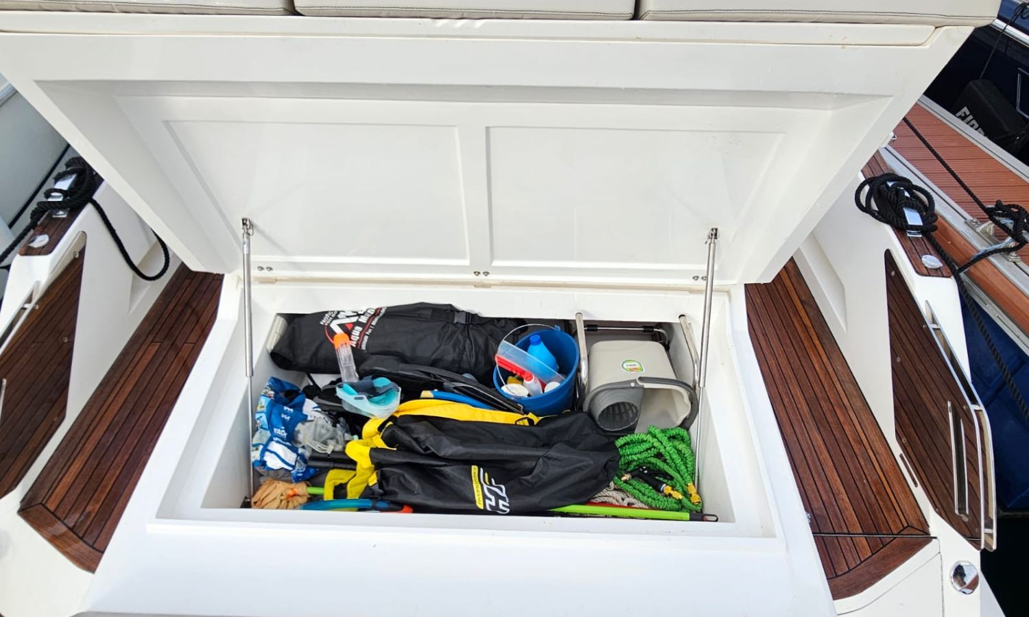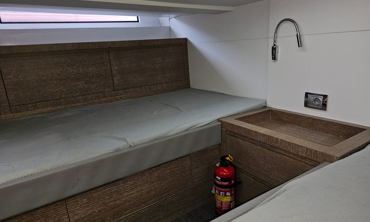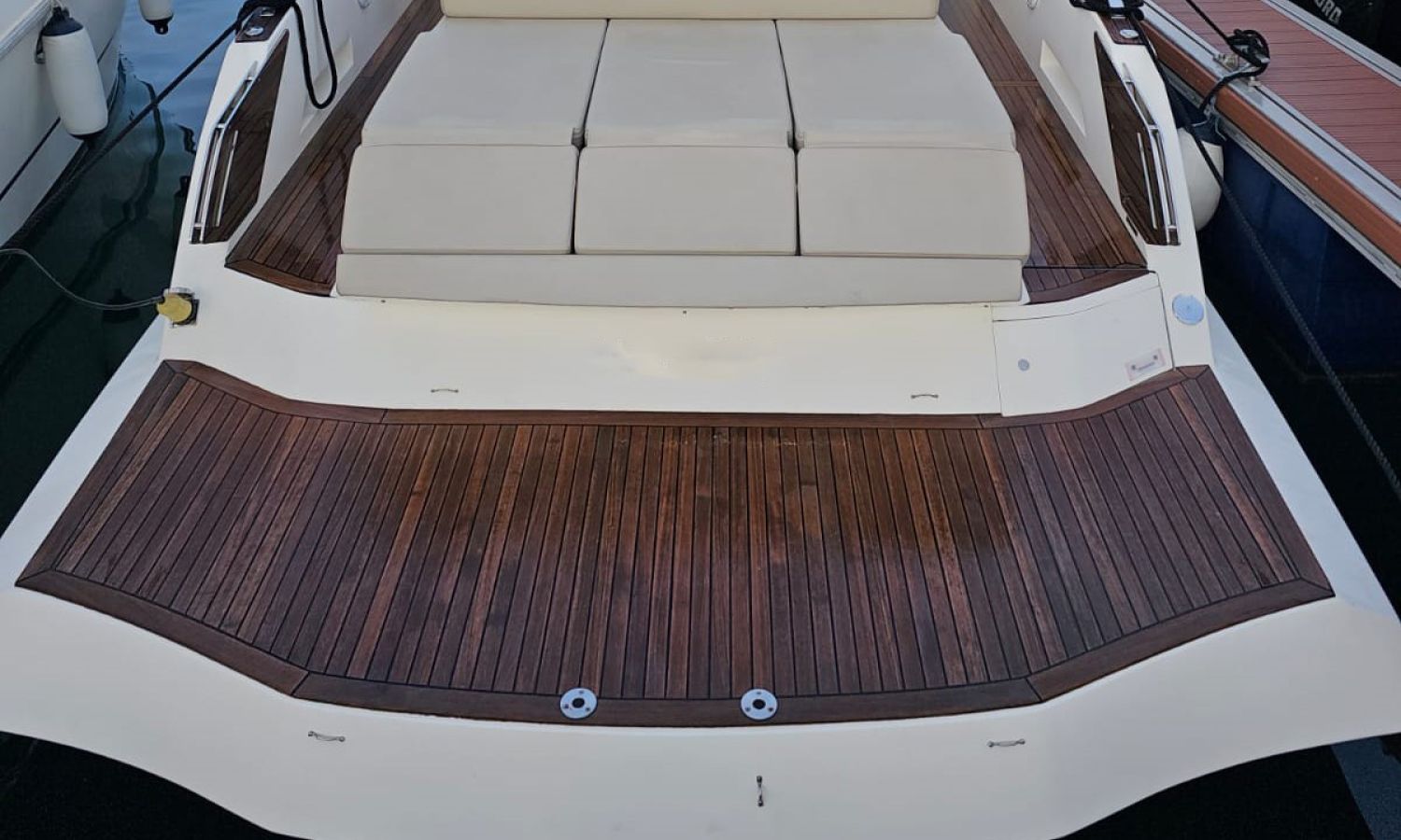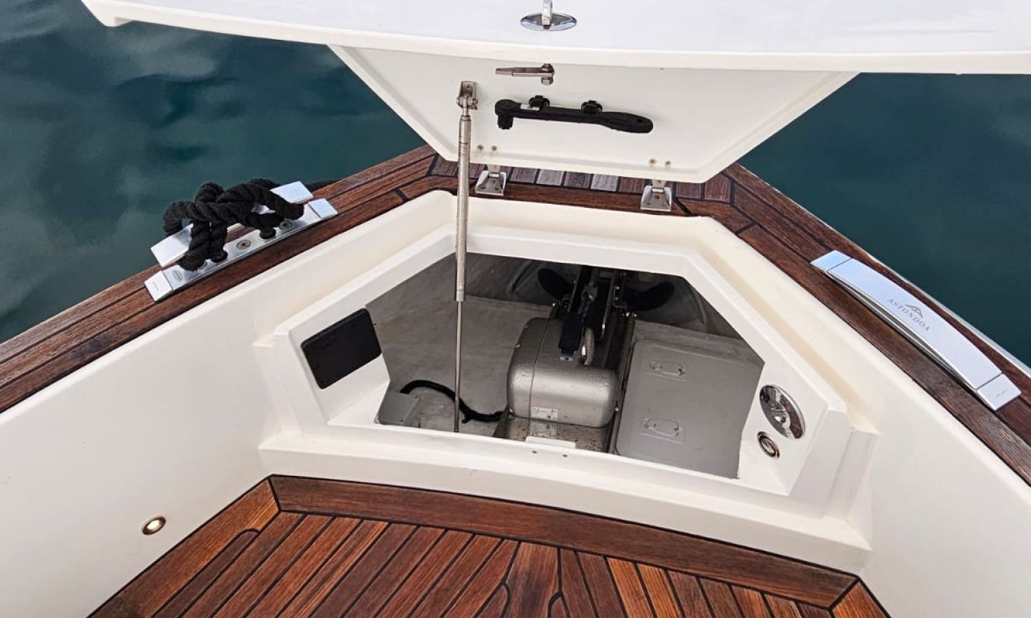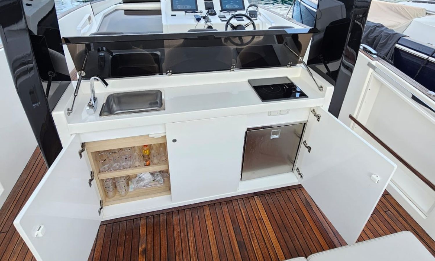 Cabina de invitados con dos camas - Nevera en cabina de 130 l - Generador - Aire acondicionado - Radio Fusion con altavoces - Funda de asientos pilotaje - Funda solárium y asientos popa - Funda solárium de proa - Luces de cortesía en cubierta - Mesa de bañera - Hard top - Toldo haima a popa con mástiles desmontables - Pasarela - Hélice de proa - 2 pantallas Raymarine Multidisplay Asion 12" - VHF - Piloto automático - Profundímetro - Contador de cadena - Cámara de maniobra - Pre-instalación para TV - Antifouling.Descripción embarcación