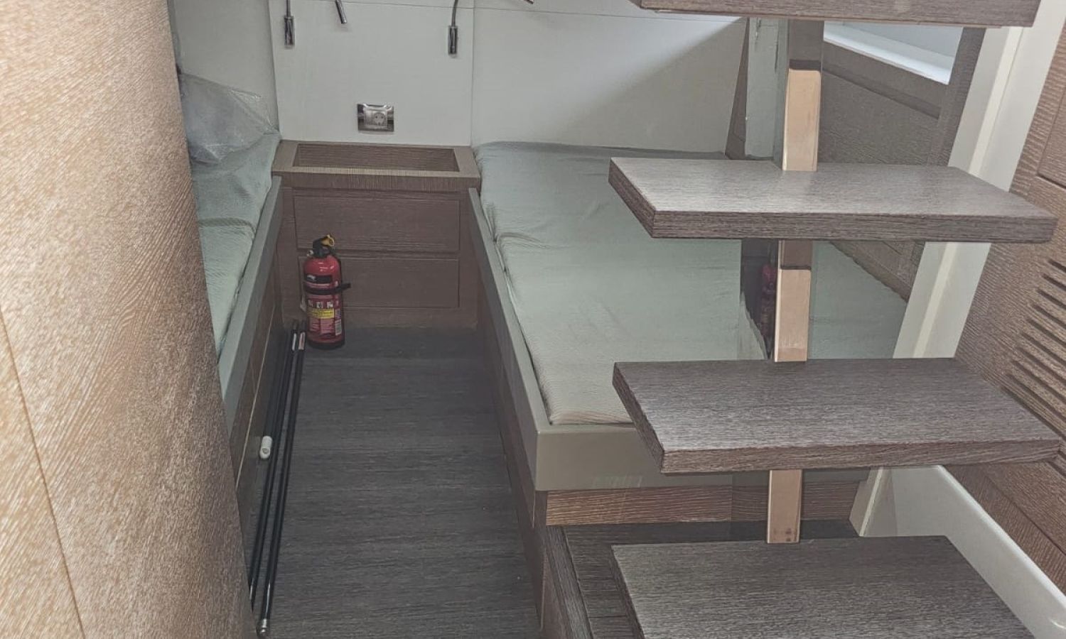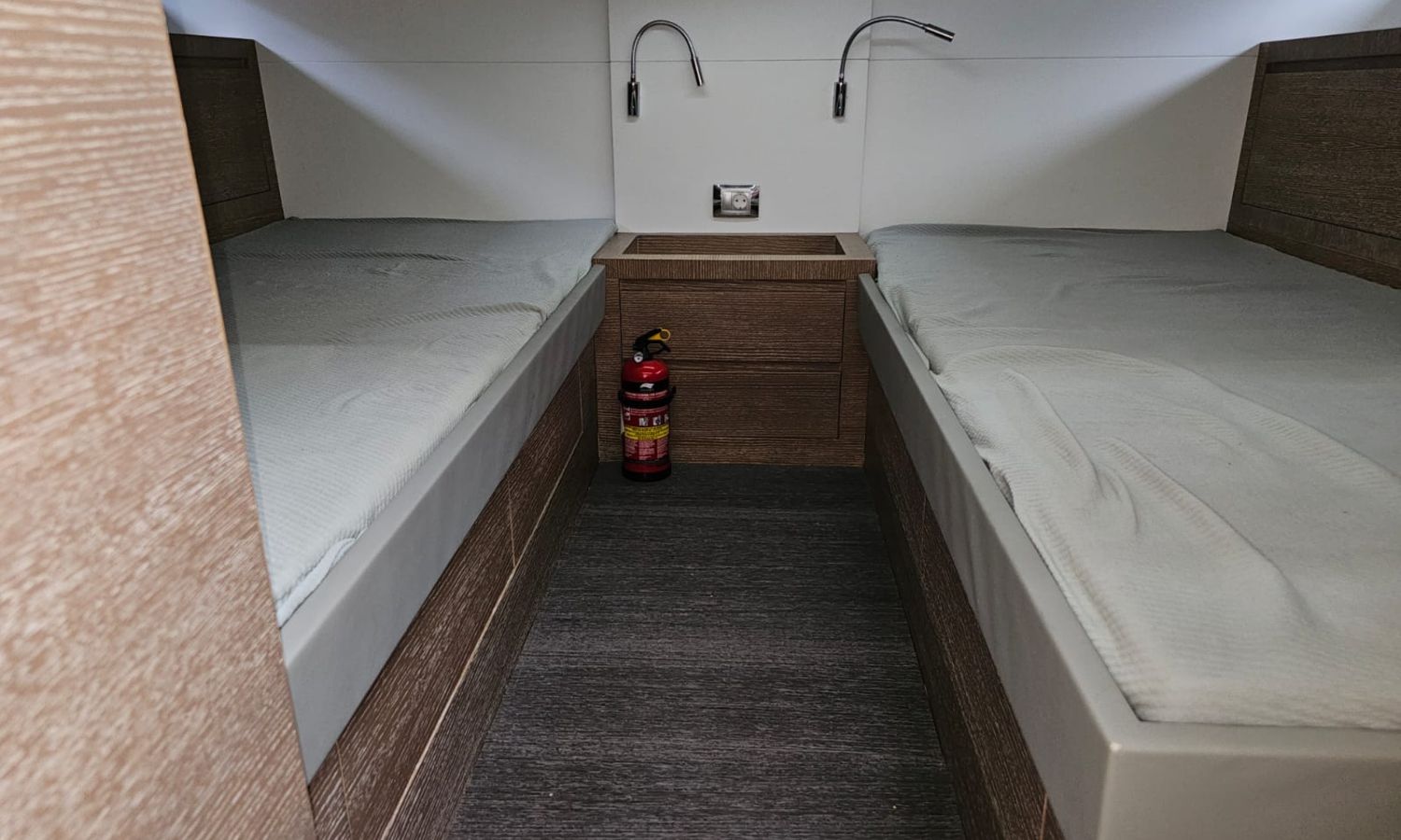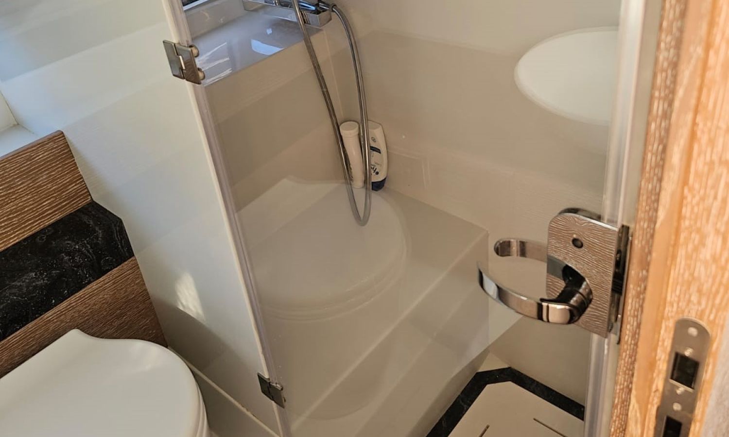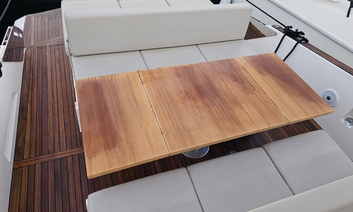 Cabina de invitados con dos camas - Nevera en cabina de 130 l - Generador - Aire acondicionado - Radio Fusion con altavoces - Funda de asientos pilotaje - Funda solárium y asientos popa - Funda solárium de proa - Luces de cortesía en cubierta - Mesa de bañera - Hard top - Toldo haima a popa con mástiles desmontables - Pasarela - Hélice de proa - 2 pantallas Raymarine Multidisplay Asion 12" - VHF - Piloto automático - Profundímetro - Contador de cadena - Cámara de maniobra - Pre-instalación para TV - Antifouling.Descripción embarcación