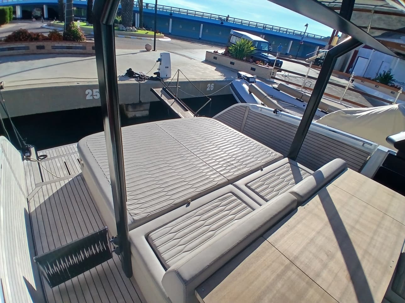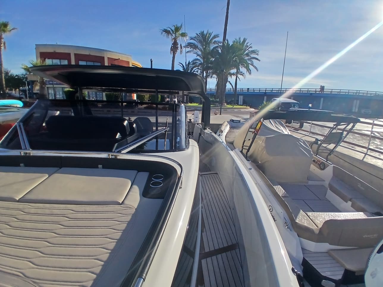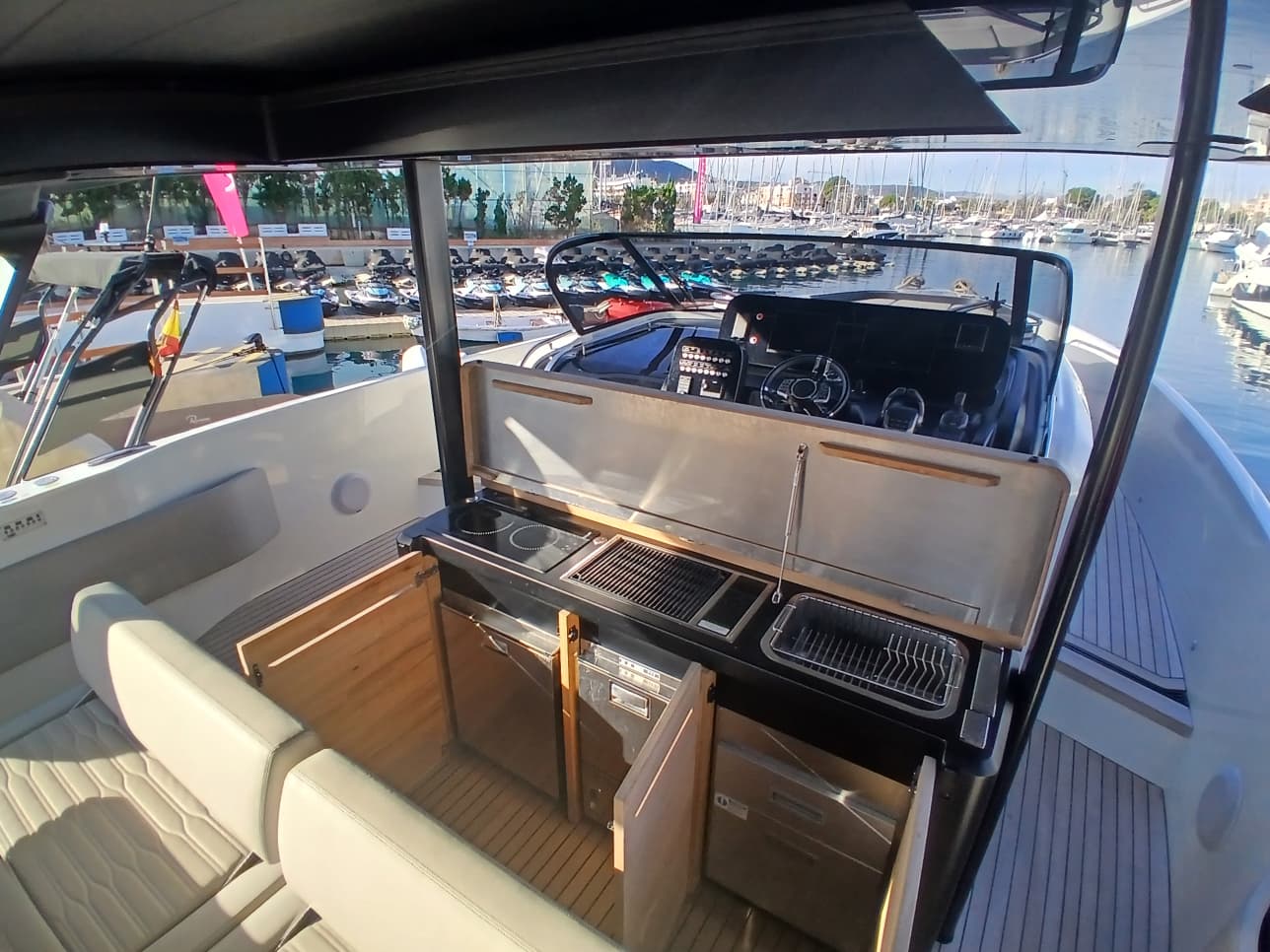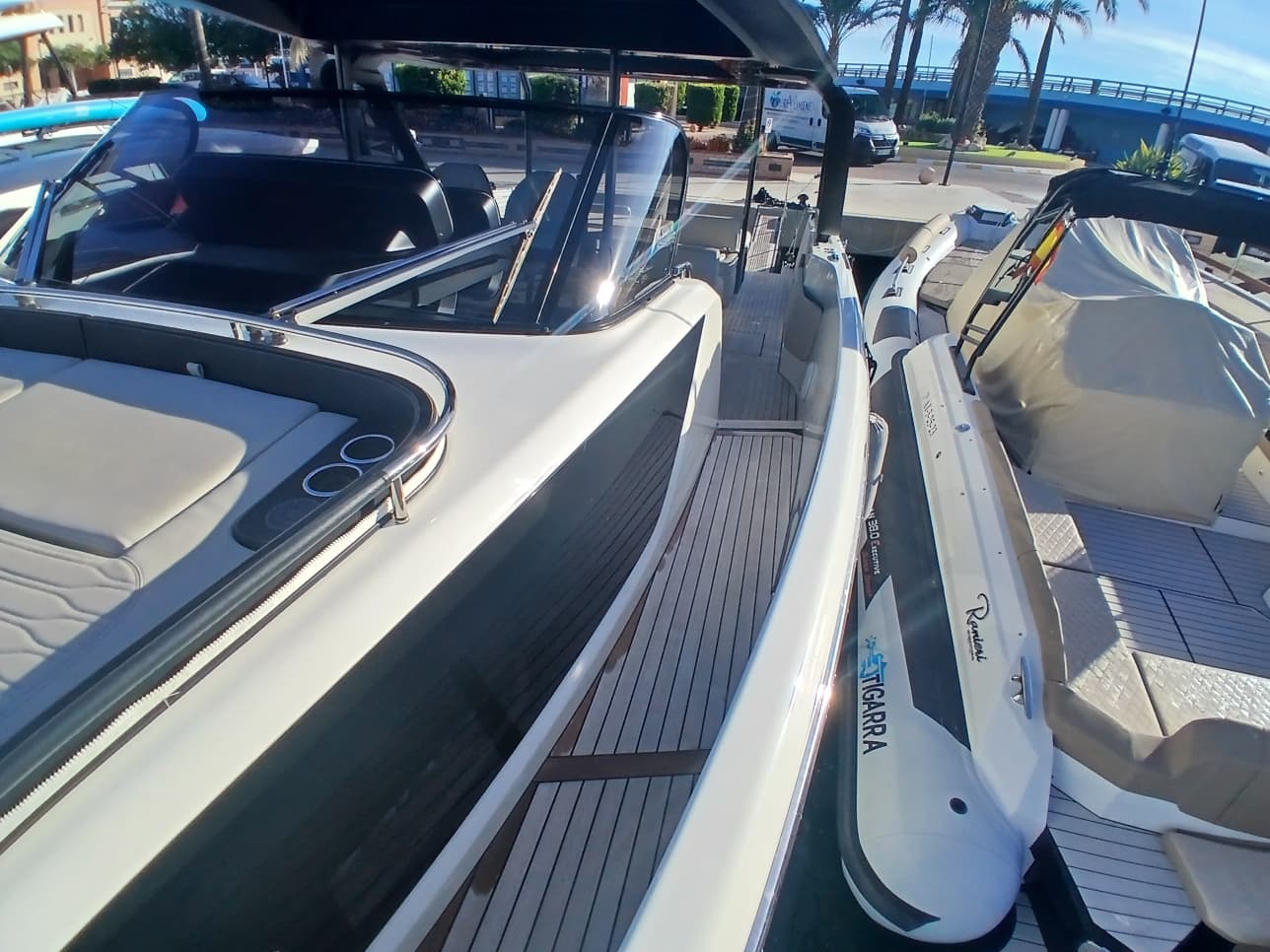 Depósito de aguas negras - Aire acondicionado 16.000 BTU en cabina con bomba de calor - Fundas (para cuadro de mandos, asiento piloto, sofá, mesa muebles y solárium de popa) - Correctores Automatic List + correctores de viraje Coordinated Turn Control - Hélice de proa - Nevera en bañera - Generador 8 kW - Barbacoa eléctrica en bañera - Máquina de hielo - Paredes laterales de popa plegables - Pasarela hidráulica - Piloto automático - Plataforma hidráulica subida/bajada - Bañera y paredes laterales plegables en teka - Superficie de teka en los trancaniles laterales - T-Top - VHF - Certificado CE - Banda de popa (marco lateral y plataforma) lacada - T-Top lacado - Preparación, botadura y entrega con prueba de mar - Transporte astillero a Costa Brava.Descripción embarcación