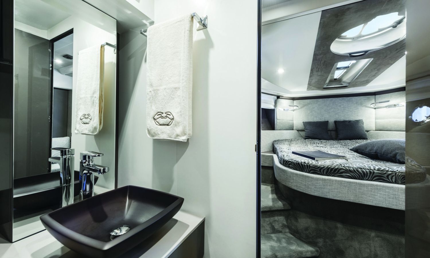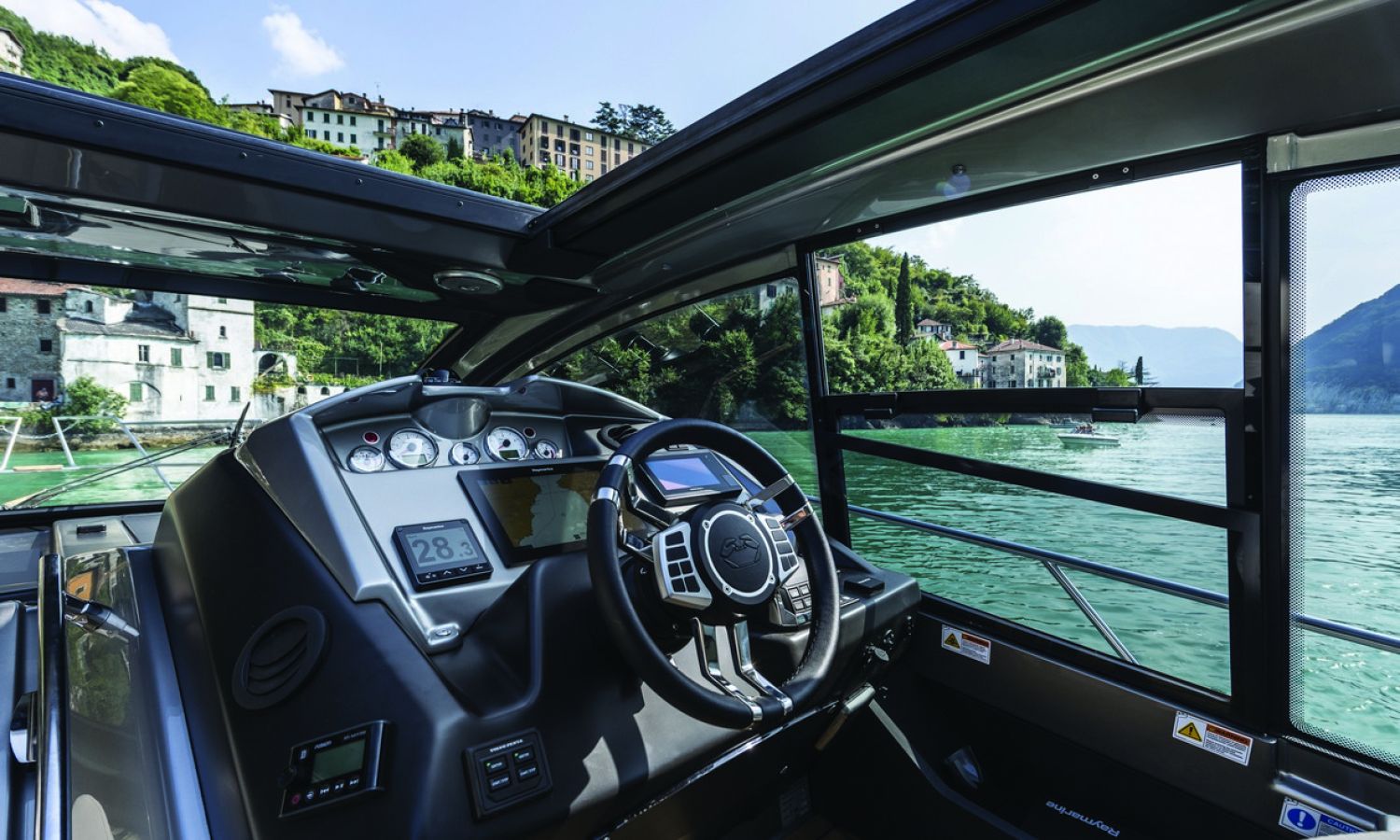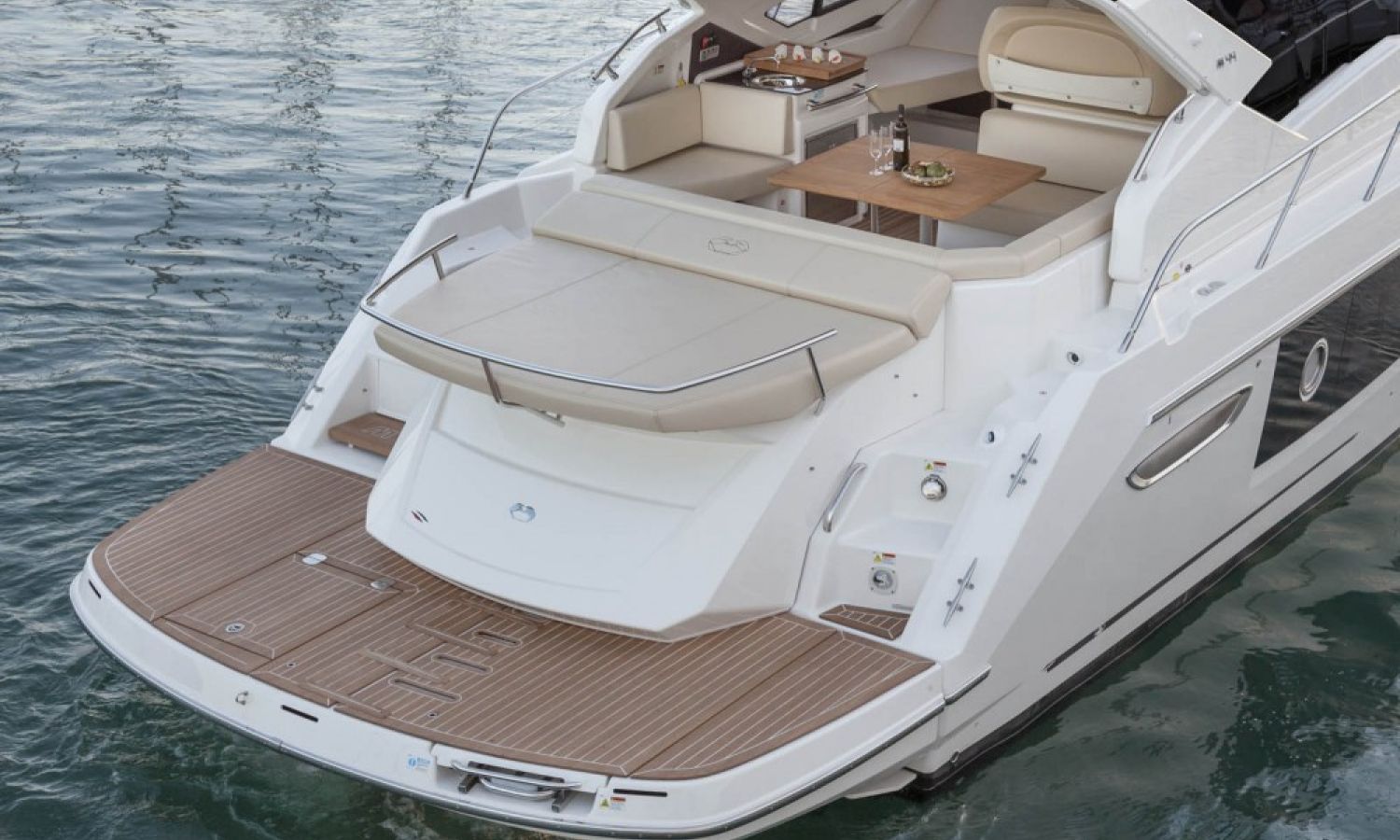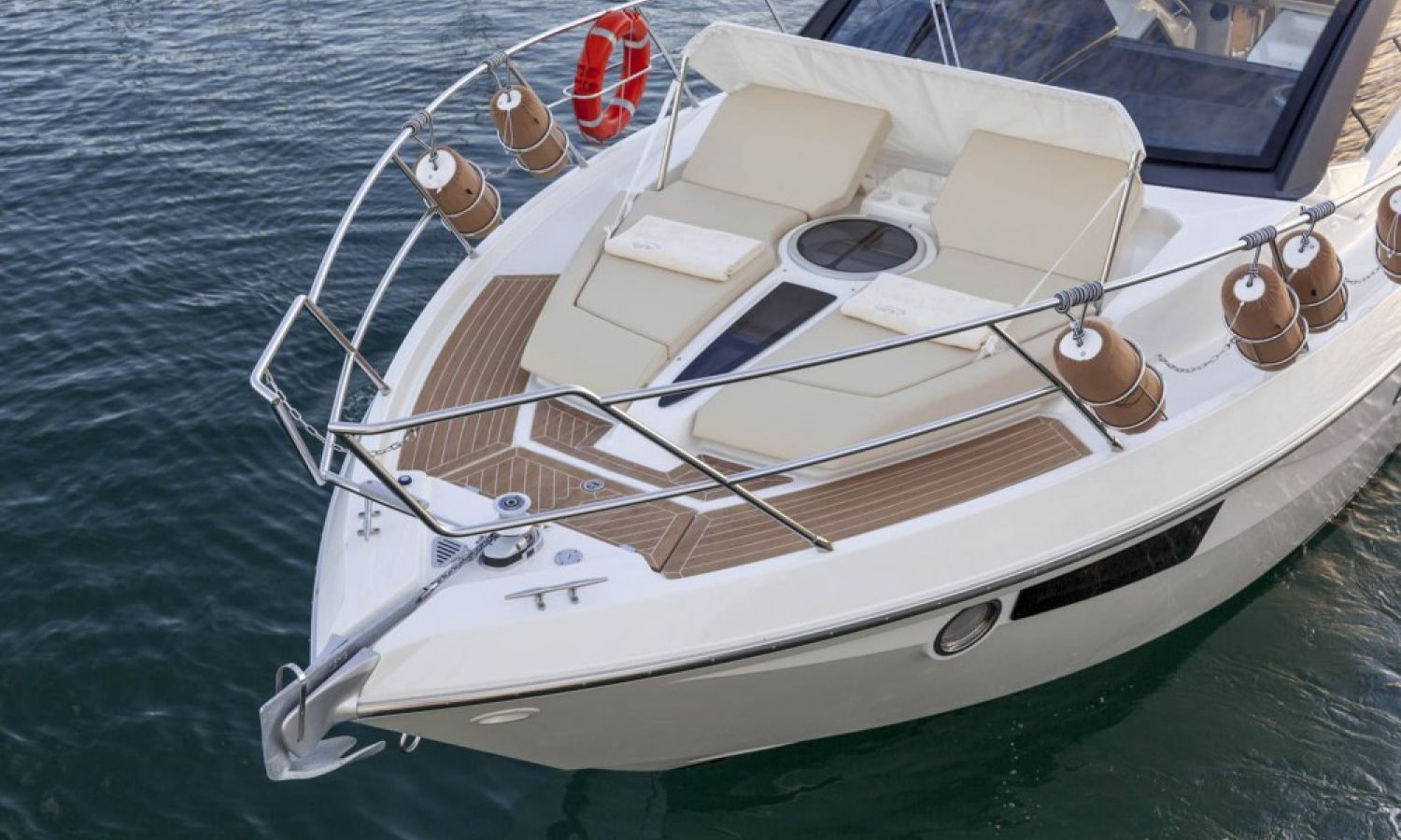 Embarcación con hard top y techo corredero de tela. Los grandes espacios interiores que incluyen 2 camarotes, 2 baños, una cocina y un salón proporcionan una inmediata sensación de confort y bienestar. La bañera tiene una capacidad excepcional, con 2 plazas en el puente de mando, un diván a babor, un amplio sofá, un mueble-bar y un gran solárium de popa bajo el cual está ubicado el garaje para la neumática auxiliar.