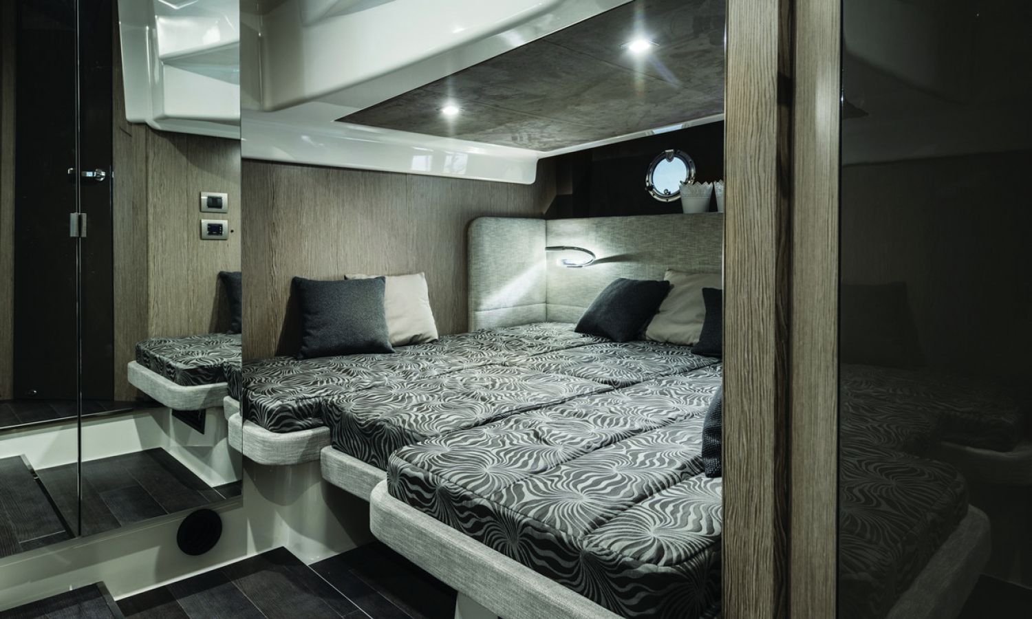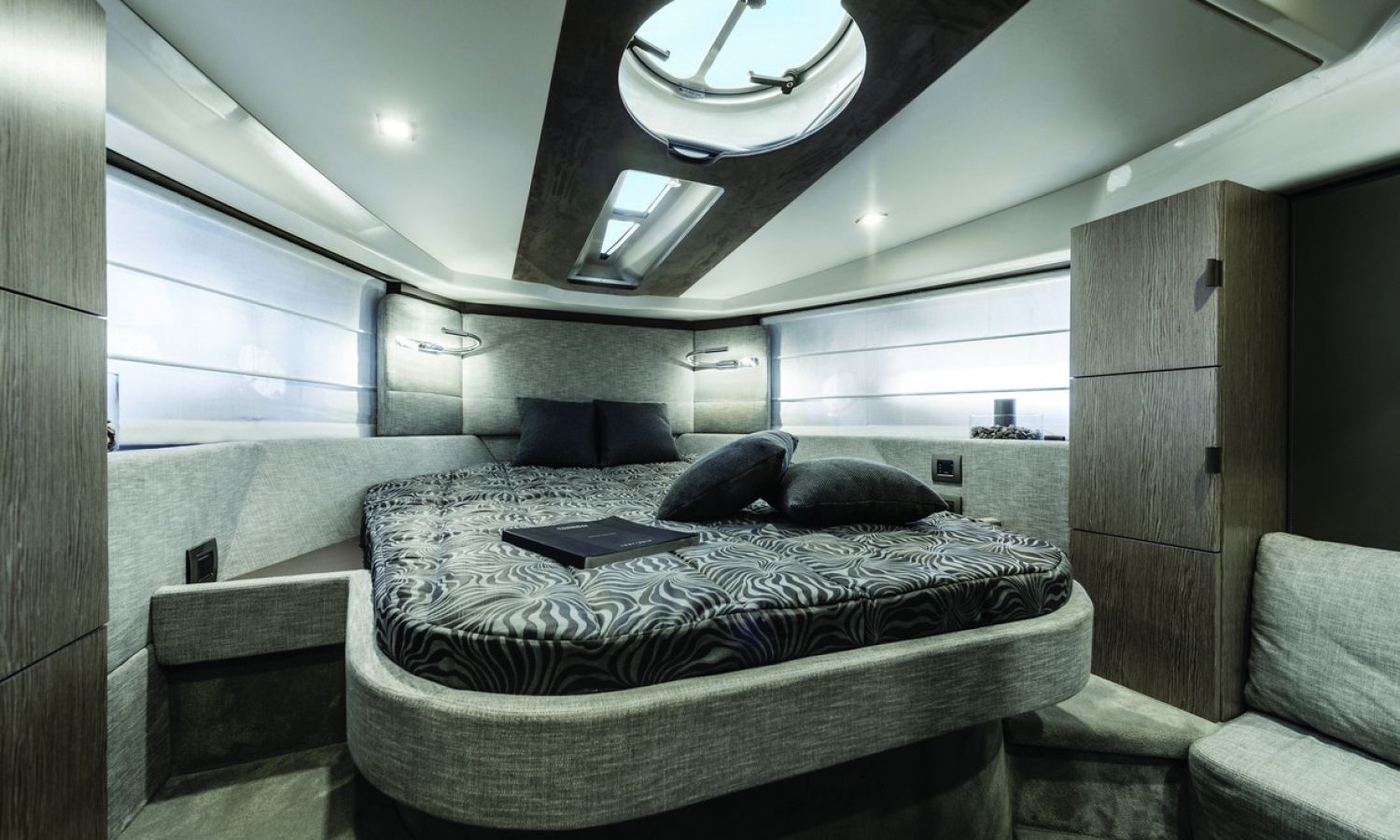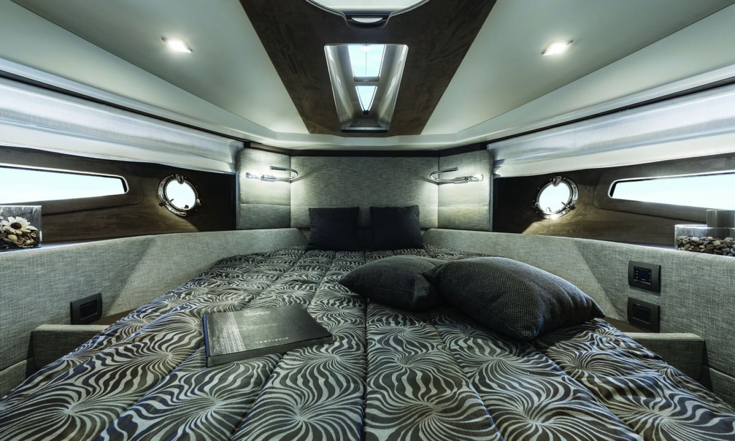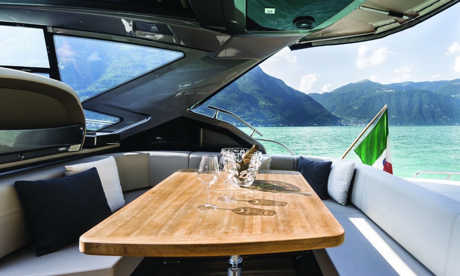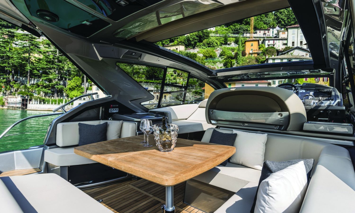 Embarcación con hard top y techo corredero de tela. Los grandes espacios interiores que incluyen 2 camarotes, 2 baños, una cocina y un salón proporcionan una inmediata sensación de confort y bienestar. La bañera tiene una capacidad excepcional, con 2 plazas en el puente de mando, un diván a babor, un amplio sofá, un mueble-bar y un gran solárium de popa bajo el cual está ubicado el garaje para la neumática auxiliar.