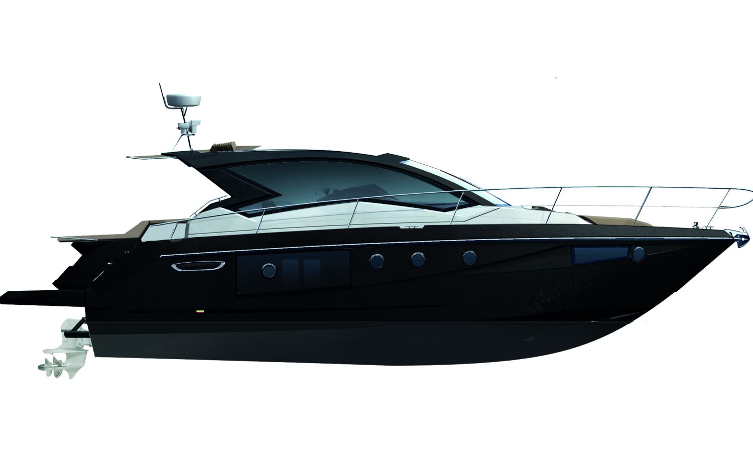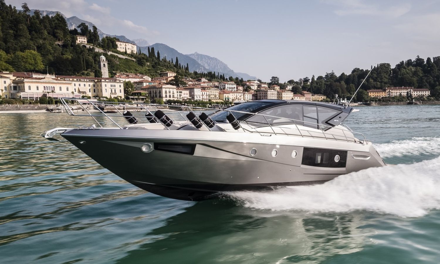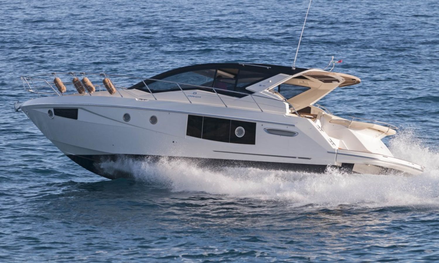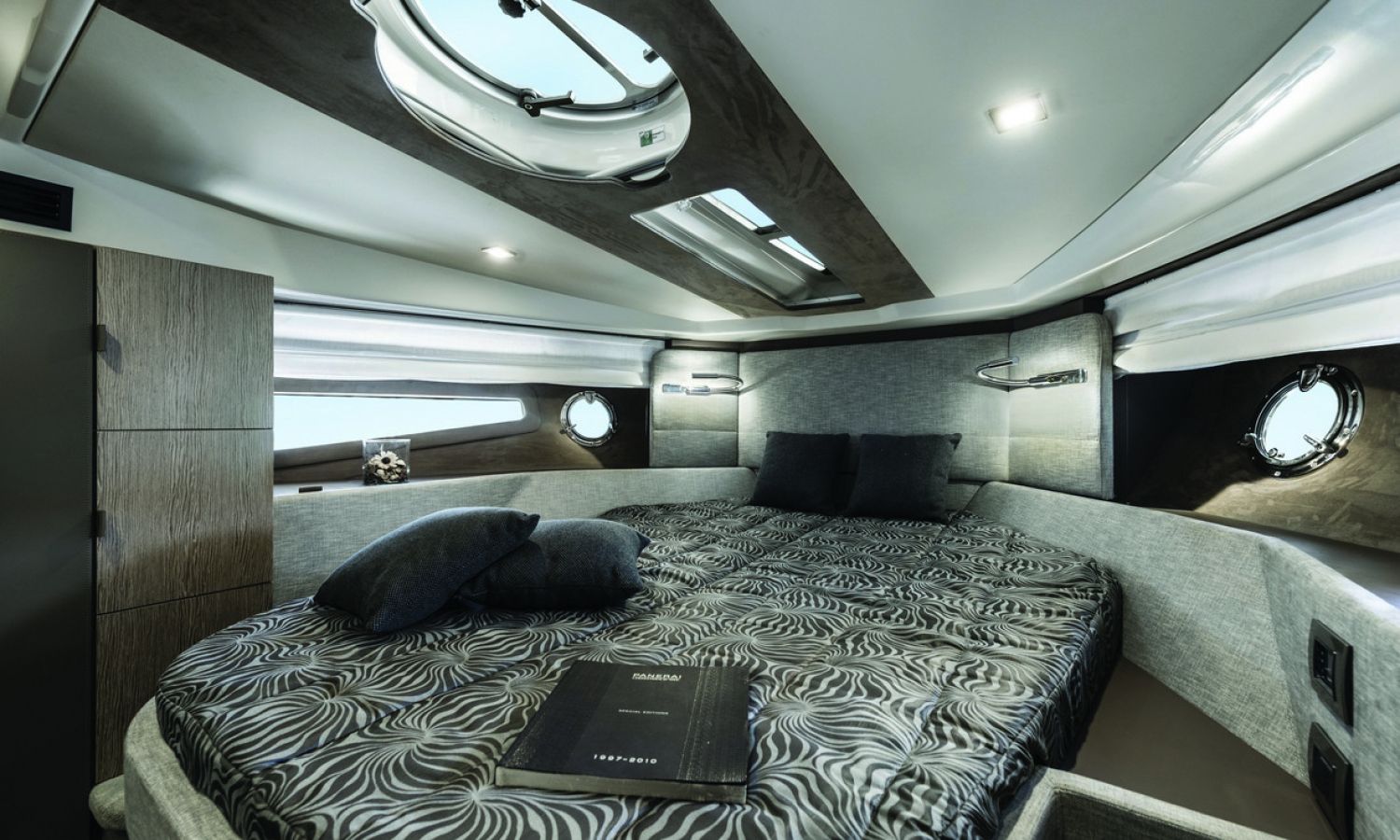 Embarcación con hard top y techo corredero de tela. Los grandes espacios interiores que incluyen 2 camarotes, 2 baños, una cocina y un salón proporcionan una inmediata sensación de confort y bienestar. La bañera tiene una capacidad excepcional, con 2 plazas en el puente de mando, un diván a babor, un amplio sofá, un mueble-bar y un gran solárium de popa bajo el cual está ubicado el garaje para la neumática auxiliar.