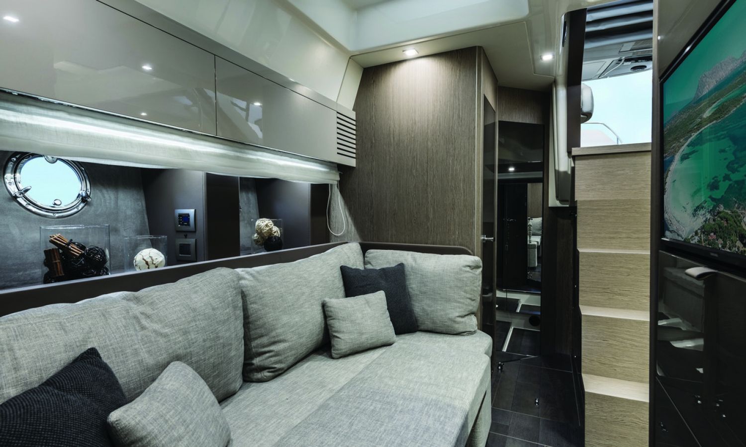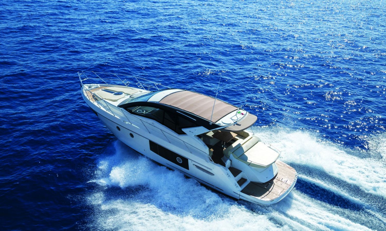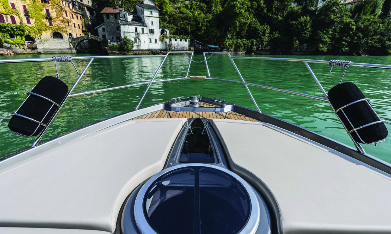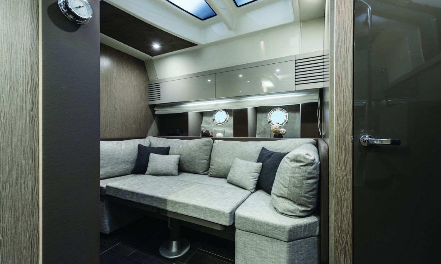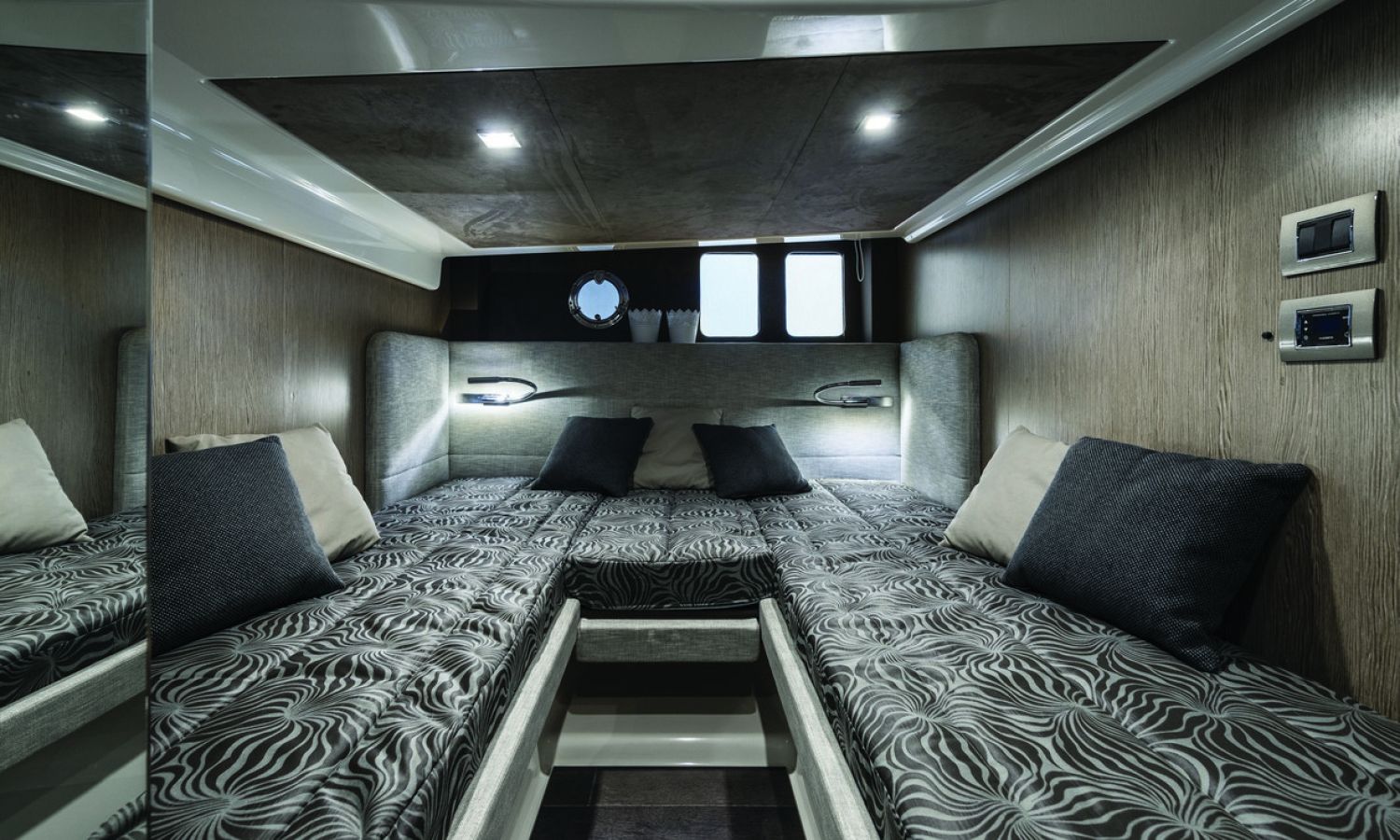 Embarcación con hard top y techo corredero de tela. Los grandes espacios interiores que incluyen 2 camarotes, 2 baños, una cocina y un salón proporcionan una inmediata sensación de confort y bienestar. La bañera tiene una capacidad excepcional, con 2 plazas en el puente de mando, un diván a babor, un amplio sofá, un mueble-bar y un gran solárium de popa bajo el cual está ubicado el garaje para la neumática auxiliar.