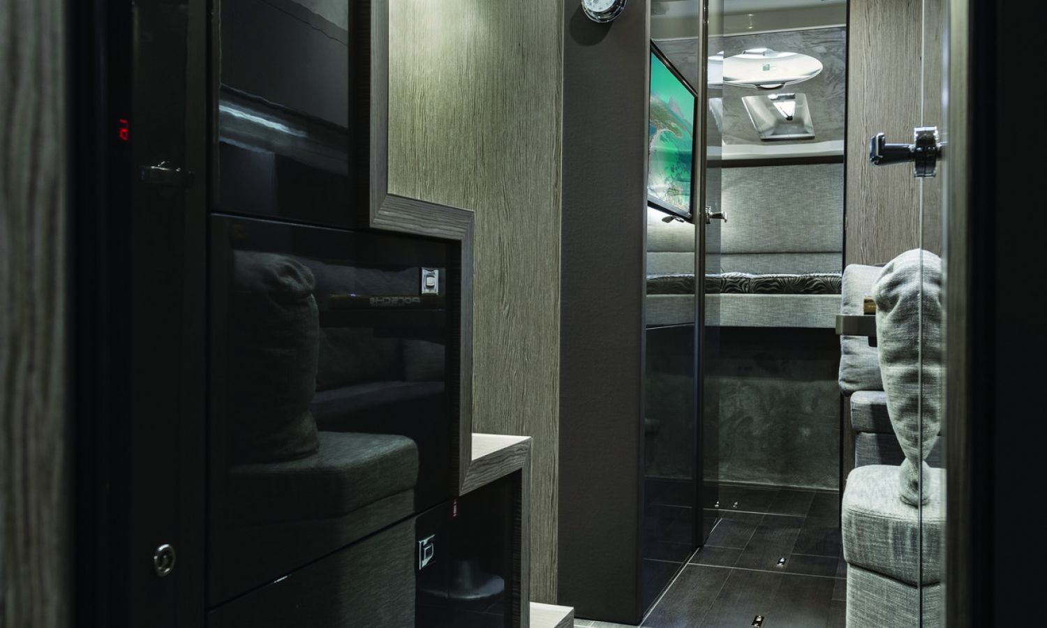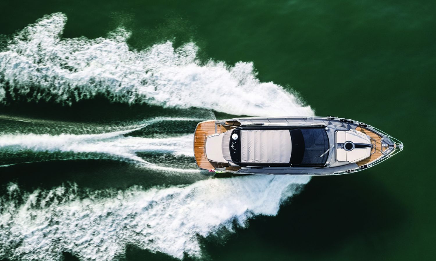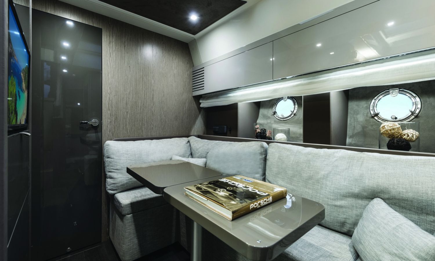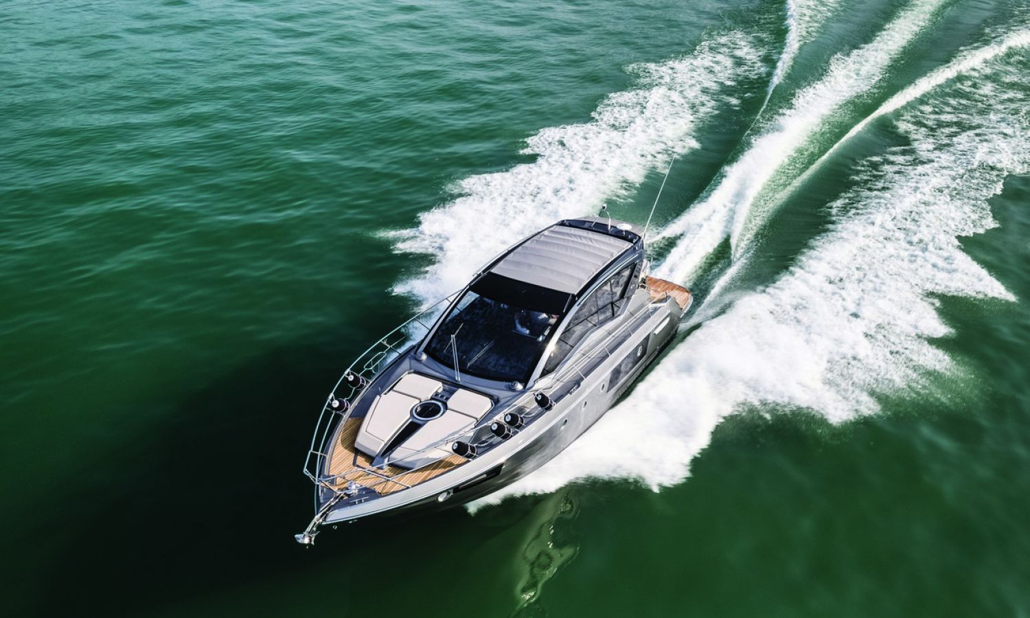 Embarcación con hard top y techo corredero de tela. Los grandes espacios interiores que incluyen 2 camarotes, 2 baños, una cocina y un salón proporcionan una inmediata sensación de confort y bienestar. La bañera tiene una capacidad excepcional, con 2 plazas en el puente de mando, un diván a babor, un amplio sofá, un mueble-bar y un gran solárium de popa bajo el cual está ubicado el garaje para la neumática auxiliar.