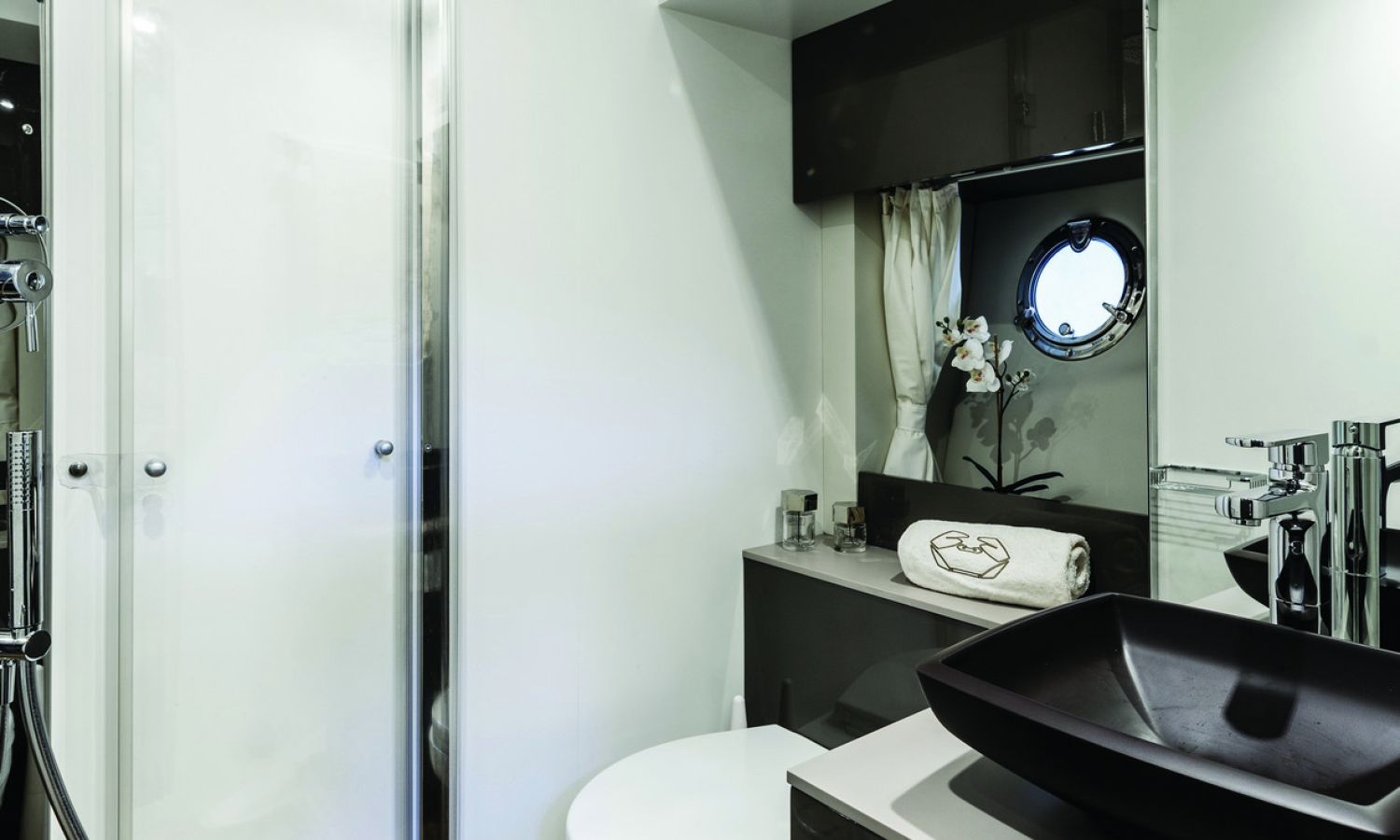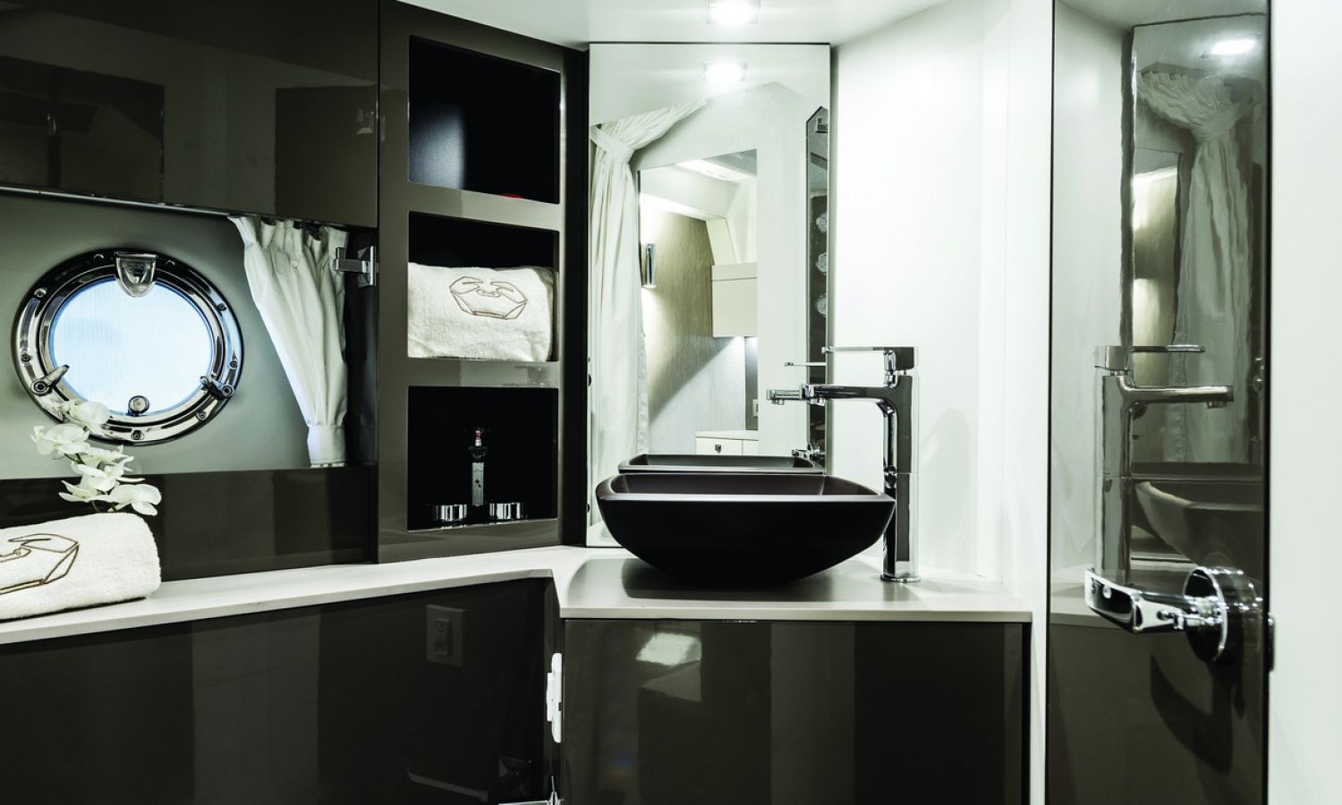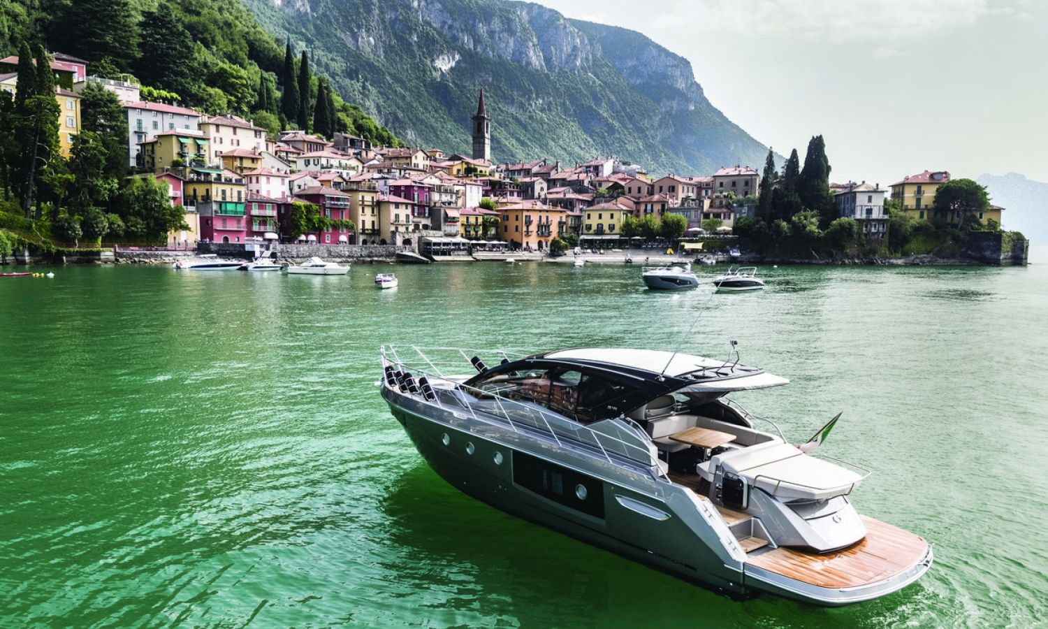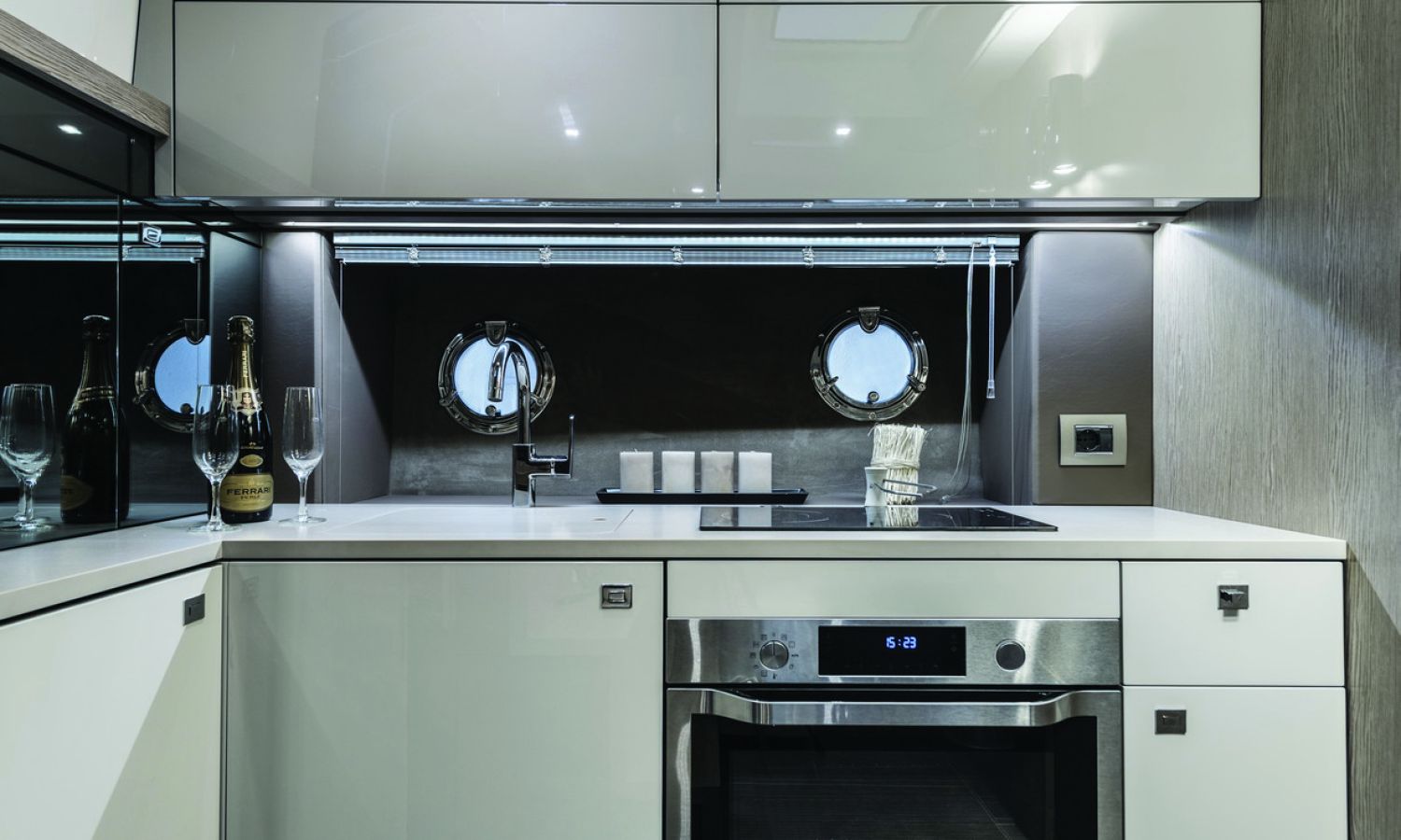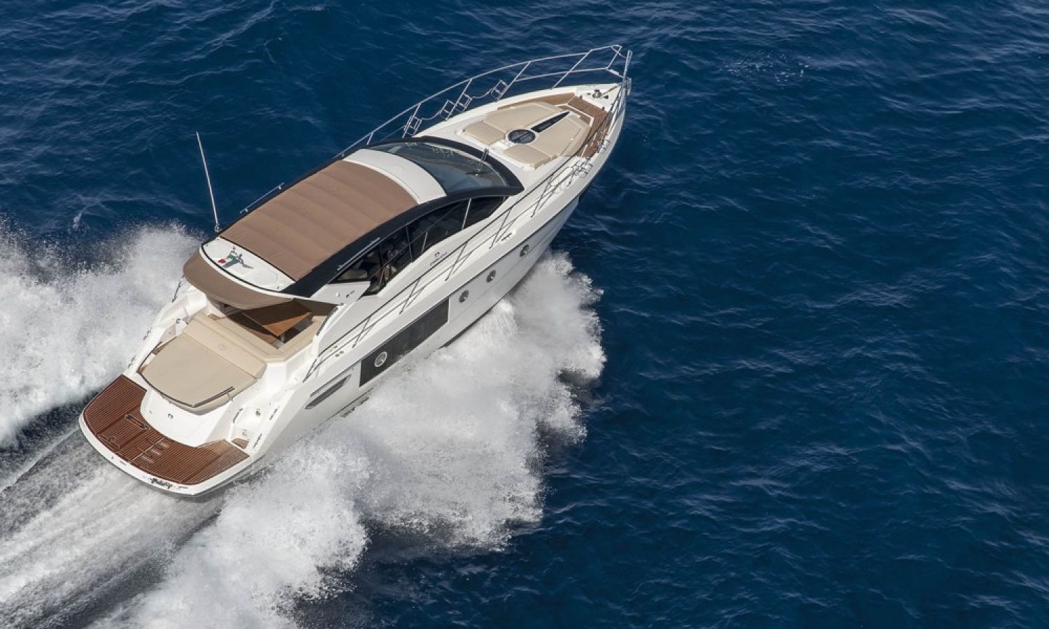 Embarcación con hard top y techo corredero de tela. Los grandes espacios interiores que incluyen 2 camarotes, 2 baños, una cocina y un salón proporcionan una inmediata sensación de confort y bienestar. La bañera tiene una capacidad excepcional, con 2 plazas en el puente de mando, un diván a babor, un amplio sofá, un mueble-bar y un gran solárium de popa bajo el cual está ubicado el garaje para la neumática auxiliar.