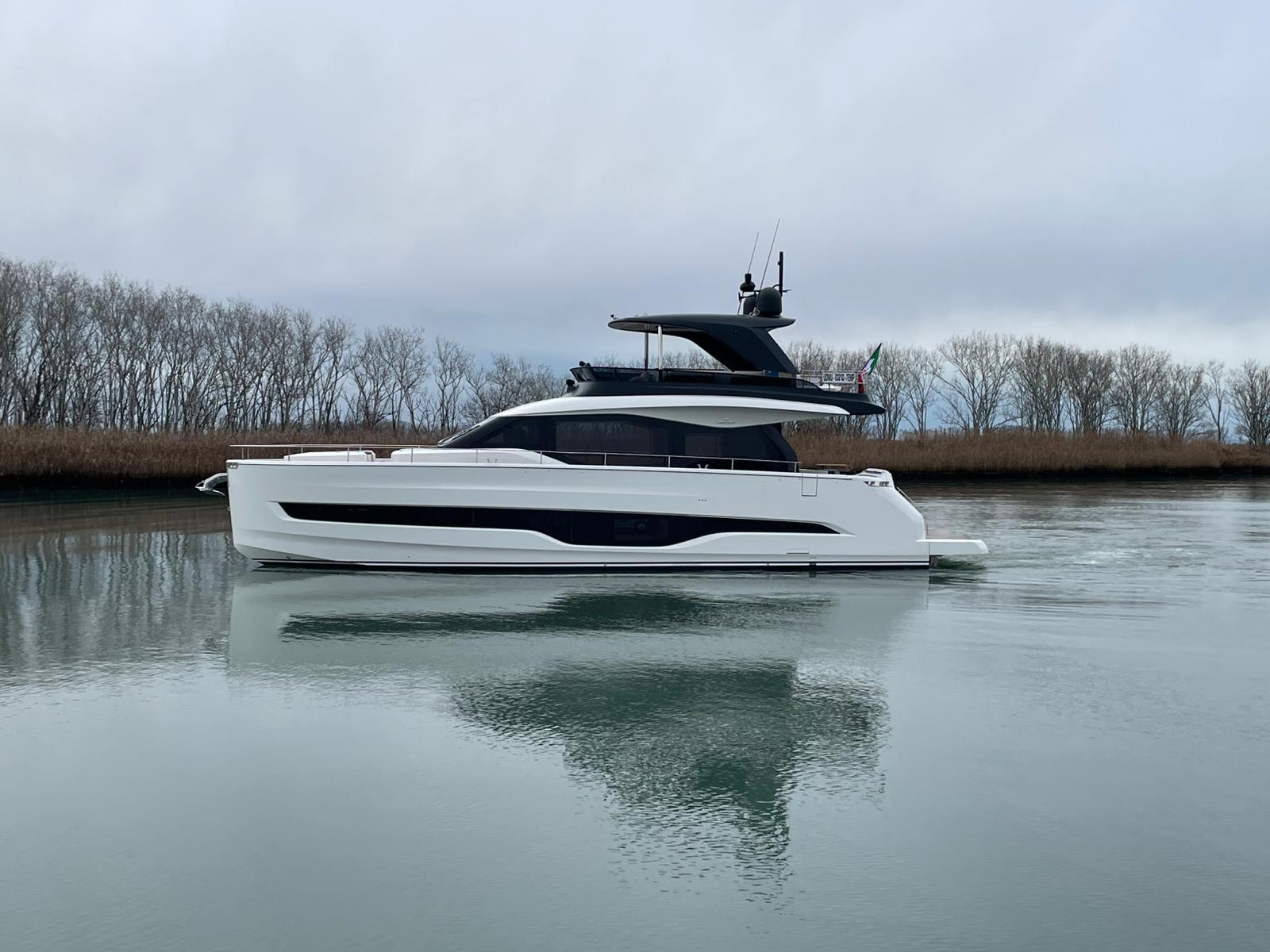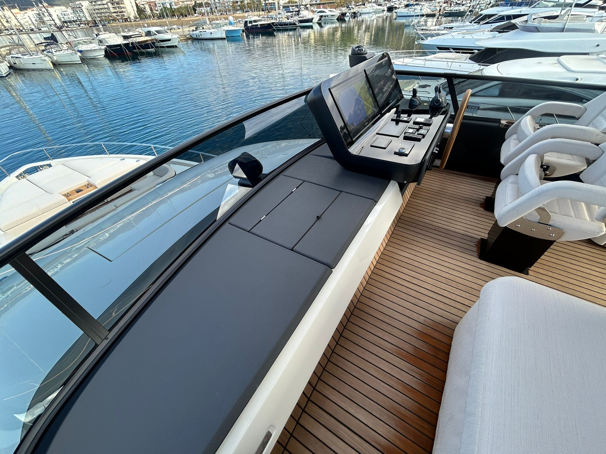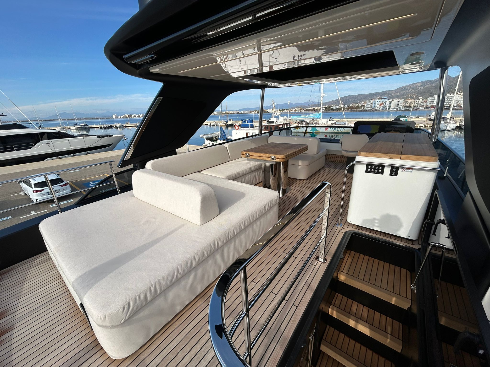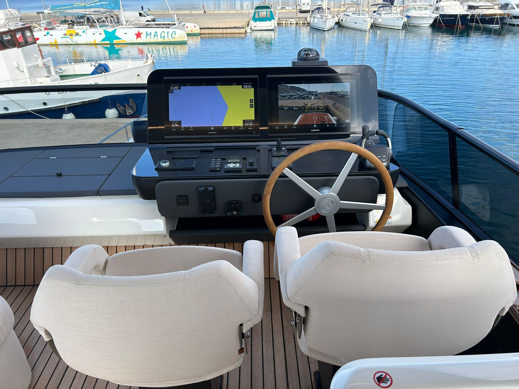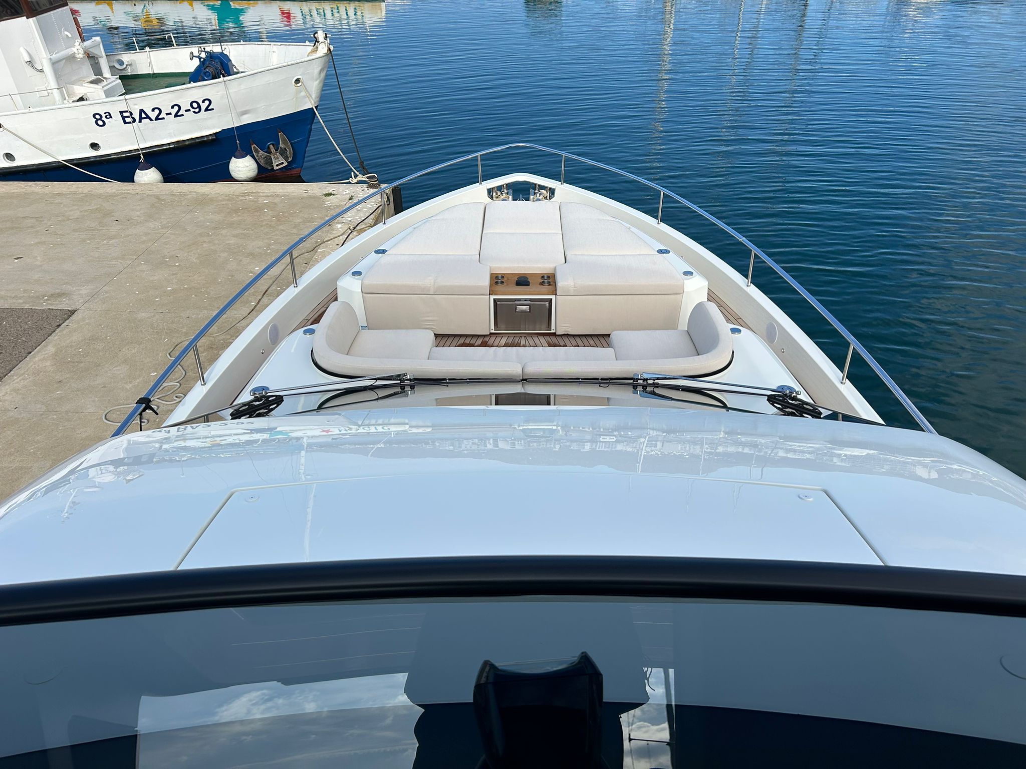 Ancla 60 Kg Ultramarine en acero inoxidable y cadena de acero inoxidable de 100 m - Enrolladores eléctricos cable línea de muelle de 20 m con mando a distancia - Zona de playa a popa: ducha con radio, luces y cargador inalámbrico para smartphone - Lino para 3 camarotes y cabina marinero: set de sábanas, fundas de almohadas, funda de colchón, colcha, toallas, etc. - Bidé en el baño de la cabina del armador - Bimini top de proa con palos de carbono - Cajafuerte electrónica en cabina armador - 6 cabos de amarre - Cobertura para dinette en bañera de popa - Coberturas flybridge - Desalinizadora 160 l/h con mando en cabina y sistema lavado con agua dulce - Hélice de proa proporcional - Faro pirata - Nevera en el sofá de la colchoneta de proa - Suplemento generador de 20,5 kW - Tercer puesto de mando en la bañera - Máquina de hielo con tanque de agua separado - Lavadora y secadora Miele - 7 Luces subacuáticas (3 a popa y 2 a cada lado) - Oscurantes para cristales de proa y laterales - Bimini top de popa vertical - Escotilla eléctrica en la timonería - Pasarela hidráulica telescópica retráctil - Fin Stabilizations System Humphree - Asiento interior copiloto - Puerta de acceso lateral a popa estribor - Puerta de acceso lateral a popa babor - Segunda pantalla plotter 22" en flybridge - Segunda pantalla plotter 22" en cubierta principal - Set de vajilla, vasos y cubiertos para 6 personas - Estabilizador giroscópico Seakeeper 9 - Surround view camera system Garmin - Superficie de teka en los trancaniles laterales proa/popa - Teka en el flybridge - Toldo de popa eléctrico en el flybridge - T-Top flybridge con láminas de apertura eléctrica - TV LED en salón con dispositivo eléctrico retráctil y sistema Home Theatre - TV 55" LED en cabina del armador y radio Bluetooth/USB - TV 43" LED en la cabina VIP y radio Bluetooth/USB - Certificado CE y declaración de conformidad - Transporte, montaje con varada y control general en el Cranchi Marine Test Centre en Venecia - Suplemento transporte T-Top - Decoración interior "Amalfi": combinación de colores de los muebles, suelos de madera, tejidos y mármoles - Pintura de la línea de belleza en el casco de color negro - T-Top lacado negro - 2 Cúpulas vacías para antena satélite TV6/60 cm.Descripción embarcación