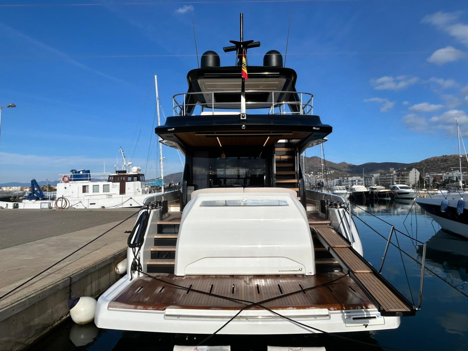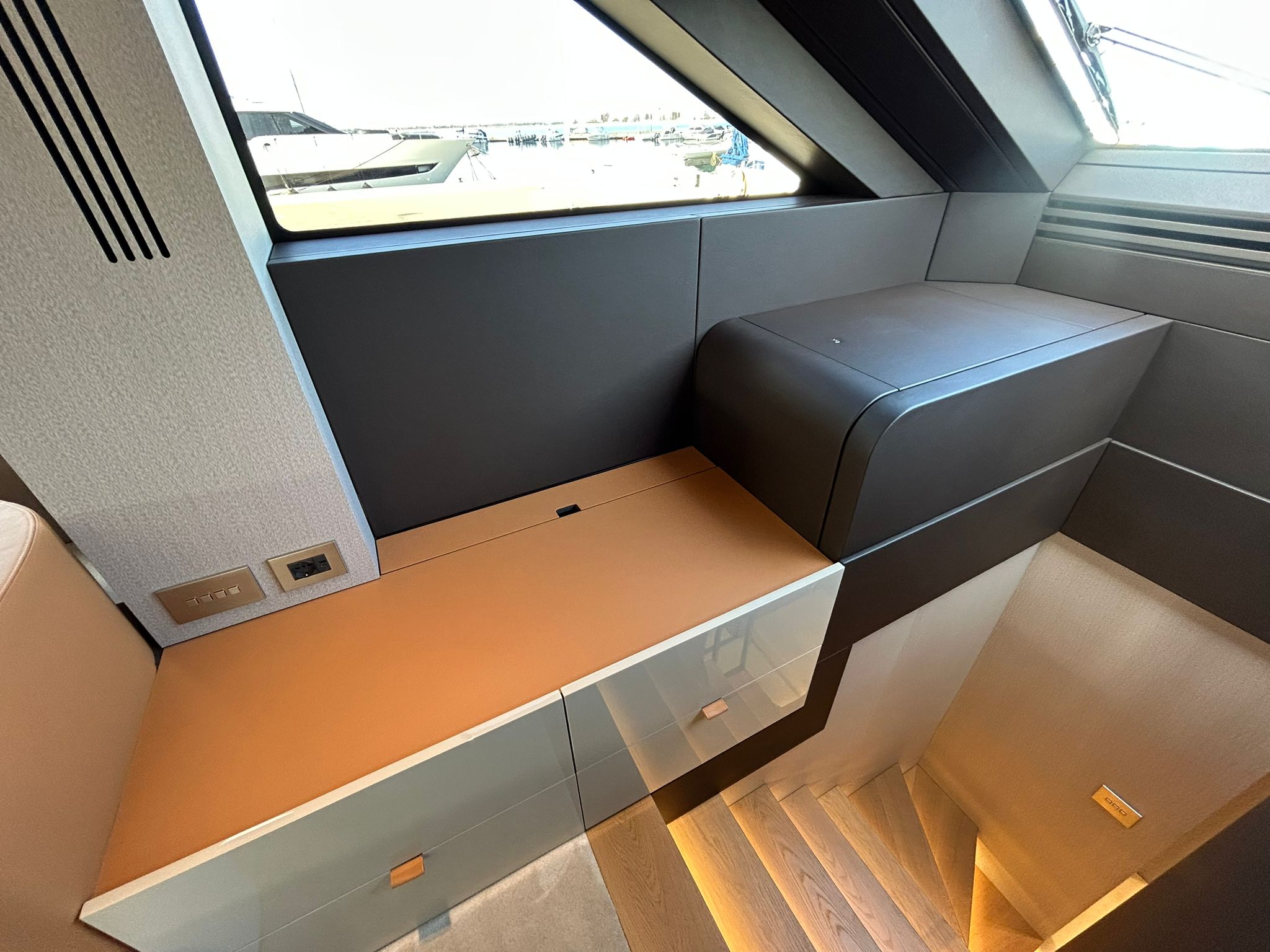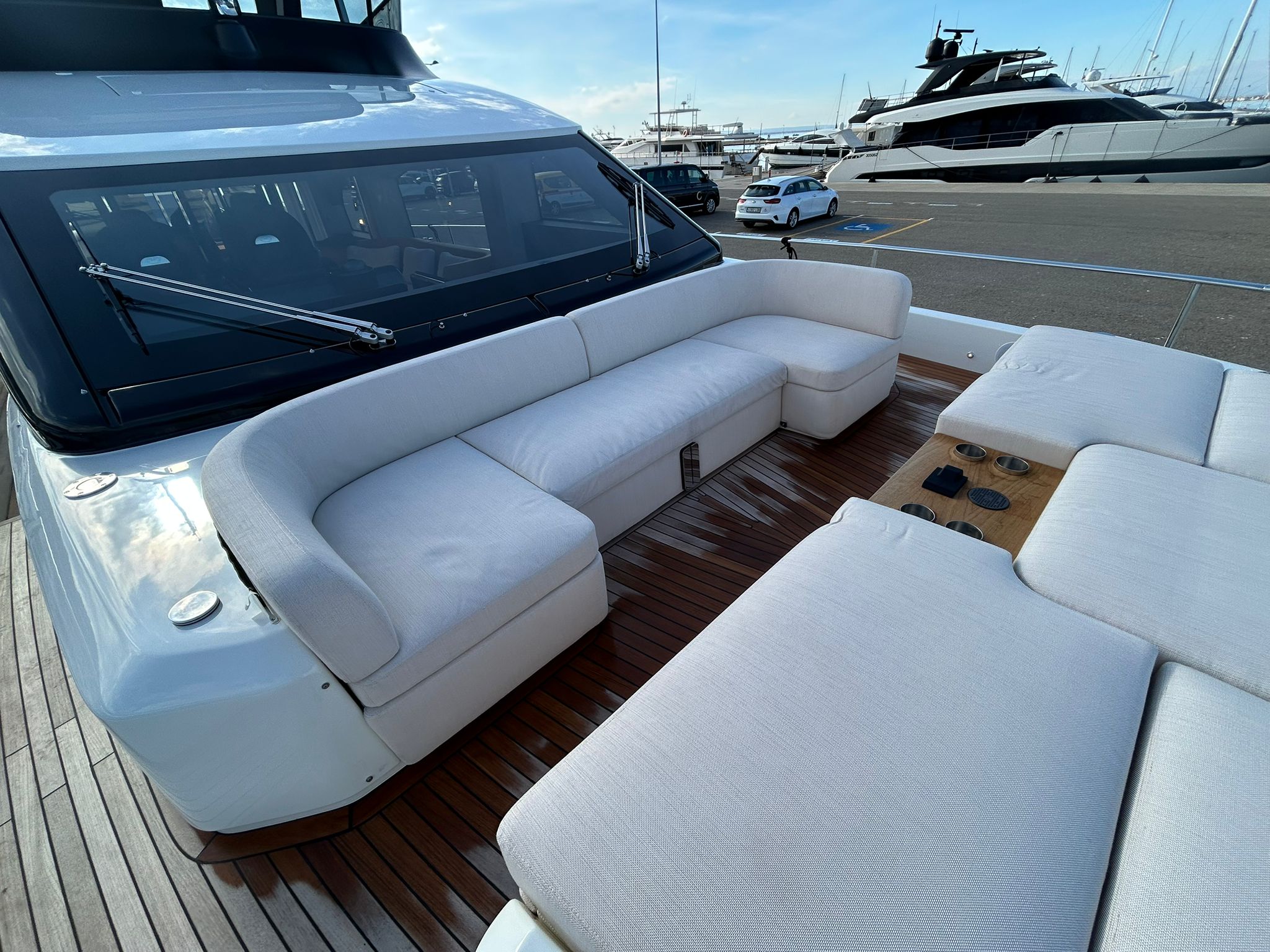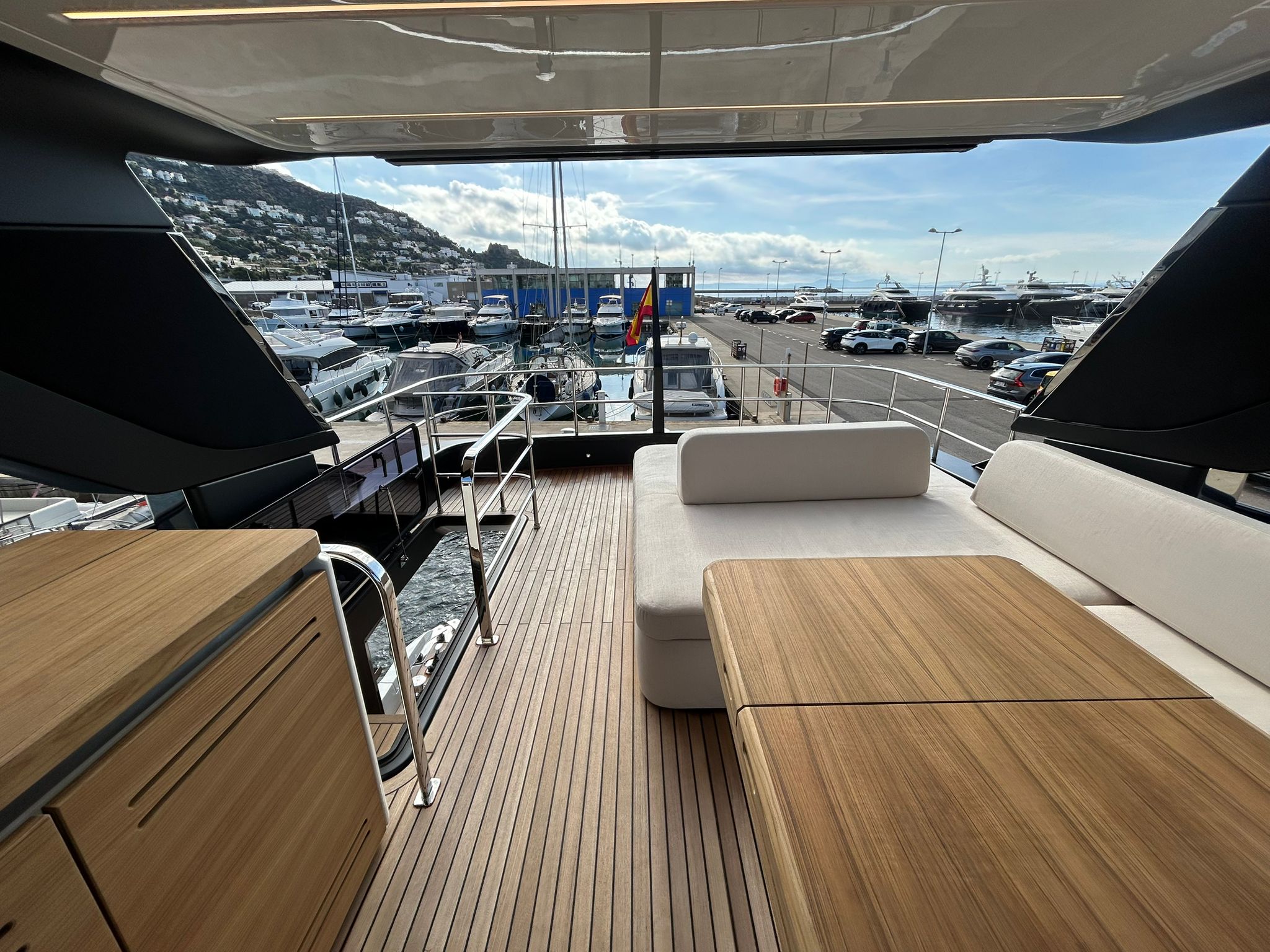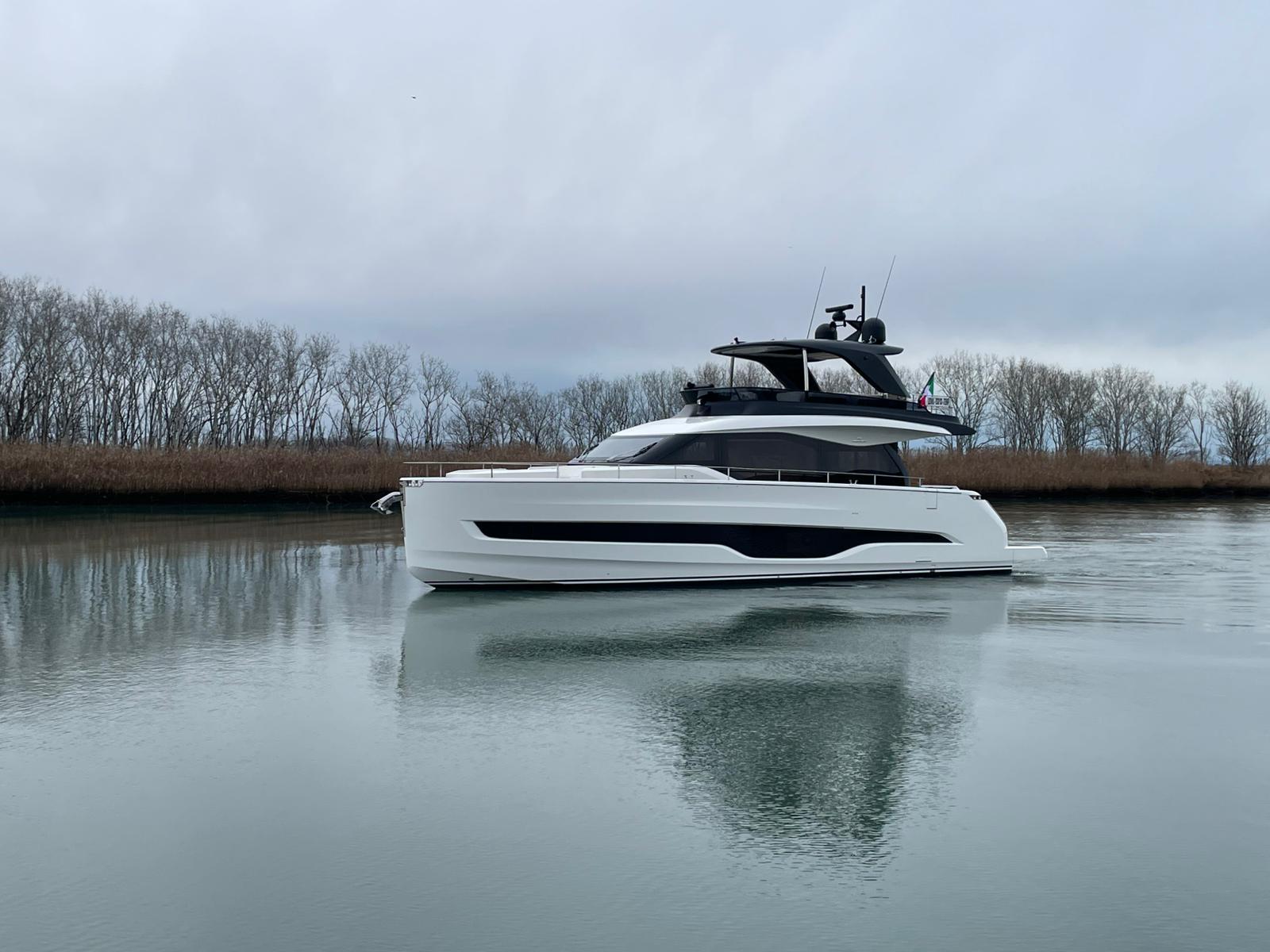 Ancla 60 Kg Ultramarine en acero inoxidable y cadena de acero inoxidable de 100 m - Enrolladores eléctricos cable línea de muelle de 20 m con mando a distancia - Zona de playa a popa: ducha con radio, luces y cargador inalámbrico para smartphone - Lino para 3 camarotes y cabina marinero: set de sábanas, fundas de almohadas, funda de colchón, colcha, toallas, etc. - Bidé en el baño de la cabina del armador - Bimini top de proa con palos de carbono - Cajafuerte electrónica en cabina armador - 6 cabos de amarre - Cobertura para dinette en bañera de popa - Coberturas flybridge - Desalinizadora 160 l/h con mando en cabina y sistema lavado con agua dulce - Hélice de proa proporcional - Faro pirata - Nevera en el sofá de la colchoneta de proa - Suplemento generador de 20,5 kW - Tercer puesto de mando en la bañera - Máquina de hielo con tanque de agua separado - Lavadora y secadora Miele - 7 Luces subacuáticas (3 a popa y 2 a cada lado) - Oscurantes para cristales de proa y laterales - Bimini top de popa vertical - Escotilla eléctrica en la timonería - Pasarela hidráulica telescópica retráctil - Fin Stabilizations System Humphree - Asiento interior copiloto - Puerta de acceso lateral a popa estribor - Puerta de acceso lateral a popa babor - Segunda pantalla plotter 22" en flybridge - Segunda pantalla plotter 22" en cubierta principal - Set de vajilla, vasos y cubiertos para 6 personas - Estabilizador giroscópico Seakeeper 9 - Surround view camera system Garmin - Superficie de teka en los trancaniles laterales proa/popa - Teka en el flybridge - Toldo de popa eléctrico en el flybridge - T-Top flybridge con láminas de apertura eléctrica - TV LED en salón con dispositivo eléctrico retráctil y sistema Home Theatre - TV 55" LED en cabina del armador y radio Bluetooth/USB - TV 43" LED en la cabina VIP y radio Bluetooth/USB - Certificado CE y declaración de conformidad - Transporte, montaje con varada y control general en el Cranchi Marine Test Centre en Venecia - Suplemento transporte T-Top - Decoración interior "Amalfi": combinación de colores de los muebles, suelos de madera, tejidos y mármoles - Pintura de la línea de belleza en el casco de color negro - T-Top lacado negro - 2 Cúpulas vacías para antena satélite TV6/60 cm.Descripción embarcación