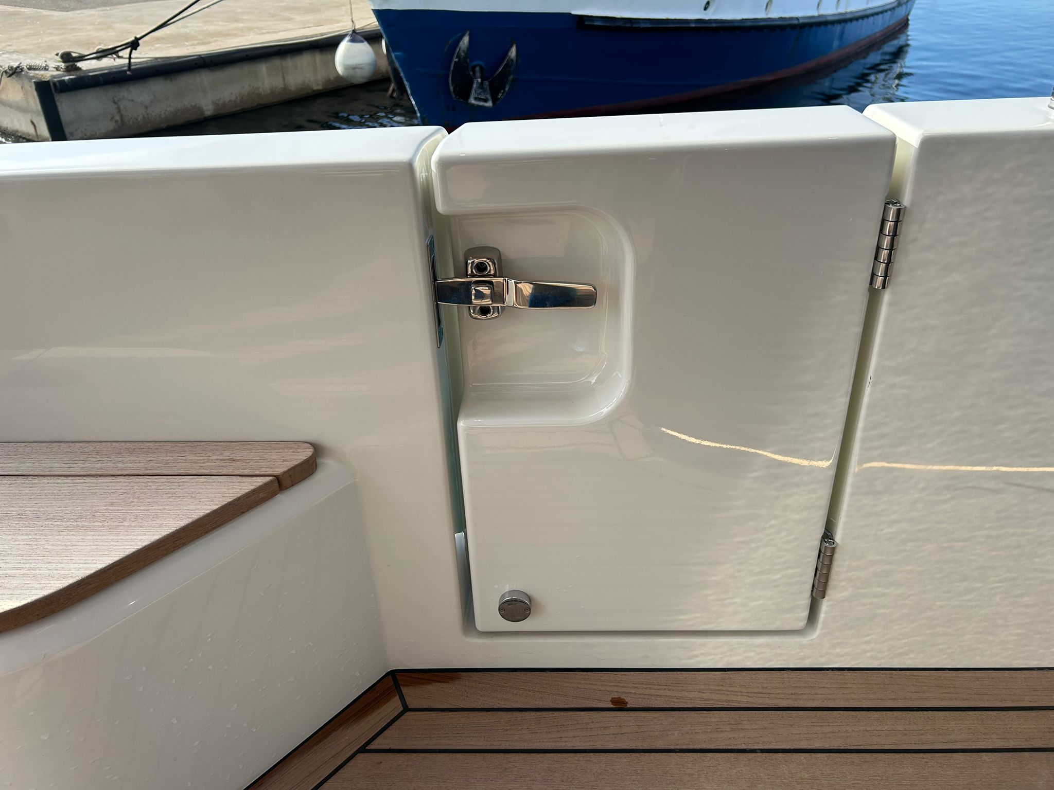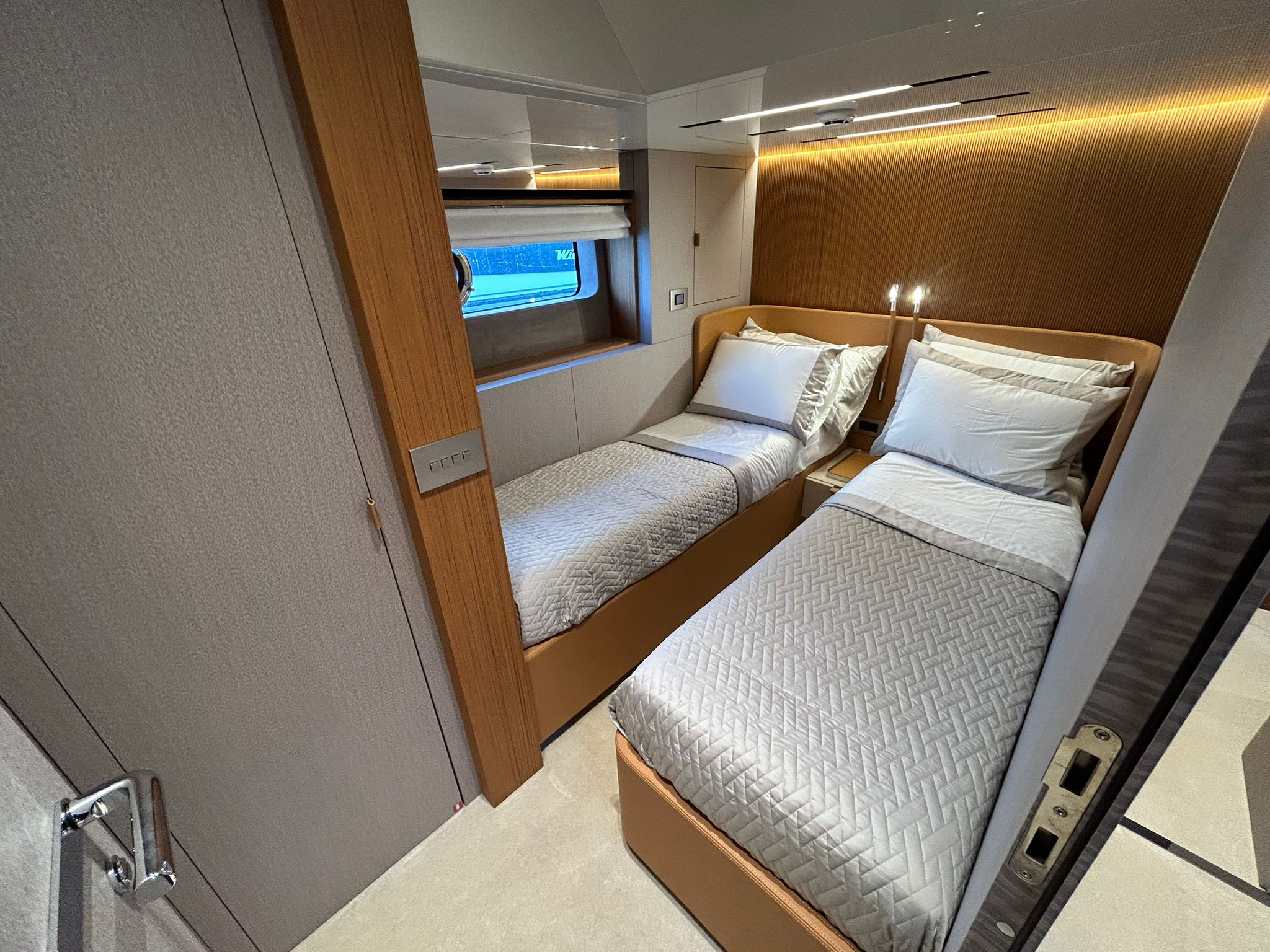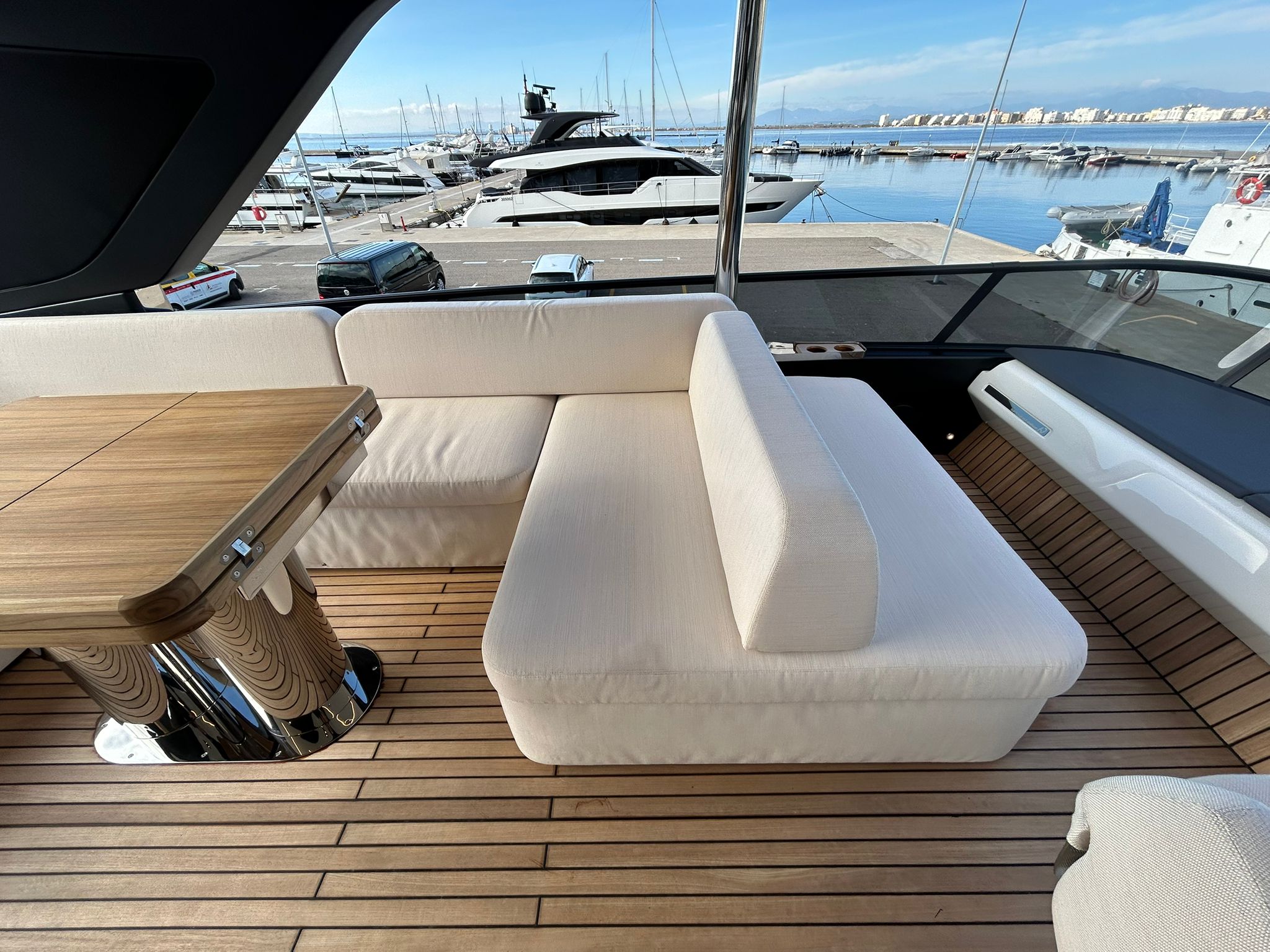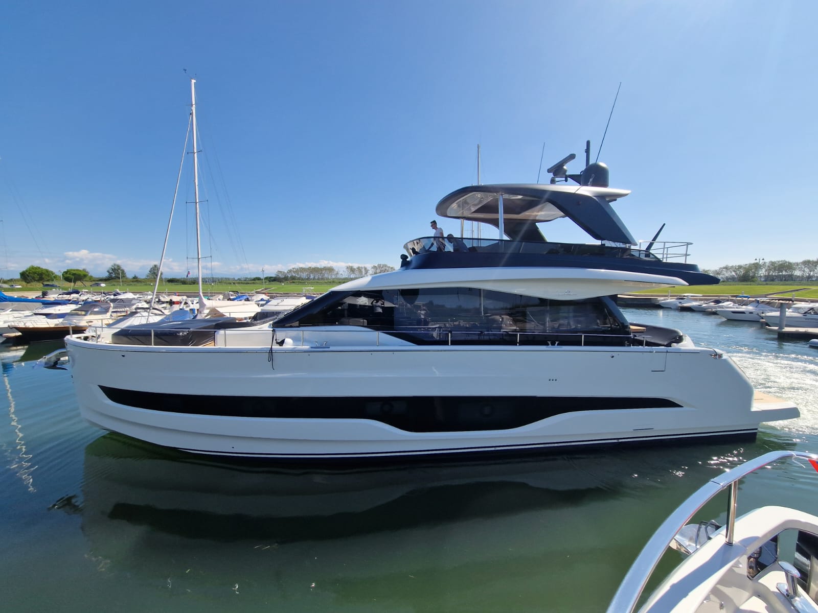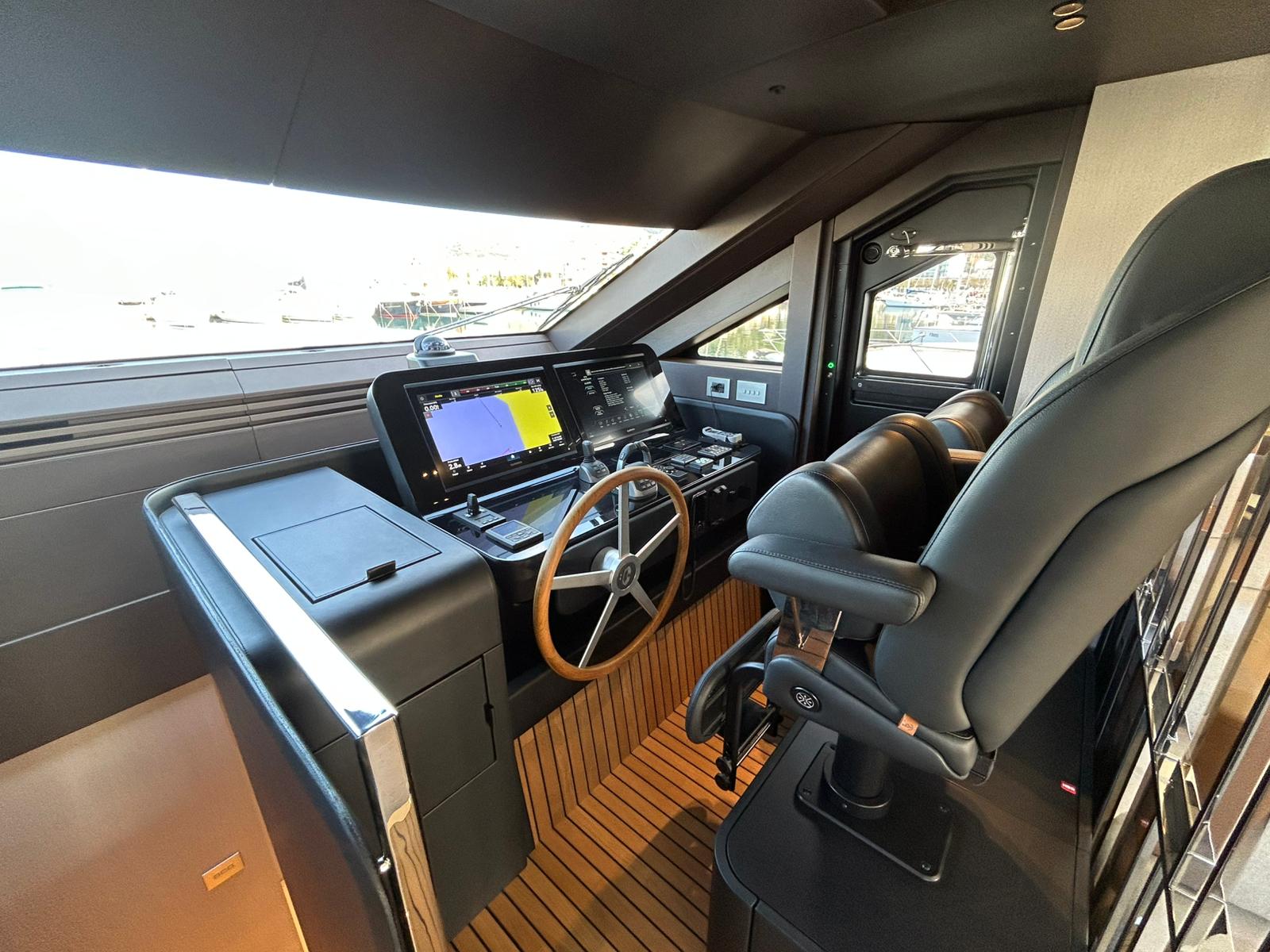 Ancla 60 Kg Ultramarine en acero inoxidable y cadena de acero inoxidable de 100 m - Enrolladores eléctricos cable línea de muelle de 20 m con mando a distancia - Zona de playa a popa: ducha con radio, luces y cargador inalámbrico para smartphone - Lino para 3 camarotes y cabina marinero: set de sábanas, fundas de almohadas, funda de colchón, colcha, toallas, etc. - Bidé en el baño de la cabina del armador - Bimini top de proa con palos de carbono - Cajafuerte electrónica en cabina armador - 6 cabos de amarre - Cobertura para dinette en bañera de popa - Coberturas flybridge - Desalinizadora 160 l/h con mando en cabina y sistema lavado con agua dulce - Hélice de proa proporcional - Faro pirata - Nevera en el sofá de la colchoneta de proa - Suplemento generador de 20,5 kW - Tercer puesto de mando en la bañera - Máquina de hielo con tanque de agua separado - Lavadora y secadora Miele - 7 Luces subacuáticas (3 a popa y 2 a cada lado) - Oscurantes para cristales de proa y laterales - Bimini top de popa vertical - Escotilla eléctrica en la timonería - Pasarela hidráulica telescópica retráctil - Fin Stabilizations System Humphree - Asiento interior copiloto - Puerta de acceso lateral a popa estribor - Puerta de acceso lateral a popa babor - Segunda pantalla plotter 22" en flybridge - Segunda pantalla plotter 22" en cubierta principal - Set de vajilla, vasos y cubiertos para 6 personas - Estabilizador giroscópico Seakeeper 9 - Surround view camera system Garmin - Superficie de teka en los trancaniles laterales proa/popa - Teka en el flybridge - Toldo de popa eléctrico en el flybridge - T-Top flybridge con láminas de apertura eléctrica - TV LED en salón con dispositivo eléctrico retráctil y sistema Home Theatre - TV 55" LED en cabina del armador y radio Bluetooth/USB - TV 43" LED en la cabina VIP y radio Bluetooth/USB - Certificado CE y declaración de conformidad - Transporte, montaje con varada y control general en el Cranchi Marine Test Centre en Venecia - Suplemento transporte T-Top - Decoración interior "Amalfi": combinación de colores de los muebles, suelos de madera, tejidos y mármoles - Pintura de la línea de belleza en el casco de color negro - T-Top lacado negro - 2 Cúpulas vacías para antena satélite TV6/60 cm.Descripción embarcación