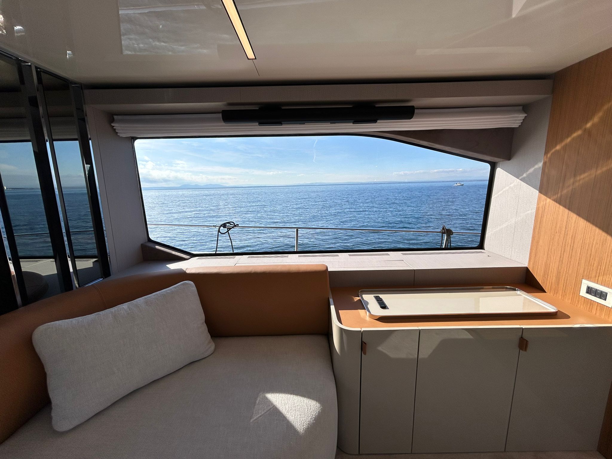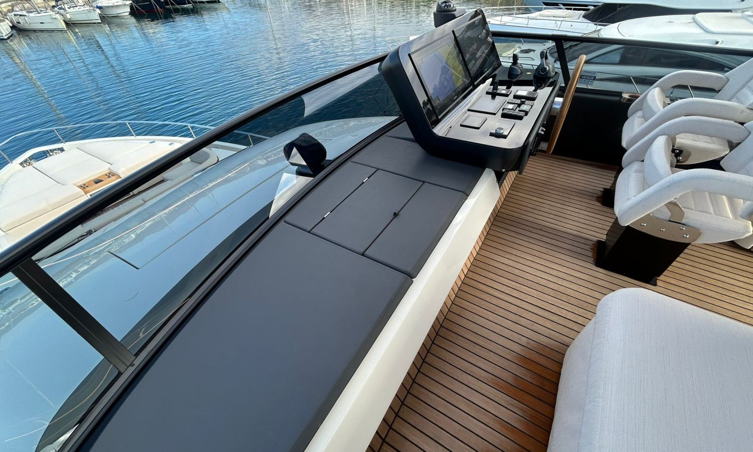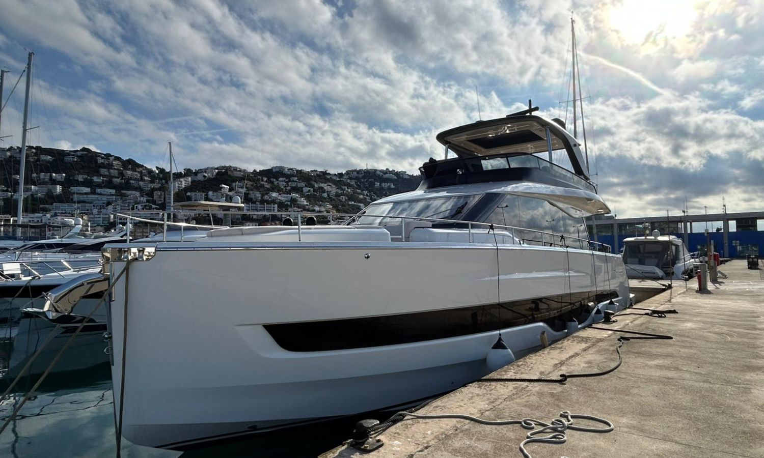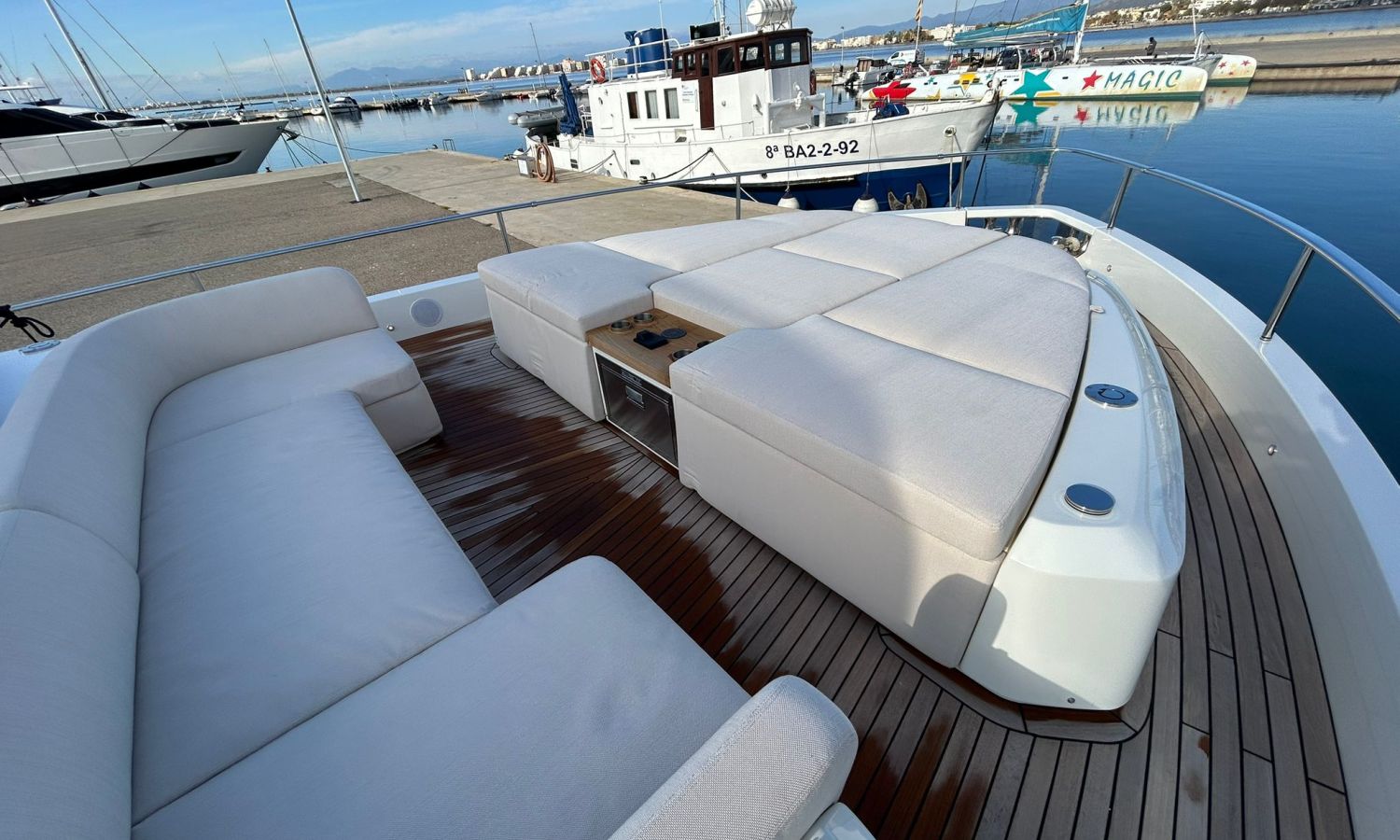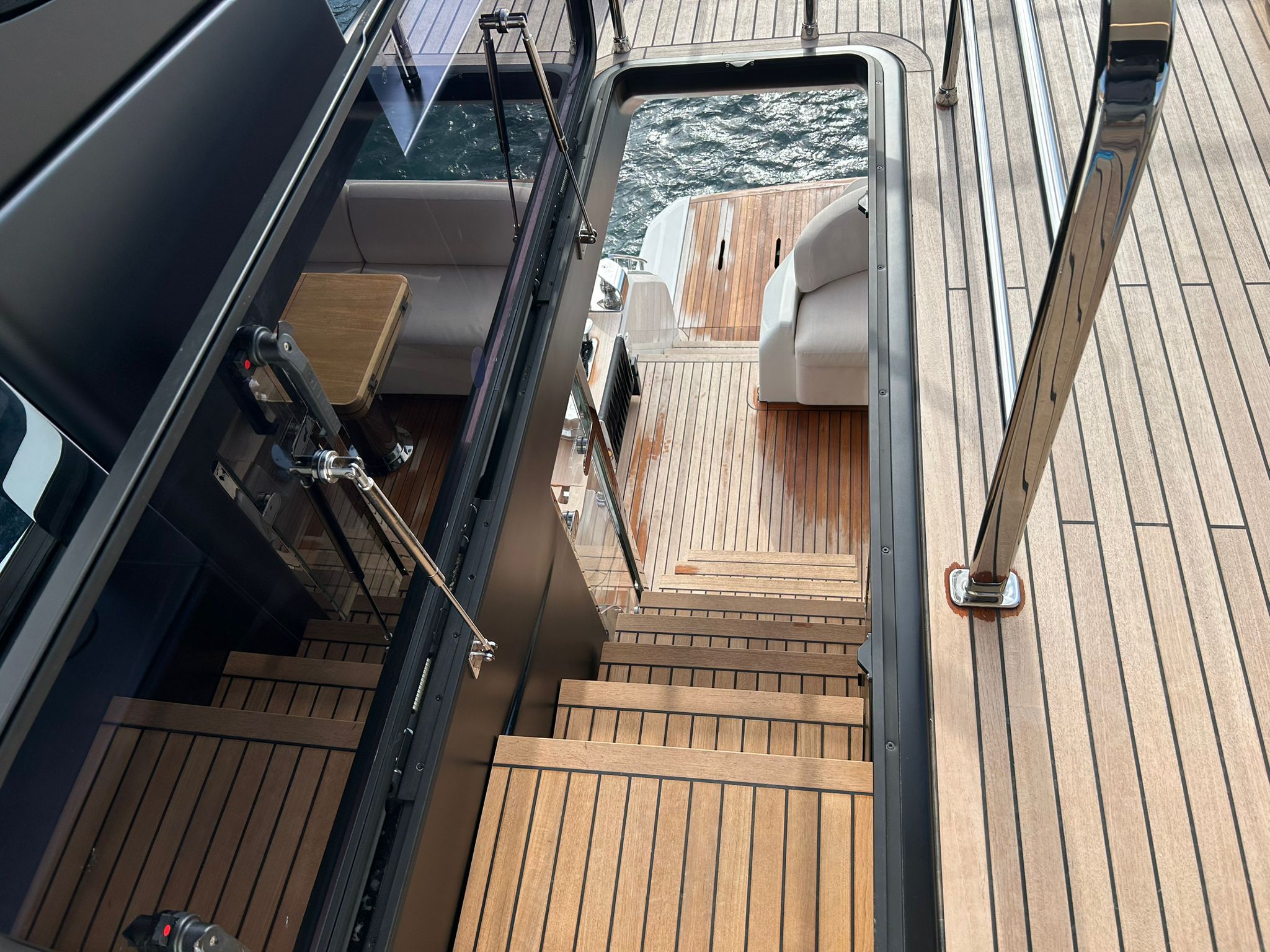 Ancla 60 Kg Ultramarine en acero inoxidable y cadena de acero inoxidable de 100 m - Enrolladores eléctricos cable línea de muelle de 20 m con mando a distancia - Zona de playa a popa: ducha con radio, luces y cargador inalámbrico para smartphone - Lino para 3 camarotes y cabina marinero: set de sábanas, fundas de almohadas, funda de colchón, colcha, toallas, etc. - Bidé en el baño de la cabina del armador - Bimini top de proa con palos de carbono - Cajafuerte electrónica en cabina armador - 6 cabos de amarre - Cobertura para dinette en bañera de popa - Coberturas flybridge - Desalinizadora 160 l/h con mando en cabina y sistema lavado con agua dulce - Hélice de proa proporcional - Faro pirata - Nevera en el sofá de la colchoneta de proa - Suplemento generador de 20,5 kW - Tercer puesto de mando en la bañera - Máquina de hielo con tanque de agua separado - Lavadora y secadora Miele - 7 Luces subacuáticas (3 a popa y 2 a cada lado) - Oscurantes para cristales de proa y laterales - Bimini top de popa vertical - Escotilla eléctrica en la timonería - Pasarela hidráulica telescópica retráctil - Fin Stabilizations System Humphree - Asiento interior copiloto - Puerta de acceso lateral a popa estribor - Puerta de acceso lateral a popa babor - Segunda pantalla plotter 22" en flybridge - Segunda pantalla plotter 22" en cubierta principal - Set de vajilla, vasos y cubiertos para 6 personas - Estabilizador giroscópico Seakeeper 9 - Surround view camera system Garmin - Superficie de teka en los trancaniles laterales proa/popa - Teka en el flybridge - Toldo de popa eléctrico en el flybridge - T-Top flybridge con láminas de apertura eléctrica - TV LED en salón con dispositivo eléctrico retráctil y sistema Home Theatre - TV 55" LED en cabina del armador y radio Bluetooth/USB - TV 43" LED en la cabina VIP y radio Bluetooth/USB - Certificado CE y declaración de conformidad - Transporte, montaje con varada y control general en el Cranchi Marine Test Centre en Venecia - Suplemento transporte T-Top - Decoración interior "Amalfi": combinación de colores de los muebles, suelos de madera, tejidos y mármoles - Pintura de la línea de belleza en el casco de color negro - T-Top lacado negro - 2 Cúpulas vacías para antena satélite TV6/60 cm.Descripción embarcación
