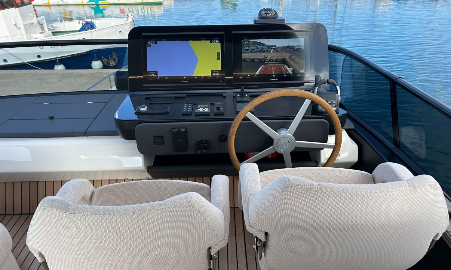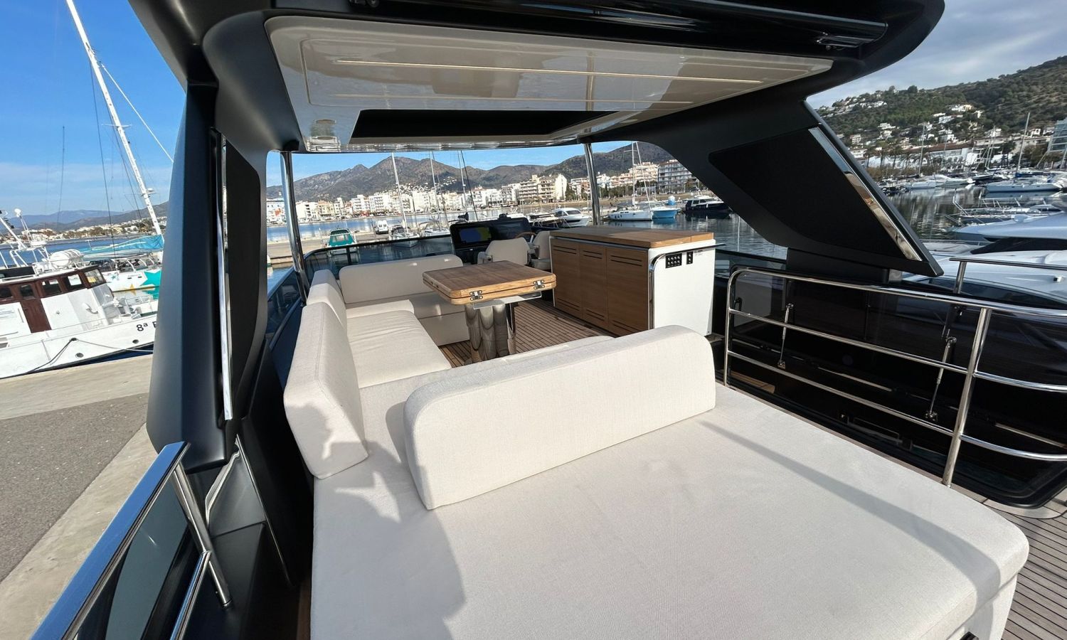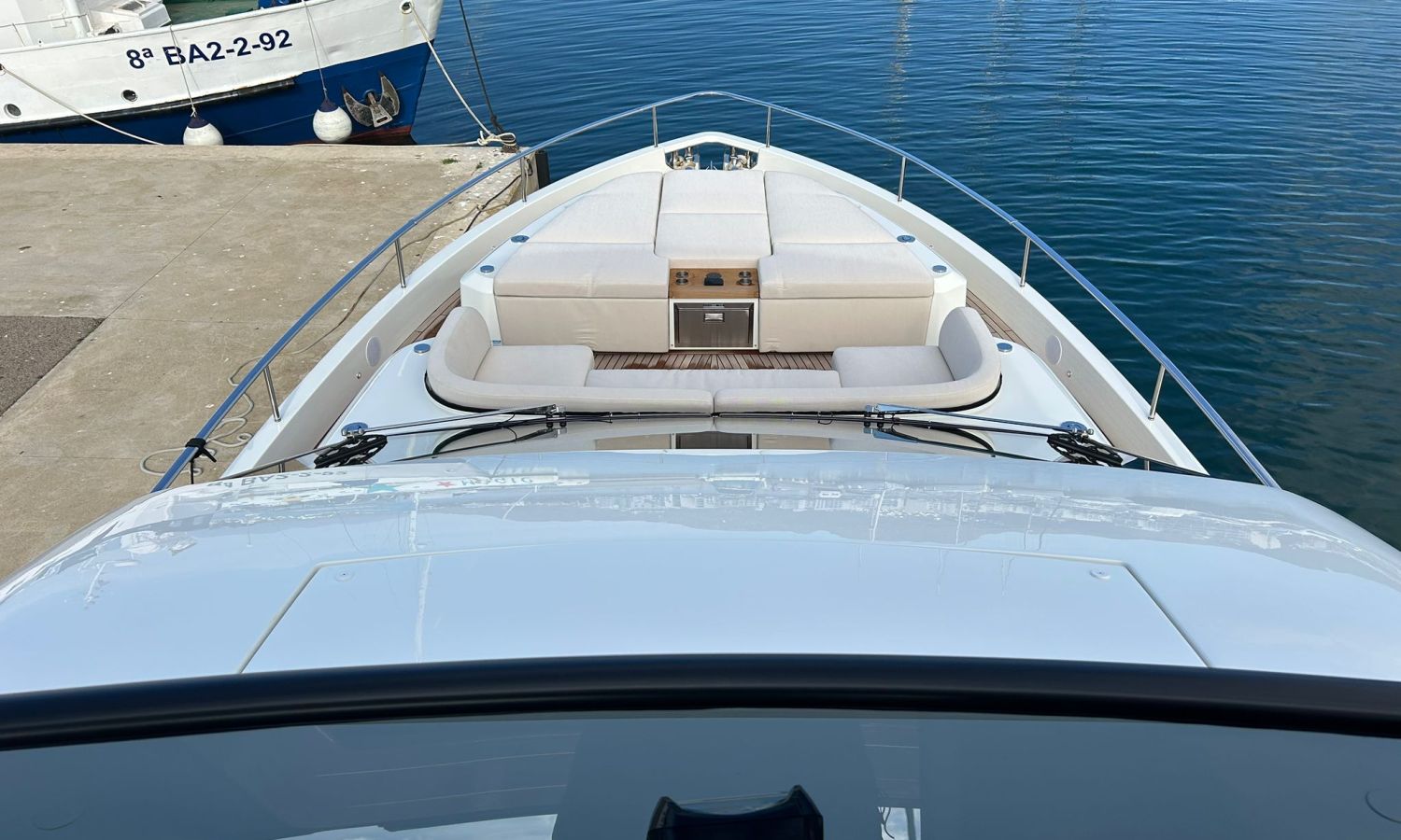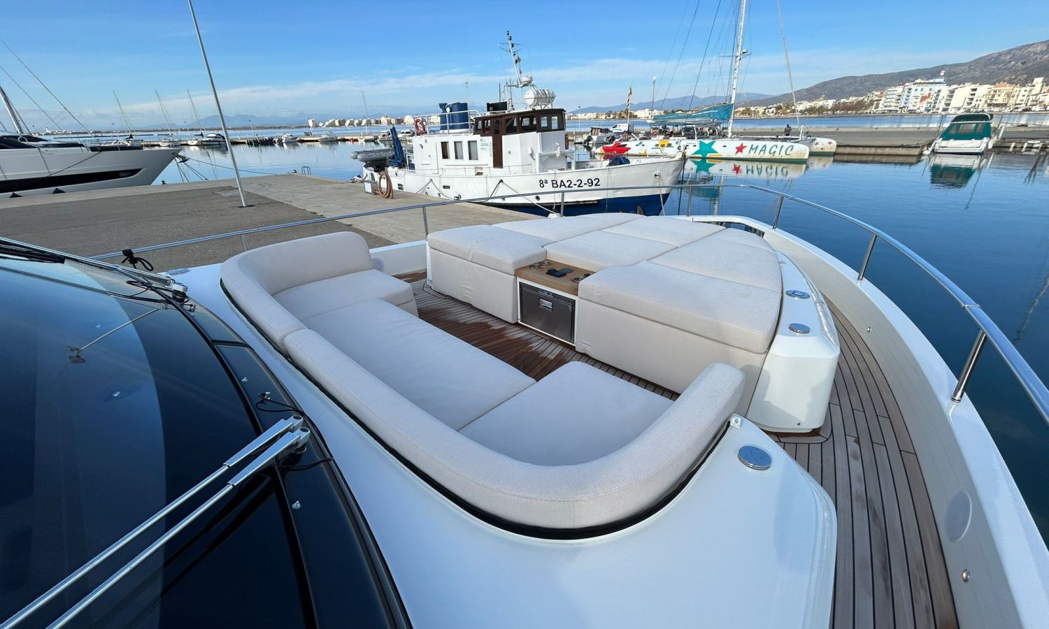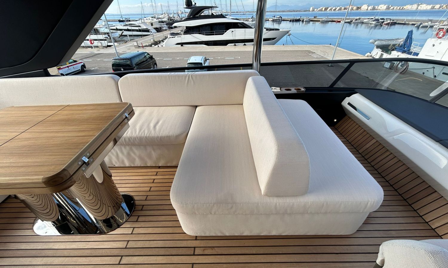 Ancla 60 Kg Ultramarine en acero inoxidable y cadena de acero inoxidable de 100 m - Enrolladores eléctricos cable línea de muelle de 20 m con mando a distancia - Zona de playa a popa: ducha con radio, luces y cargador inalámbrico para smartphone - Lino para 3 camarotes y cabina marinero: set de sábanas, fundas de almohadas, funda de colchón, colcha, toallas, etc. - Bidé en el baño de la cabina del armador - Bimini top de proa con palos de carbono - Cajafuerte electrónica en cabina armador - 6 cabos de amarre - Cobertura para dinette en bañera de popa - Coberturas flybridge - Desalinizadora 160 l/h con mando en cabina y sistema lavado con agua dulce - Hélice de proa proporcional - Faro pirata - Nevera en el sofá de la colchoneta de proa - Suplemento generador de 20,5 kW - Tercer puesto de mando en la bañera - Máquina de hielo con tanque de agua separado - Lavadora y secadora Miele - 7 Luces subacuáticas (3 a popa y 2 a cada lado) - Oscurantes para cristales de proa y laterales - Bimini top de popa vertical - Escotilla eléctrica en la timonería - Pasarela hidráulica telescópica retráctil - Fin Stabilizations System Humphree - Asiento interior copiloto - Puerta de acceso lateral a popa estribor - Puerta de acceso lateral a popa babor - Segunda pantalla plotter 22" en flybridge - Segunda pantalla plotter 22" en cubierta principal - Set de vajilla, vasos y cubiertos para 6 personas - Estabilizador giroscópico Seakeeper 9 - Surround view camera system Garmin - Superficie de teka en los trancaniles laterales proa/popa - Teka en el flybridge - Toldo de popa eléctrico en el flybridge - T-Top flybridge con láminas de apertura eléctrica - TV LED en salón con dispositivo eléctrico retráctil y sistema Home Theatre - TV 55" LED en cabina del armador y radio Bluetooth/USB - TV 43" LED en la cabina VIP y radio Bluetooth/USB - Certificado CE y declaración de conformidad - Transporte, montaje con varada y control general en el Cranchi Marine Test Centre en Venecia - Suplemento transporte T-Top - Decoración interior "Amalfi": combinación de colores de los muebles, suelos de madera, tejidos y mármoles - Pintura de la línea de belleza en el casco de color negro - T-Top lacado negro - 2 Cúpulas vacías para antena satélite TV6/60 cm.Descripción embarcación