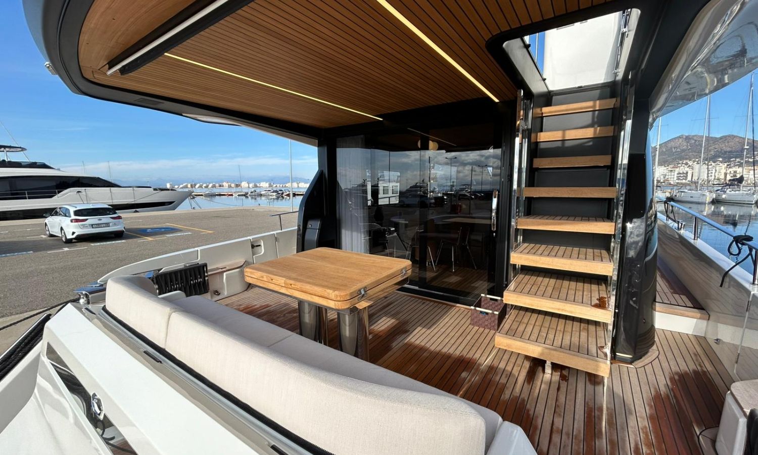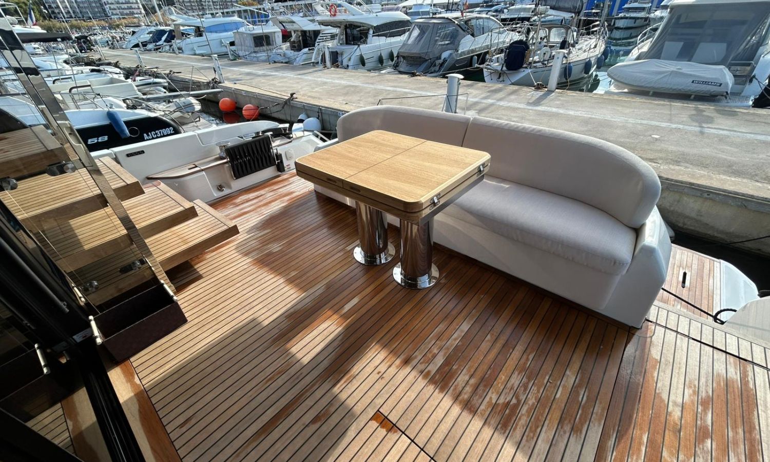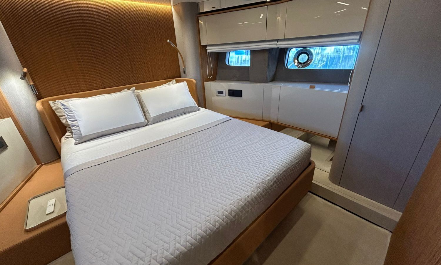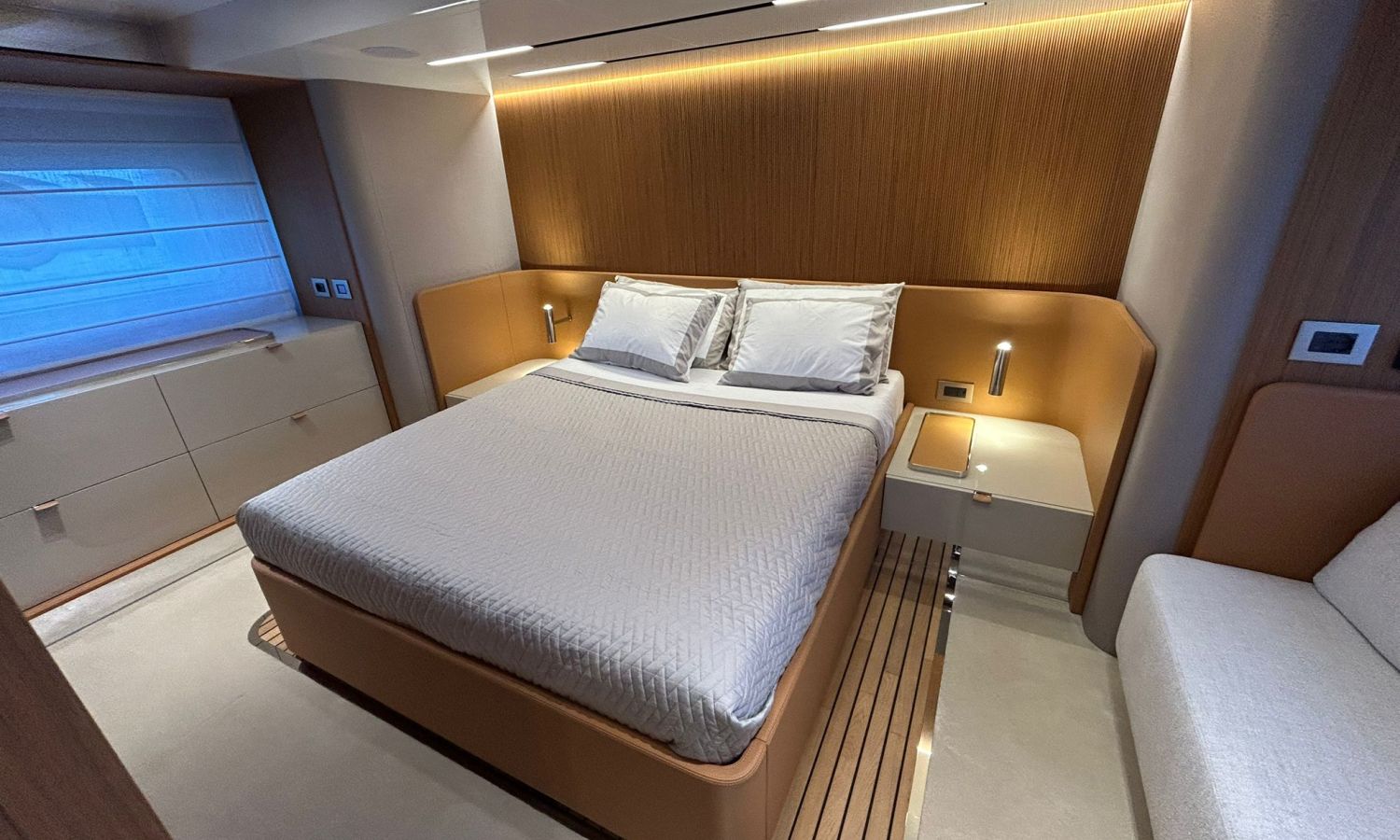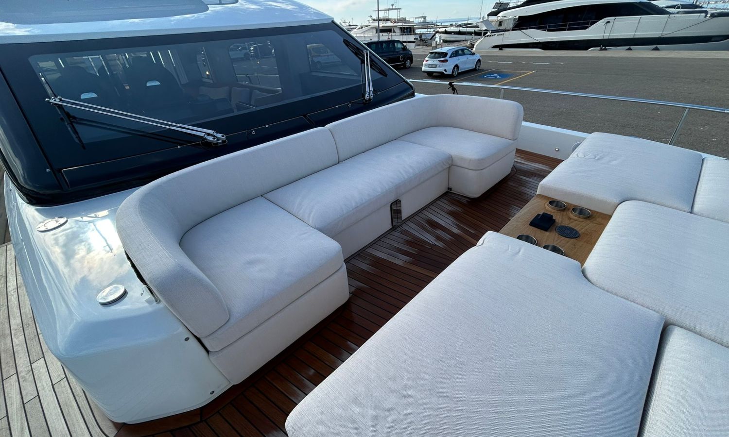 Ancla 60 Kg Ultramarine en acero inoxidable y cadena de acero inoxidable de 100 m - Enrolladores eléctricos cable línea de muelle de 20 m con mando a distancia - Zona de playa a popa: ducha con radio, luces y cargador inalámbrico para smartphone - Lino para 3 camarotes y cabina marinero: set de sábanas, fundas de almohadas, funda de colchón, colcha, toallas, etc. - Bidé en el baño de la cabina del armador - Bimini top de proa con palos de carbono - Cajafuerte electrónica en cabina armador - 6 cabos de amarre - Cobertura para dinette en bañera de popa - Coberturas flybridge - Desalinizadora 160 l/h con mando en cabina y sistema lavado con agua dulce - Hélice de proa proporcional - Faro pirata - Nevera en el sofá de la colchoneta de proa - Suplemento generador de 20,5 kW - Tercer puesto de mando en la bañera - Máquina de hielo con tanque de agua separado - Lavadora y secadora Miele - 7 Luces subacuáticas (3 a popa y 2 a cada lado) - Oscurantes para cristales de proa y laterales - Bimini top de popa vertical - Escotilla eléctrica en la timonería - Pasarela hidráulica telescópica retráctil - Fin Stabilizations System Humphree - Asiento interior copiloto - Puerta de acceso lateral a popa estribor - Puerta de acceso lateral a popa babor - Segunda pantalla plotter 22" en flybridge - Segunda pantalla plotter 22" en cubierta principal - Set de vajilla, vasos y cubiertos para 6 personas - Estabilizador giroscópico Seakeeper 9 - Surround view camera system Garmin - Superficie de teka en los trancaniles laterales proa/popa - Teka en el flybridge - Toldo de popa eléctrico en el flybridge - T-Top flybridge con láminas de apertura eléctrica - TV LED en salón con dispositivo eléctrico retráctil y sistema Home Theatre - TV 55" LED en cabina del armador y radio Bluetooth/USB - TV 43" LED en la cabina VIP y radio Bluetooth/USB - Certificado CE y declaración de conformidad - Transporte, montaje con varada y control general en el Cranchi Marine Test Centre en Venecia - Suplemento transporte T-Top - Decoración interior "Amalfi": combinación de colores de los muebles, suelos de madera, tejidos y mármoles - Pintura de la línea de belleza en el casco de color negro - T-Top lacado negro - 2 Cúpulas vacías para antena satélite TV6/60 cm.Descripción embarcación