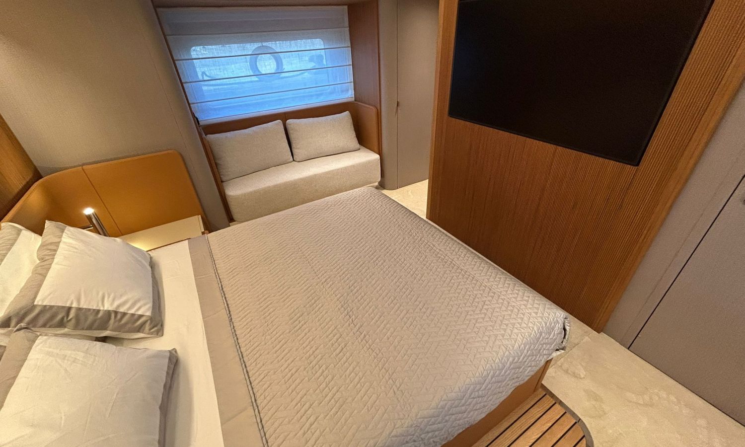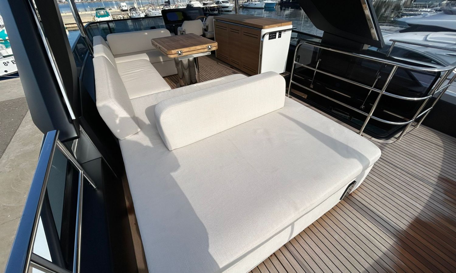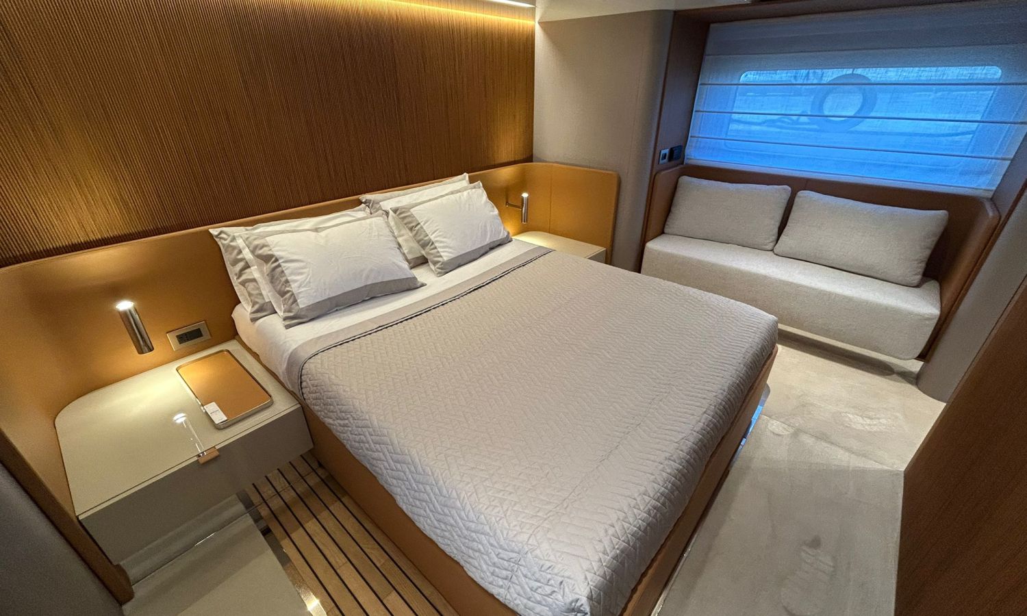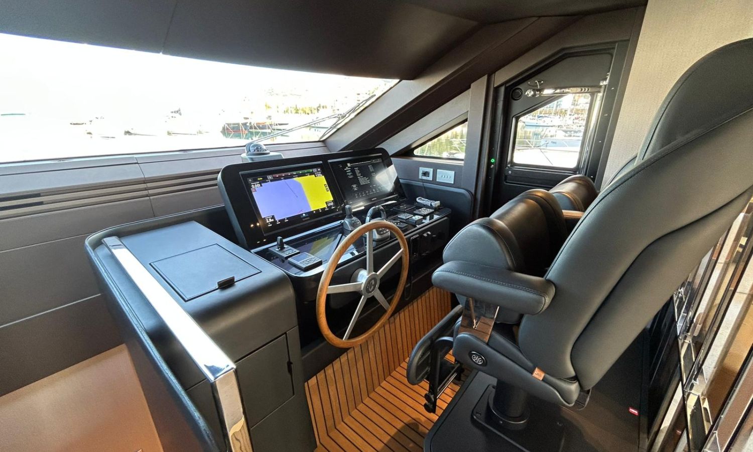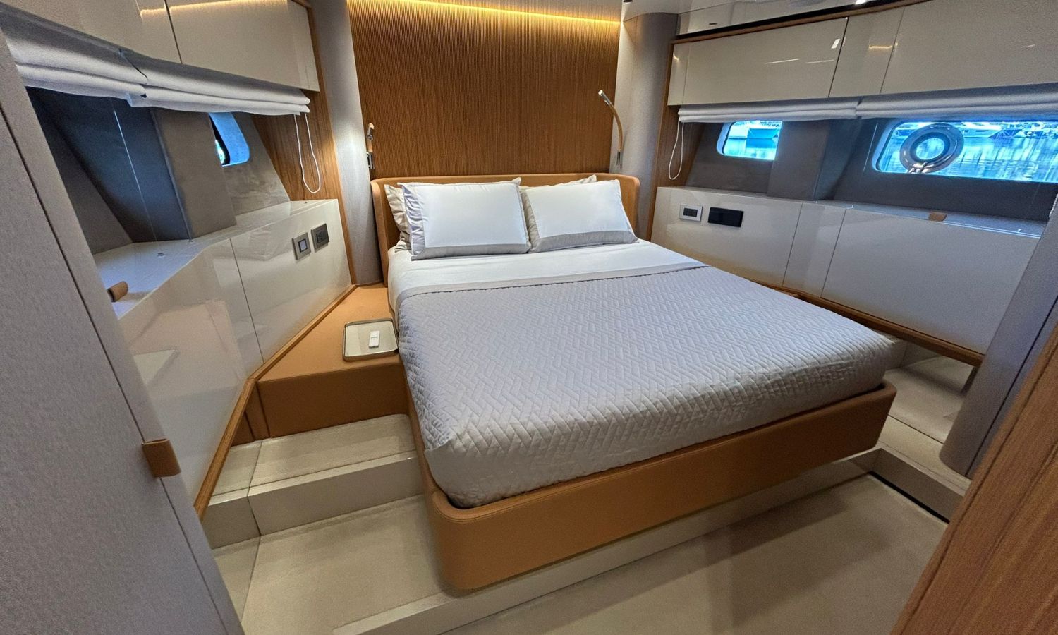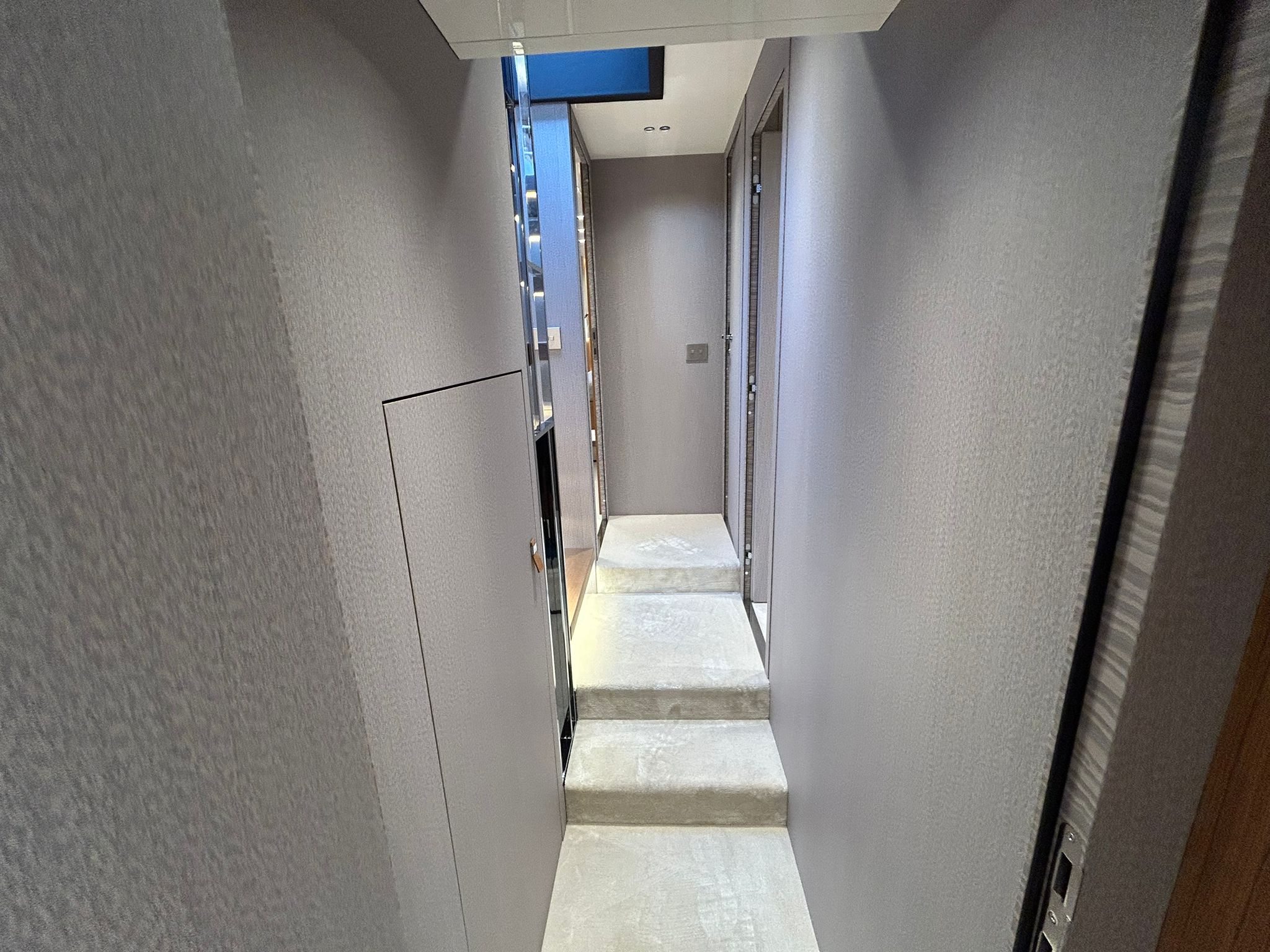 Ancla 60 Kg Ultramarine en acero inoxidable y cadena de acero inoxidable de 100 m - Enrolladores eléctricos cable línea de muelle de 20 m con mando a distancia - Zona de playa a popa: ducha con radio, luces y cargador inalámbrico para smartphone - Lino para 3 camarotes y cabina marinero: set de sábanas, fundas de almohadas, funda de colchón, colcha, toallas, etc. - Bidé en el baño de la cabina del armador - Bimini top de proa con palos de carbono - Cajafuerte electrónica en cabina armador - 6 cabos de amarre - Cobertura para dinette en bañera de popa - Coberturas flybridge - Desalinizadora 160 l/h con mando en cabina y sistema lavado con agua dulce - Hélice de proa proporcional - Faro pirata - Nevera en el sofá de la colchoneta de proa - Suplemento generador de 20,5 kW - Tercer puesto de mando en la bañera - Máquina de hielo con tanque de agua separado - Lavadora y secadora Miele - 7 Luces subacuáticas (3 a popa y 2 a cada lado) - Oscurantes para cristales de proa y laterales - Bimini top de popa vertical - Escotilla eléctrica en la timonería - Pasarela hidráulica telescópica retráctil - Fin Stabilizations System Humphree - Asiento interior copiloto - Puerta de acceso lateral a popa estribor - Puerta de acceso lateral a popa babor - Segunda pantalla plotter 22" en flybridge - Segunda pantalla plotter 22" en cubierta principal - Set de vajilla, vasos y cubiertos para 6 personas - Estabilizador giroscópico Seakeeper 9 - Surround view camera system Garmin - Superficie de teka en los trancaniles laterales proa/popa - Teka en el flybridge - Toldo de popa eléctrico en el flybridge - T-Top flybridge con láminas de apertura eléctrica - TV LED en salón con dispositivo eléctrico retráctil y sistema Home Theatre - TV 55" LED en cabina del armador y radio Bluetooth/USB - TV 43" LED en la cabina VIP y radio Bluetooth/USB - Certificado CE y declaración de conformidad - Transporte, montaje con varada y control general en el Cranchi Marine Test Centre en Venecia - Suplemento transporte T-Top - Decoración interior "Amalfi": combinación de colores de los muebles, suelos de madera, tejidos y mármoles - Pintura de la línea de belleza en el casco de color negro - T-Top lacado negro - 2 Cúpulas vacías para antena satélite TV6/60 cm.Descripción embarcación