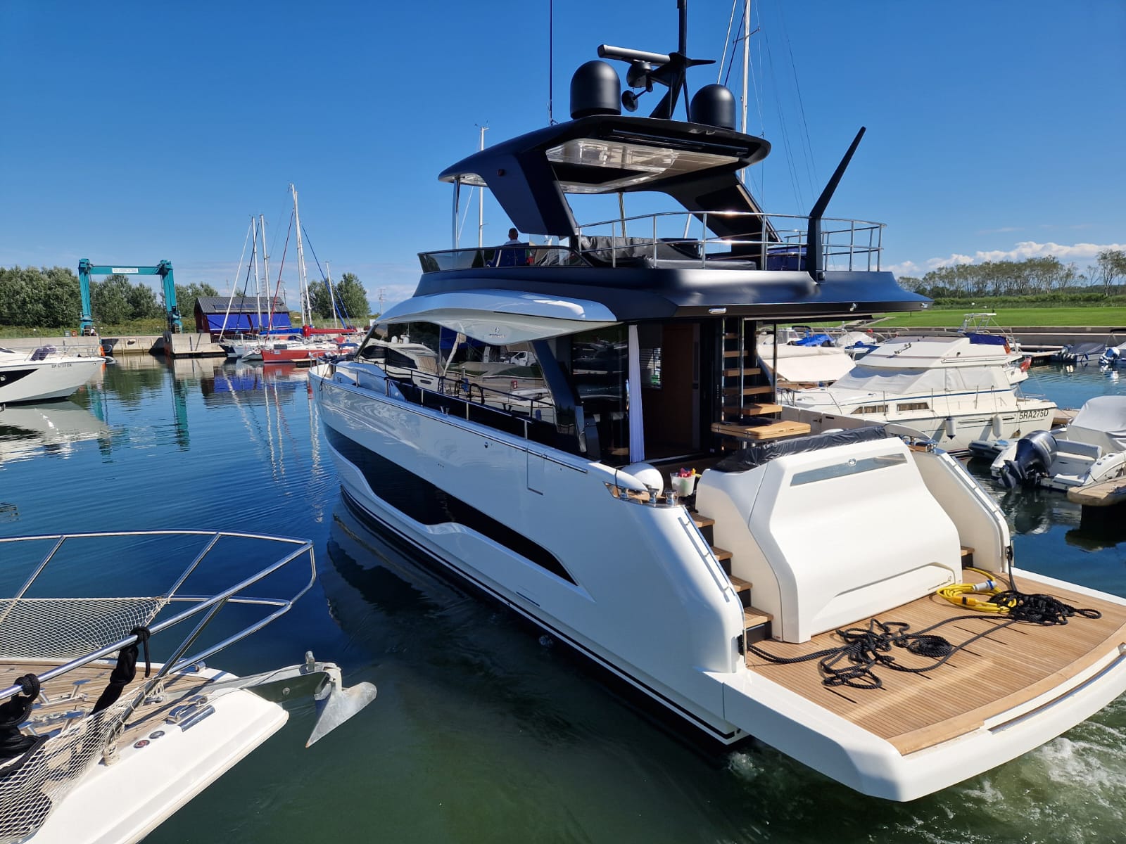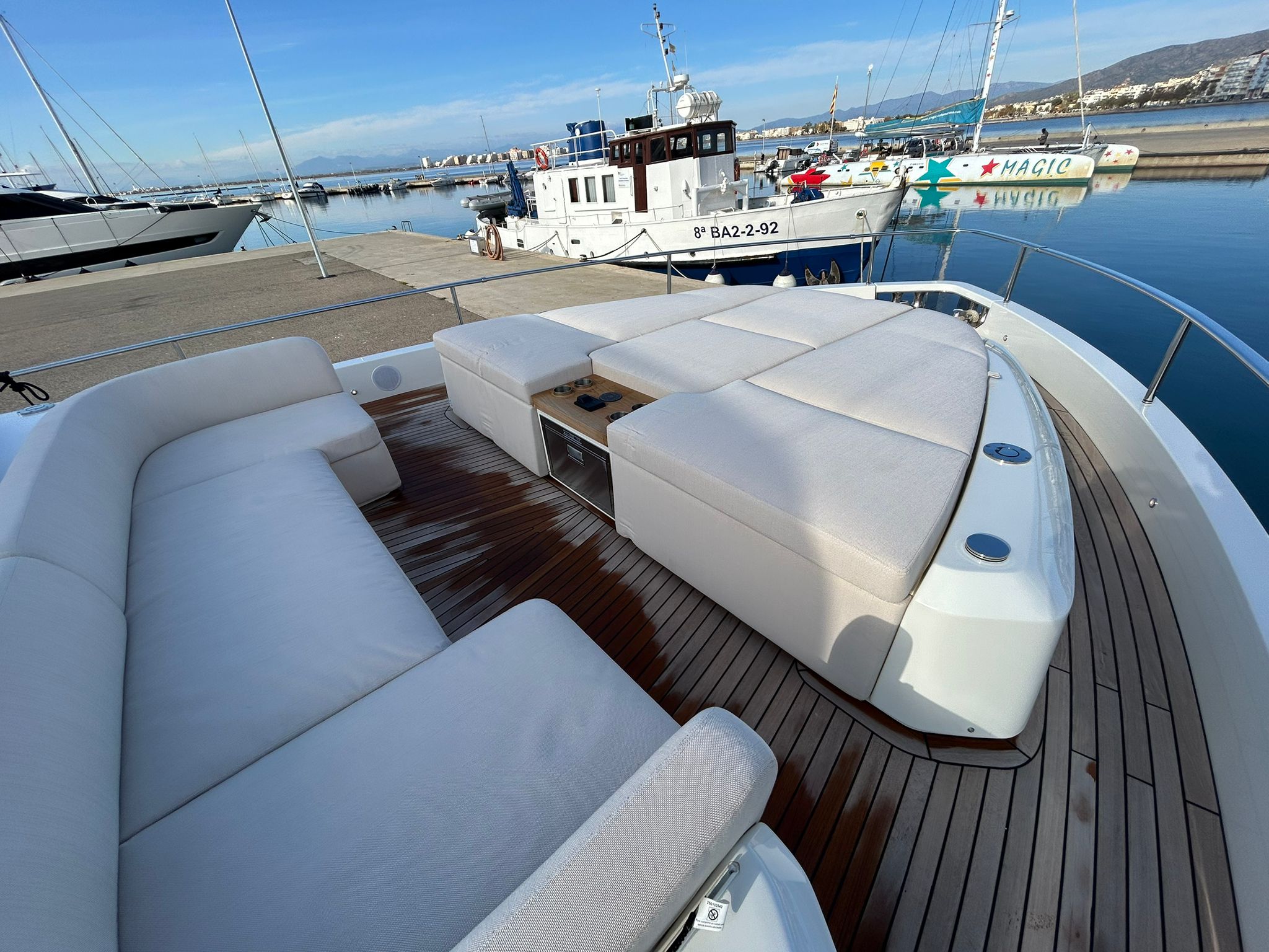 Embarcación en stock. Entrega inmediata. Modelo Sessantadue 62 del prestigioso astillero Cranchi. Eslora total de 20,23 m y casco de color blanco con T-Top negro. Dispone de una gran habitabilidad interior, amplio flybridge, garaje y cabina del marinero.AST-Nº 7956