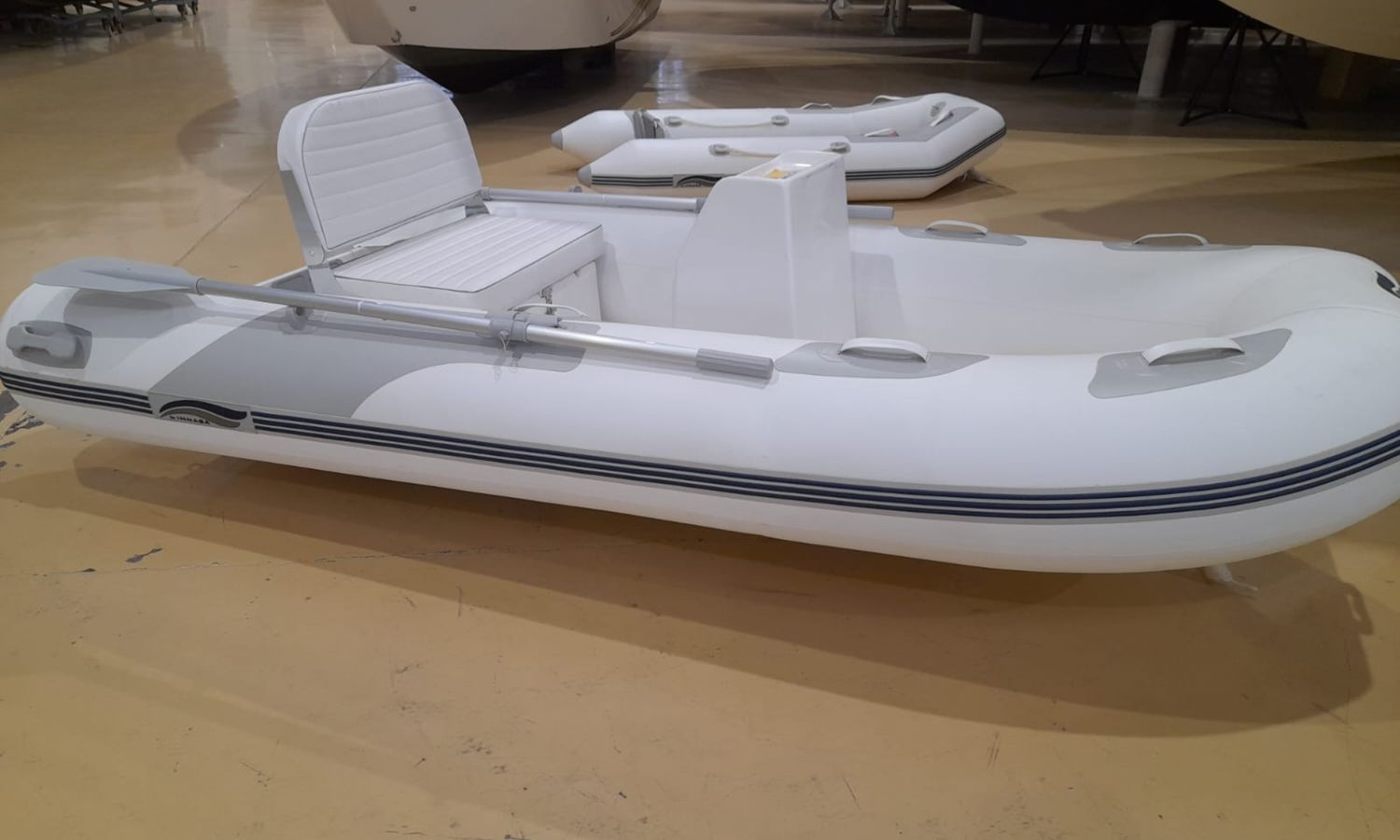 Casco carena en V - Piso antideslizante - Tejido PVC 1100 DECITEX - 3 compartimientos flotador - Consola con asiento lateral - Cofre en proa + cojín asiento - Asiento doble + cofre - 2 remos - Kit de reparación - Hinchador - Anilla de remolque.Descripción embarcación