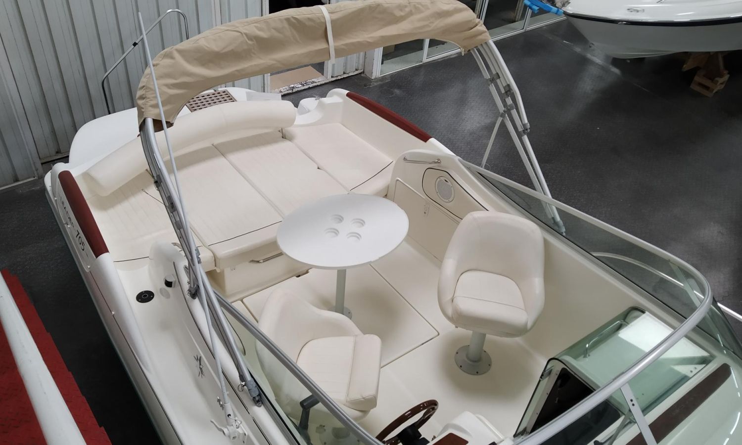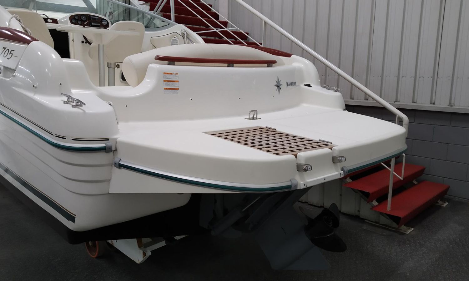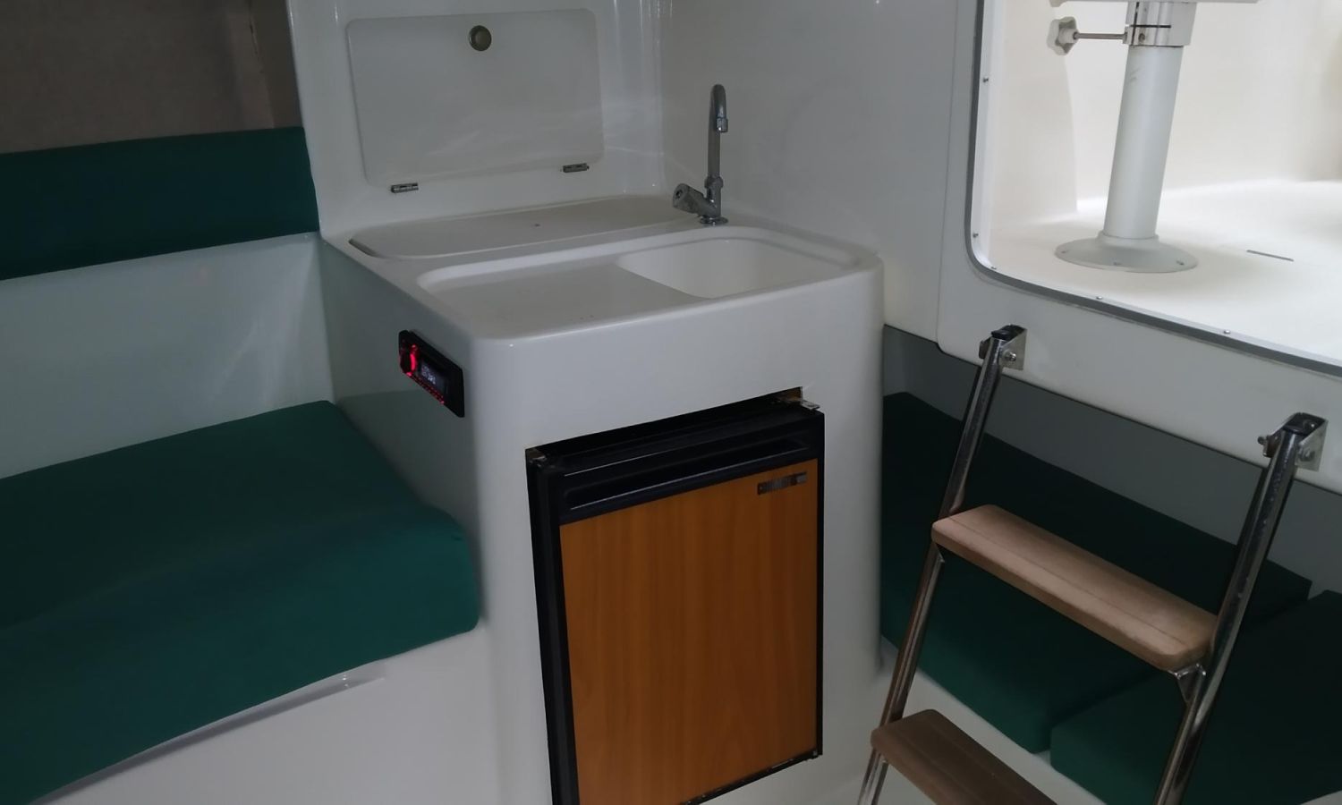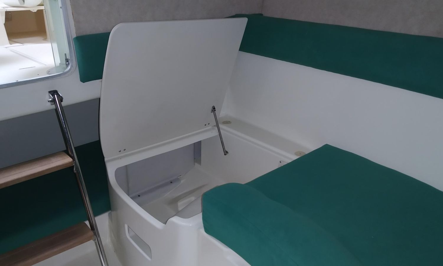 Ducha a popa - Toldo parasol - Molinete eléctrico con ancla y cadena - Radio - Mesa en bañera - Compás - Nevera eléctrica en cabina - Solárium popa - Plataforma de baño con escalera.Descripción embarcación