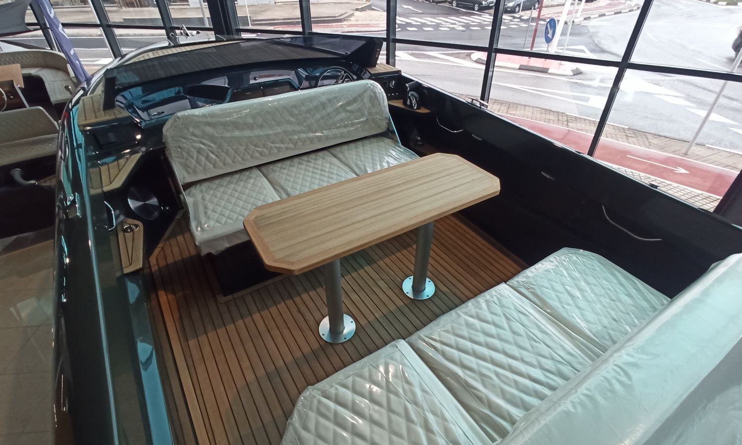 Casco color Black Olive (RAL 6015) - Tapicería Diamond Cream (BG 3151) - Molinete eléctrico + Kit de fondeo - 2 pantallas Raymarine 7" en cuadro de mandos con sistema domótica - Gancho de esquí - Ducha en popa - Luces de cortesia de Led en bañera - Defensas + soportes - Escalera de baño Premium - Refrigerador de luxe - Toldo de sol tipo Haima - Hélice de proa - Equipo de audio sonido B&O - Extintor automático - Teca en bañera y plataforma de baño - Transporte Astillero-Costa-Brava - Pintura Antifouling - Preparación, montaje, botadura y entrega con pruebas en el mar incluido.Descripción embarcación