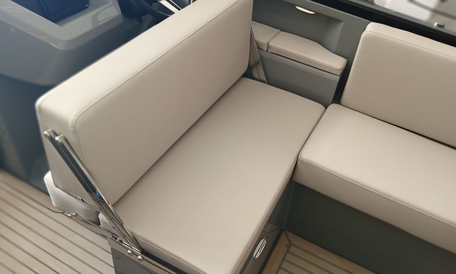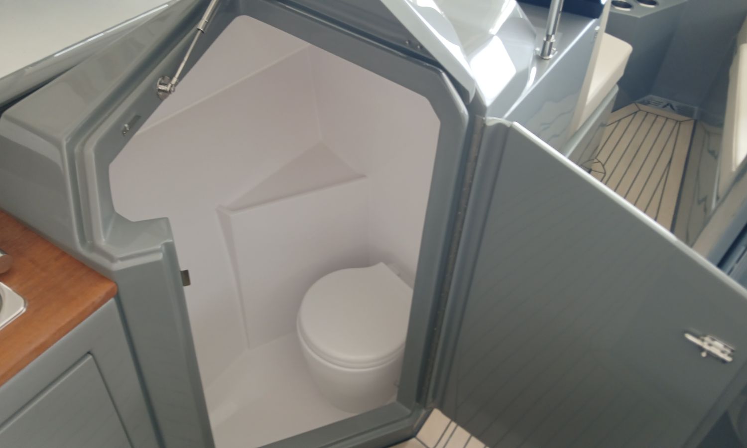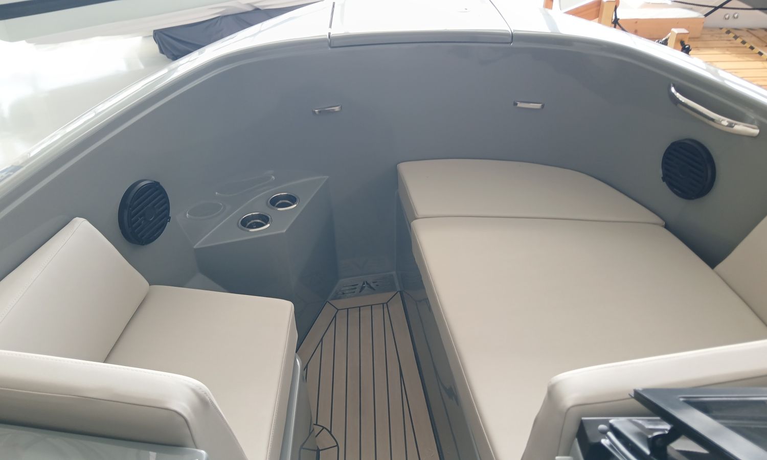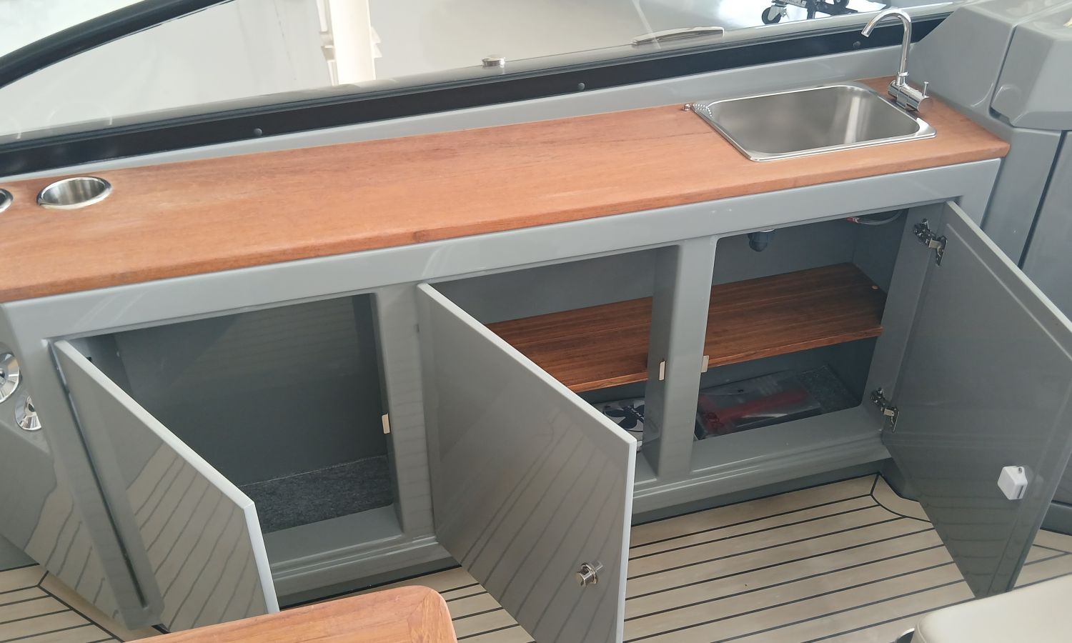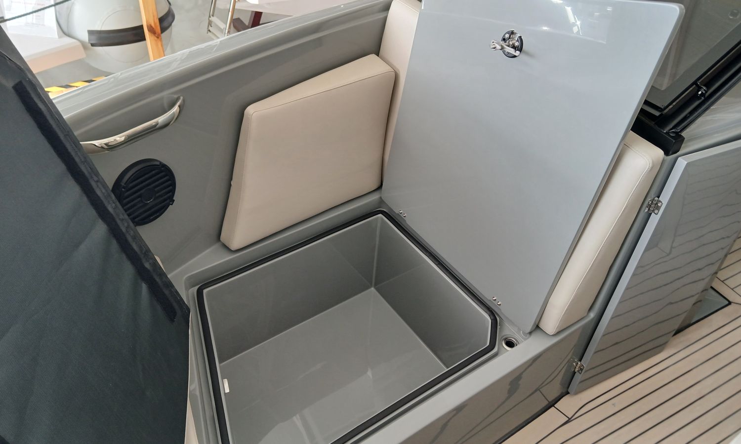 Casco color Grey Ski (RAL 7037) - Tapicería Silvertex Macadamia - Bordon defensa color gris - Mueble de cocina a babor con fregadero y grifo - Sistema de agua a presión con ducha en bañera y WC marino eléctrico con depósito de aguas negras - Hélice de proa - Equipo de audio sistema Premium B&O - Paquete de iluminación Led premium - Molinete eléctrico + Kit de fondeo - Defensas + soportes - Ducha en popa - Refrigerador de luxe - Escalera de baño Premium - Flaps automáticos Zipwake - Lona de fondeo - Toma de puerto + Cargador de baterías - Transporte Astillero-Costa-Brava - Pintura Antifouling - Preparación, montaje, botadura y entrega con pruebas en el mar incluido..Descripción embarcación