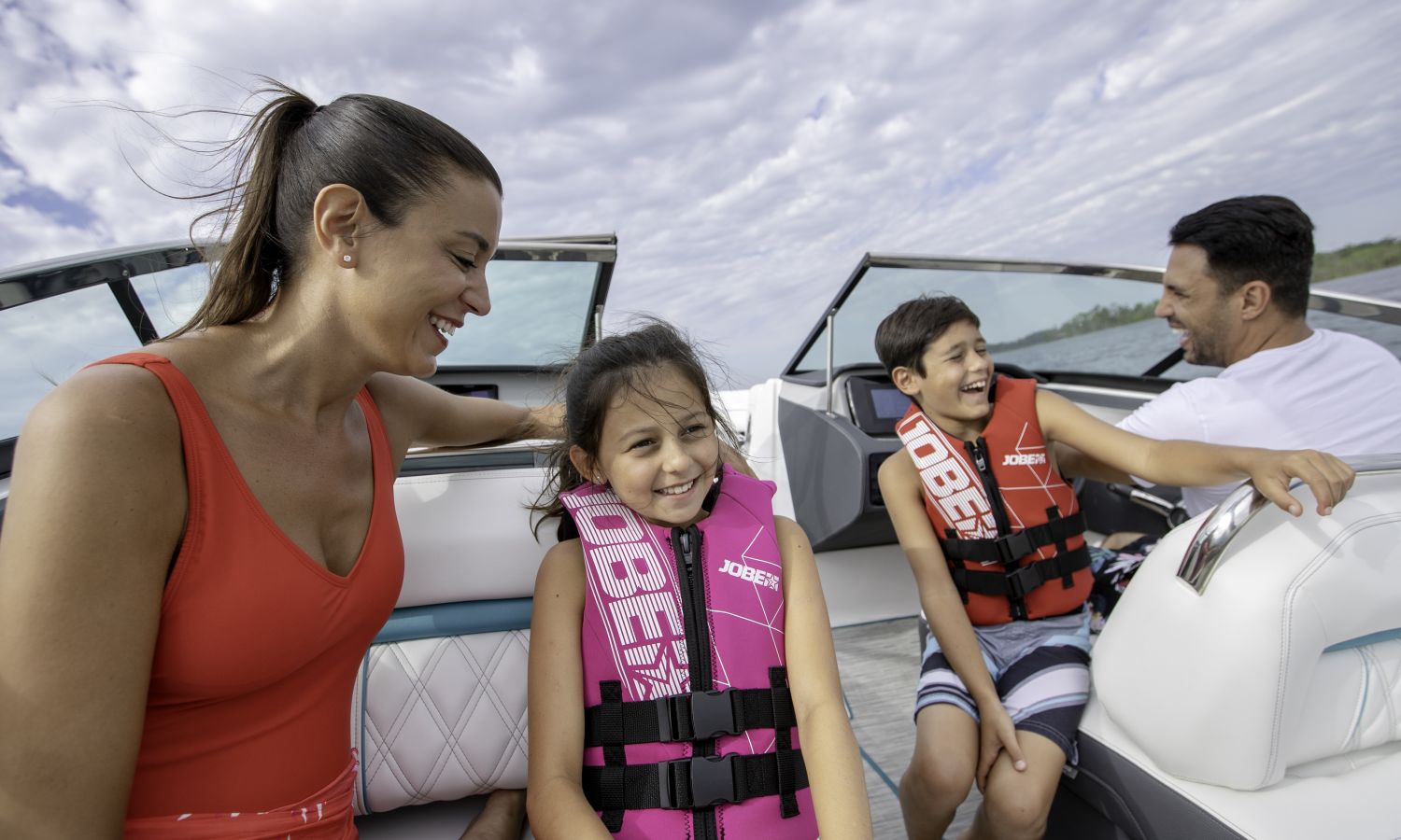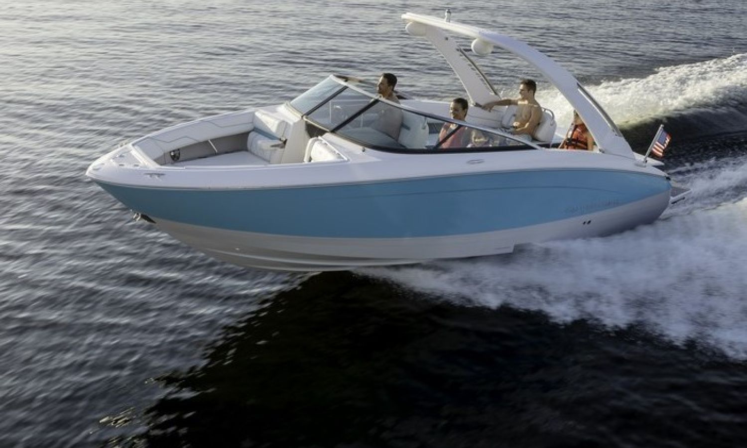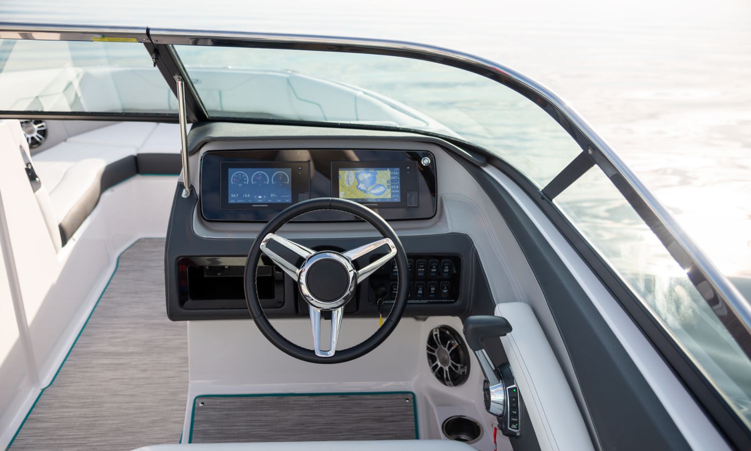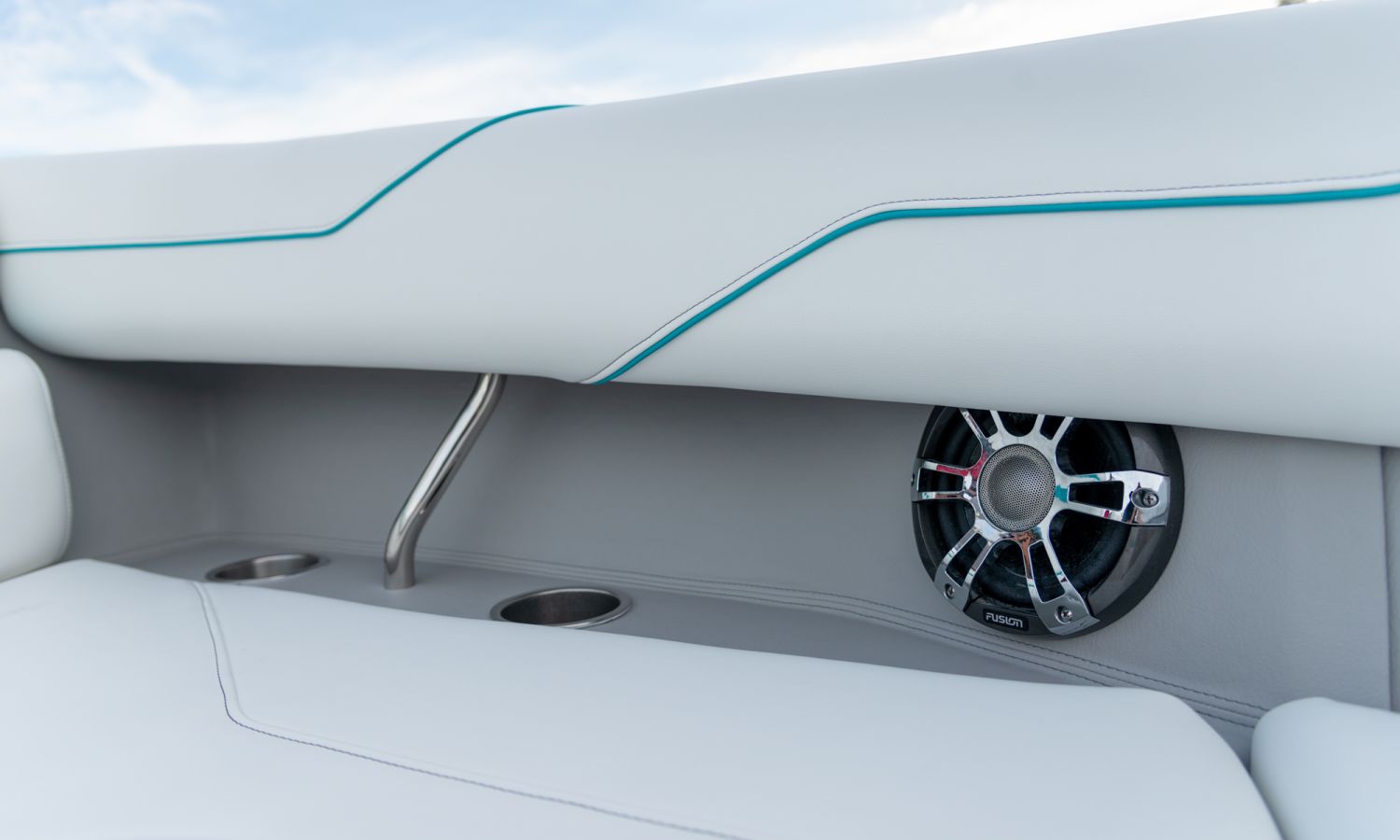 Casco diseño FasTrack. Más velocidad y menos consumo. El amplio solárium de popa se complementa con un cojín que al levantarlo crea un cómodo pasillo de acceso a la bañera. Provista de múltiples asientos como el sofá de 3 plazas, el asiento individual para el piloto y el amplio asiento del acompañante convertible en diván o los de proa en forma de V y convertibles en solárium, el toldo parasol y el equipo de sonido, hacen que la bañera de esta embarcación proporcione el confort necesario para disfrutar del mar.
