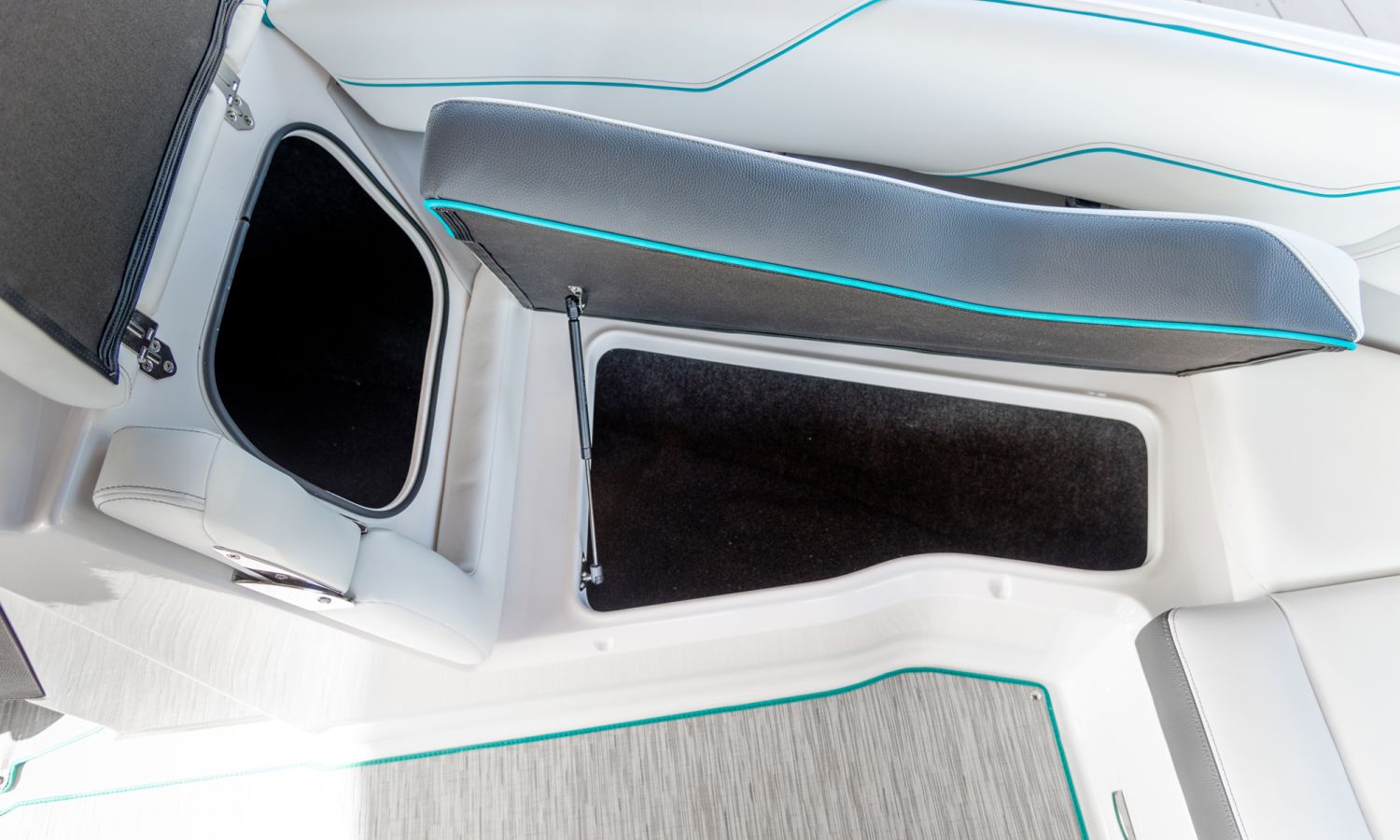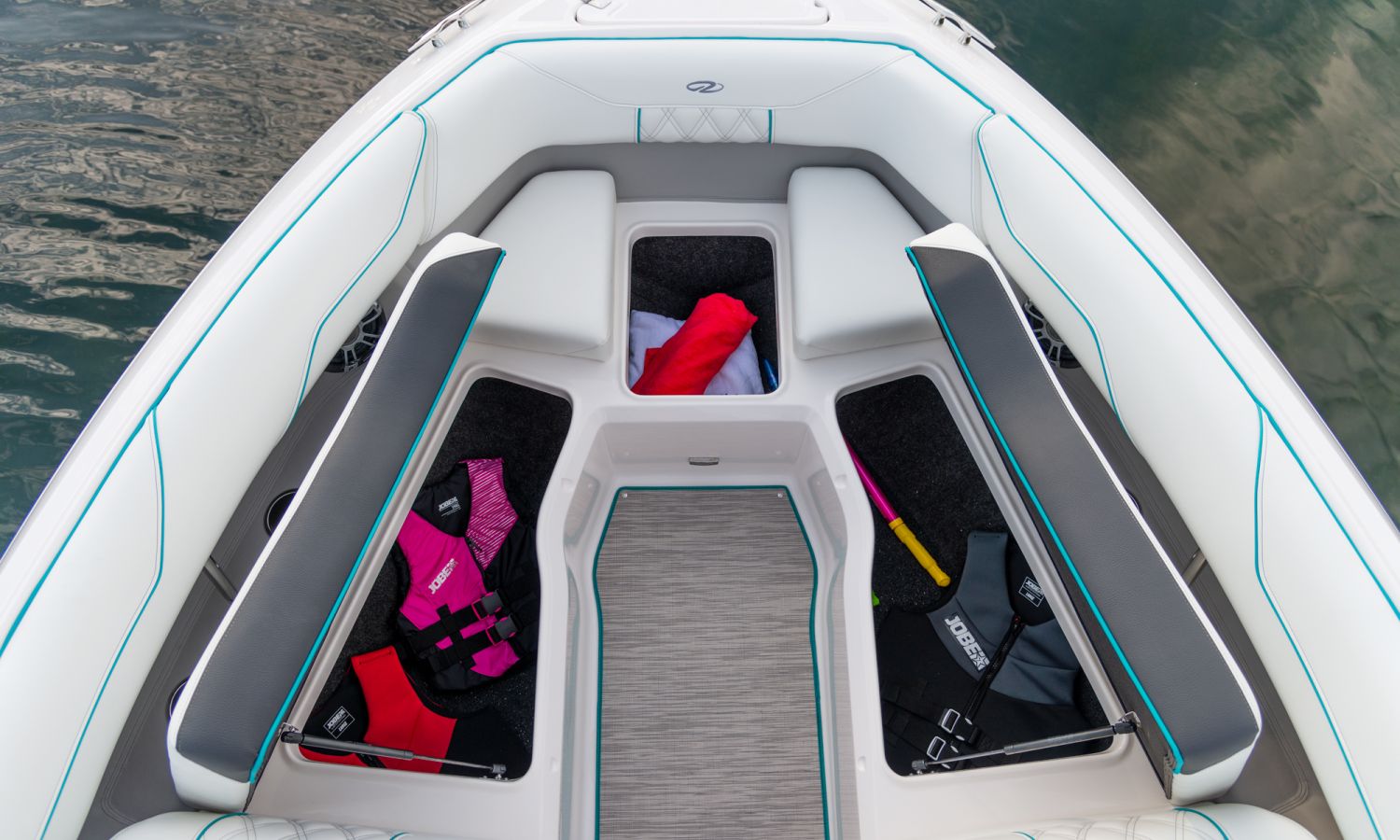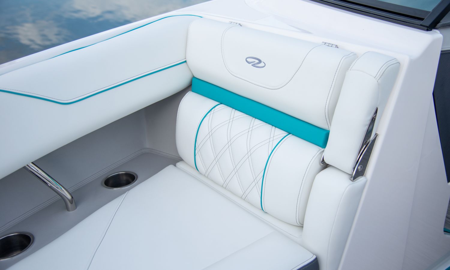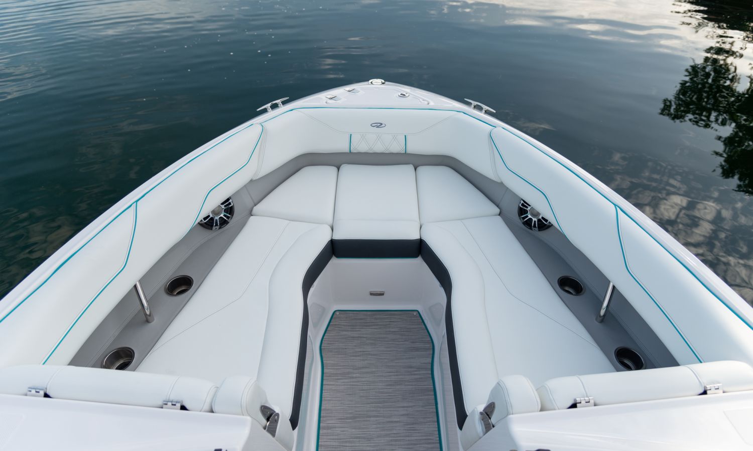 Casco diseño FasTrack. Más velocidad y menos consumo. El amplio solárium de popa se complementa con un cojín que al levantarlo crea un cómodo pasillo de acceso a la bañera. Provista de múltiples asientos como el sofá de 3 plazas, el asiento individual para el piloto y el amplio asiento del acompañante convertible en diván o los de proa en forma de V y convertibles en solárium, el toldo parasol y el equipo de sonido, hacen que la bañera de esta embarcación proporcione el confort necesario para disfrutar del mar.