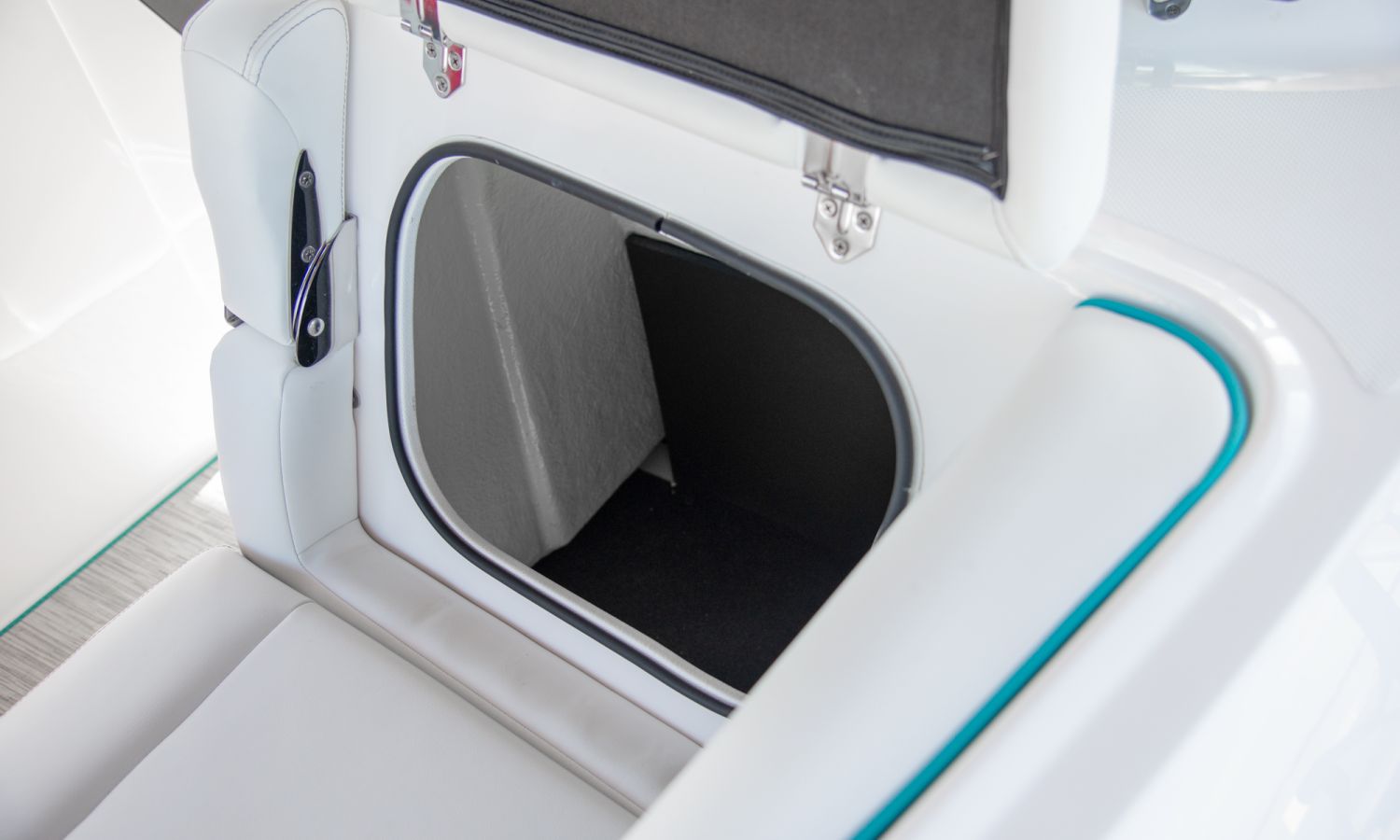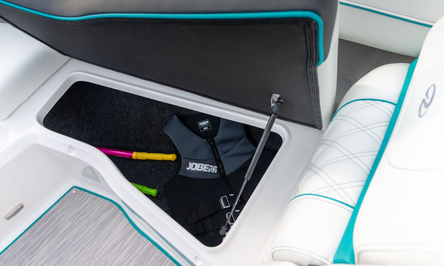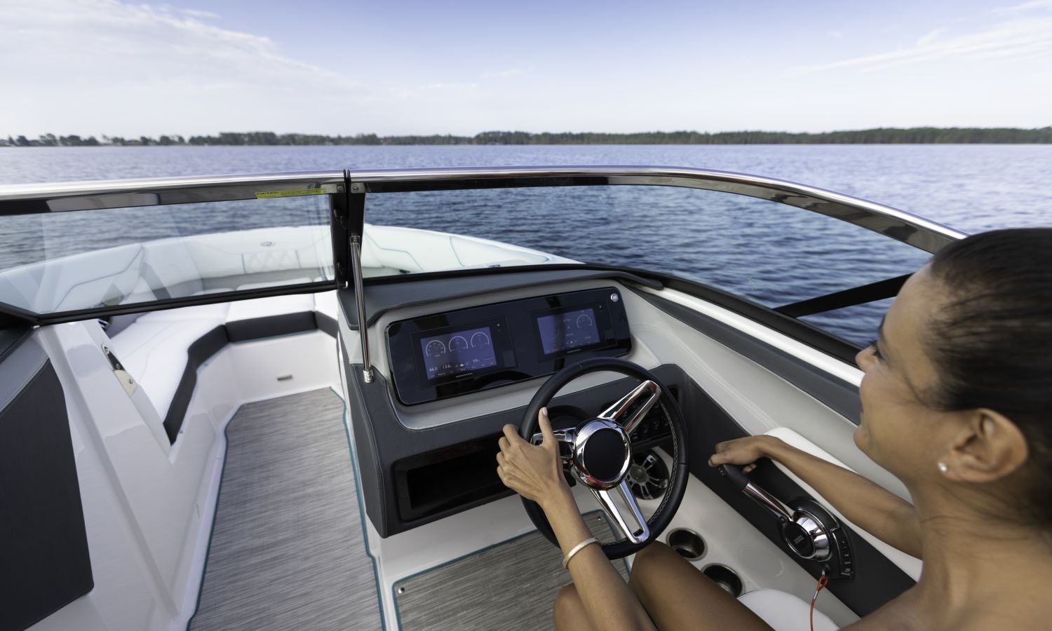 Casco diseño FasTrack. Más velocidad y menos consumo. El amplio solárium de popa se complementa con un cojín que al levantarlo crea un cómodo pasillo de acceso a la bañera. Provista de múltiples asientos como el sofá de 3 plazas, el asiento individual para el piloto y el amplio asiento del acompañante convertible en diván o los de proa en forma de V y convertibles en solárium, el toldo parasol y el equipo de sonido, hacen que la bañera de esta embarcación proporcione el confort necesario para disfrutar del mar.