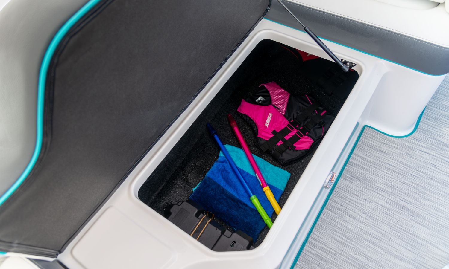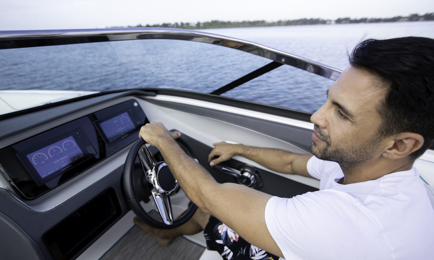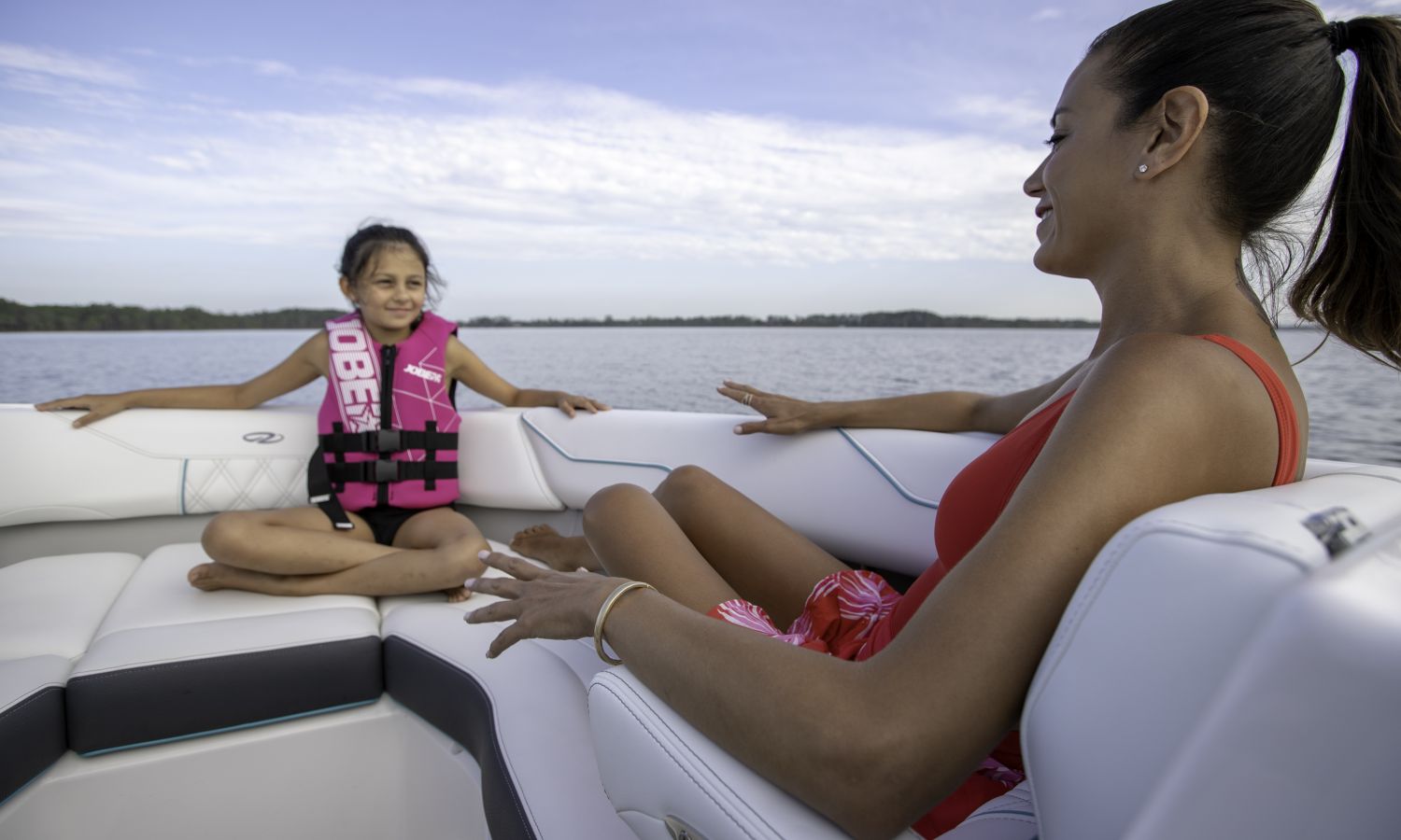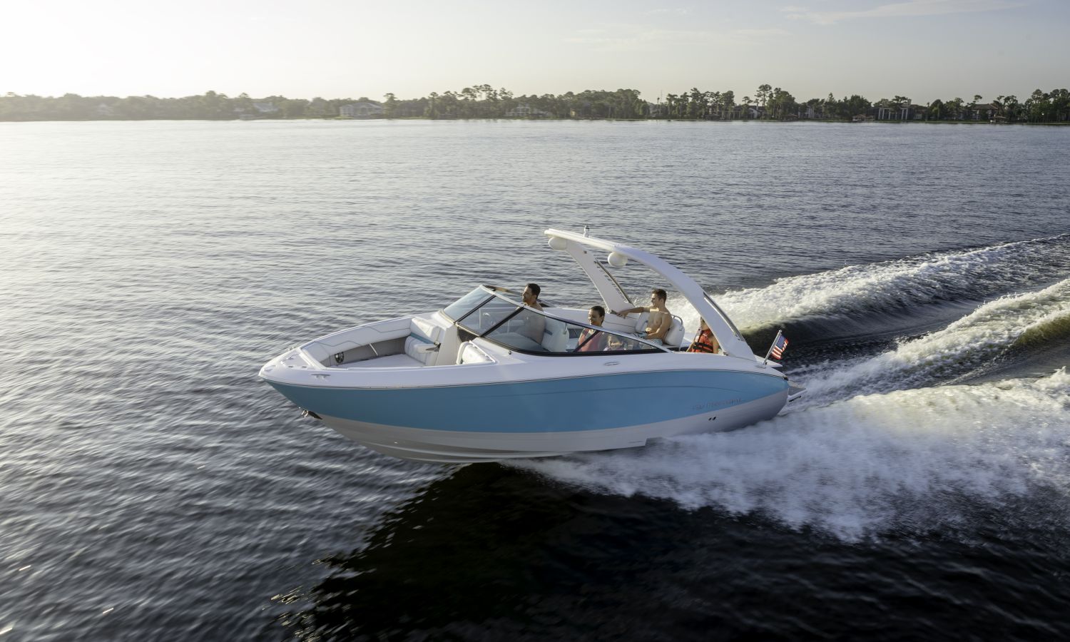 Casco diseño FasTrack. Más velocidad y menos consumo. El amplio solárium de popa se complementa con un cojín que al levantarlo crea un cómodo pasillo de acceso a la bañera. Provista de múltiples asientos como el sofá de 3 plazas, el asiento individual para el piloto y el amplio asiento del acompañante convertible en diván o los de proa en forma de V y convertibles en solárium, el toldo parasol y el equipo de sonido, hacen que la bañera de esta embarcación proporcione el confort necesario para disfrutar del mar.