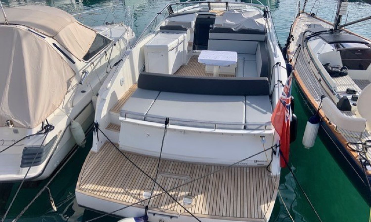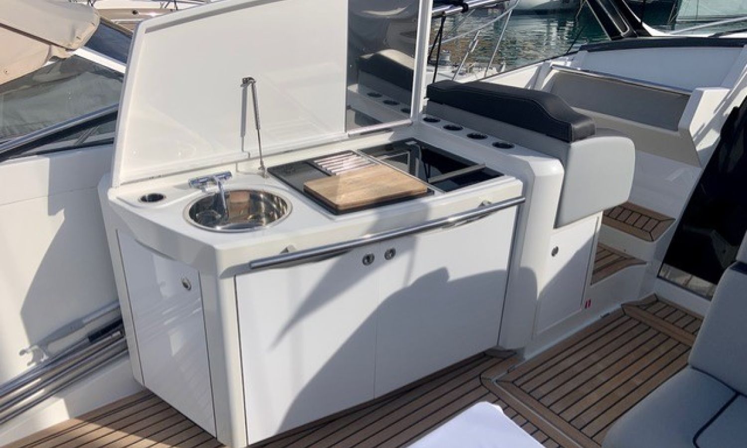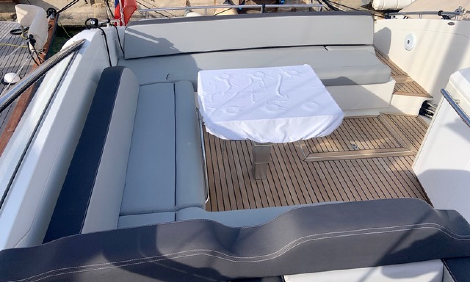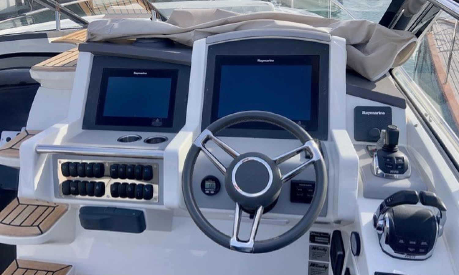 Toldo bimini - Garaje en popa - Generador - Aire acondicionado - Teka - Mesa bañera eléctrica - Nevera interior y exterior - Placa inducción - Tapiceria exterior nueva 2022 - Colchonetas solárium proa-popa - Toma de puerto 220 V. - Cargador de baterias - Mandos electrónicos - Gps/Plotter/Sonda - VHF - Hélice de proa - Joystick - Equipo audioDescripción embarcación