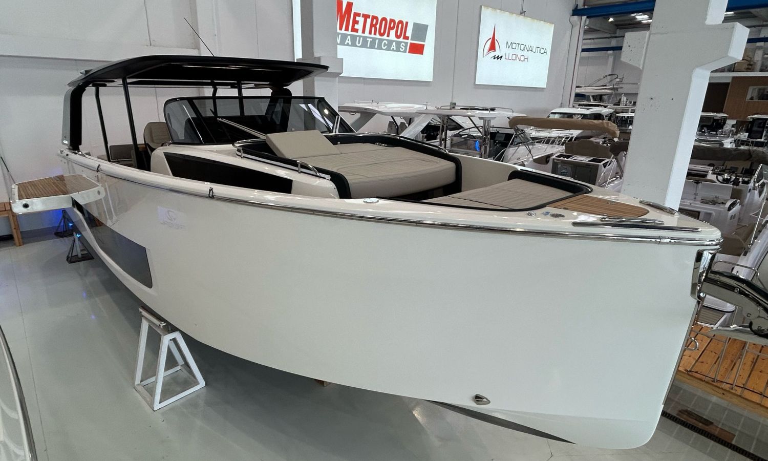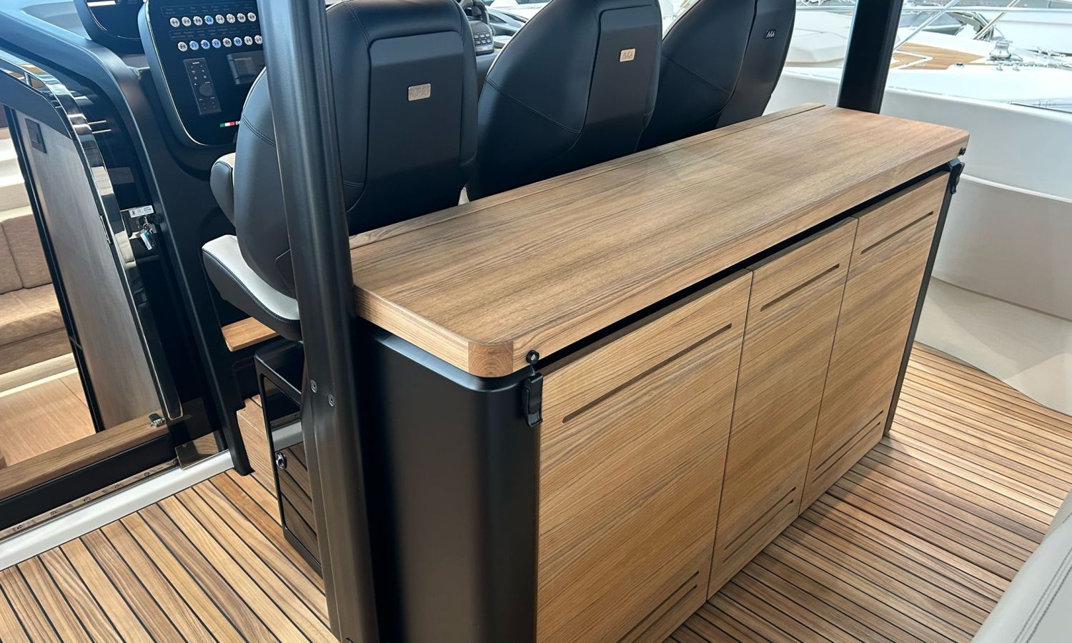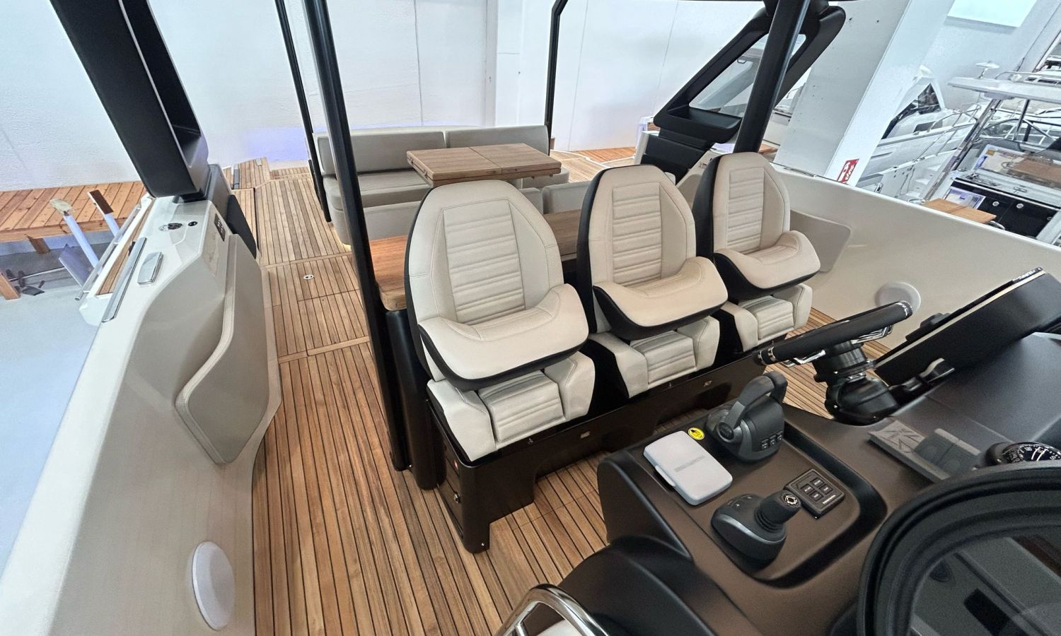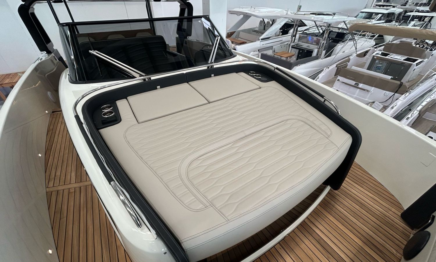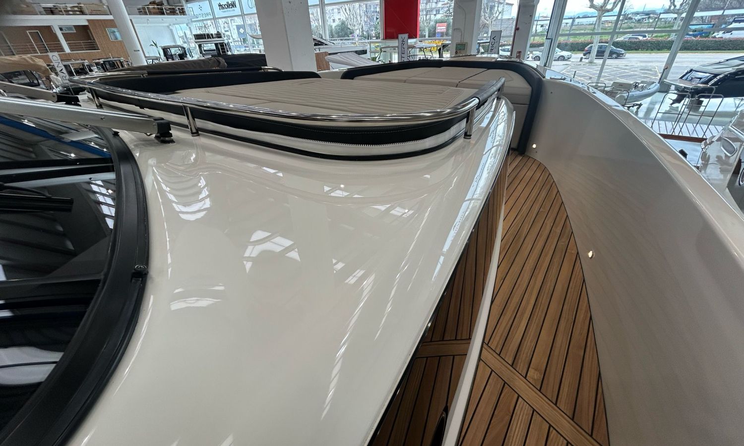 Réservoir d'eaux sales - Climatisation 16.000 BTU dans la cabine avec pompe à chaleur - Set couvertures (pour tableau de bord, siège pilote, sofa, table, meubles et coussin bain de soleil à l'arrière) - Correcteurs d'assiette Automatic List + correcteurs de virée Coordinated Turn Control - Propulseur d'étrave - Réfrigérateur dans le cockpit - Générateur 8 kW - Barbecue électrique dans le cockpit - Ice-maker - Côtés repliables à l'arrière droite et gauche - Passerelle hydraulique - Pilote automatique - Plateforme hydraulique montée/descente - Cockpit et parois latérales pliantes en teck - Teck sur les passes-avant - T-Top - VHF - Certificat CE - T-Top laqué - Pré-disposition pour Seakeeper 6 - Préparation, lancement et livraison avec test en mer - Transport chantier naval à Costa Brava.Description du bateau